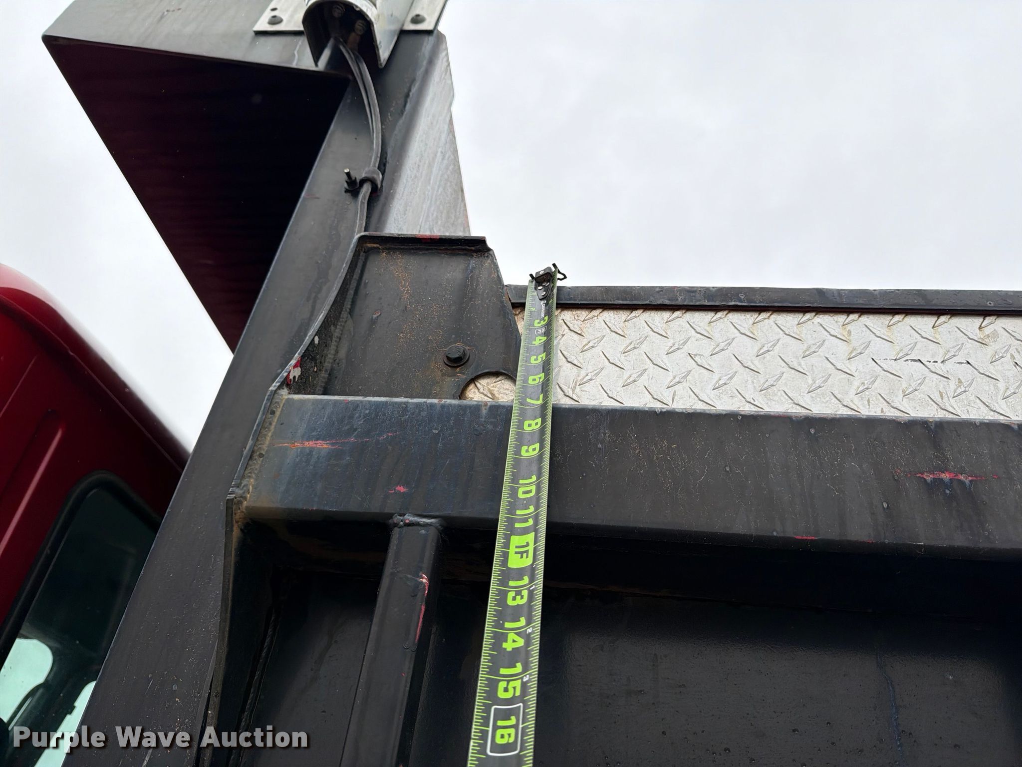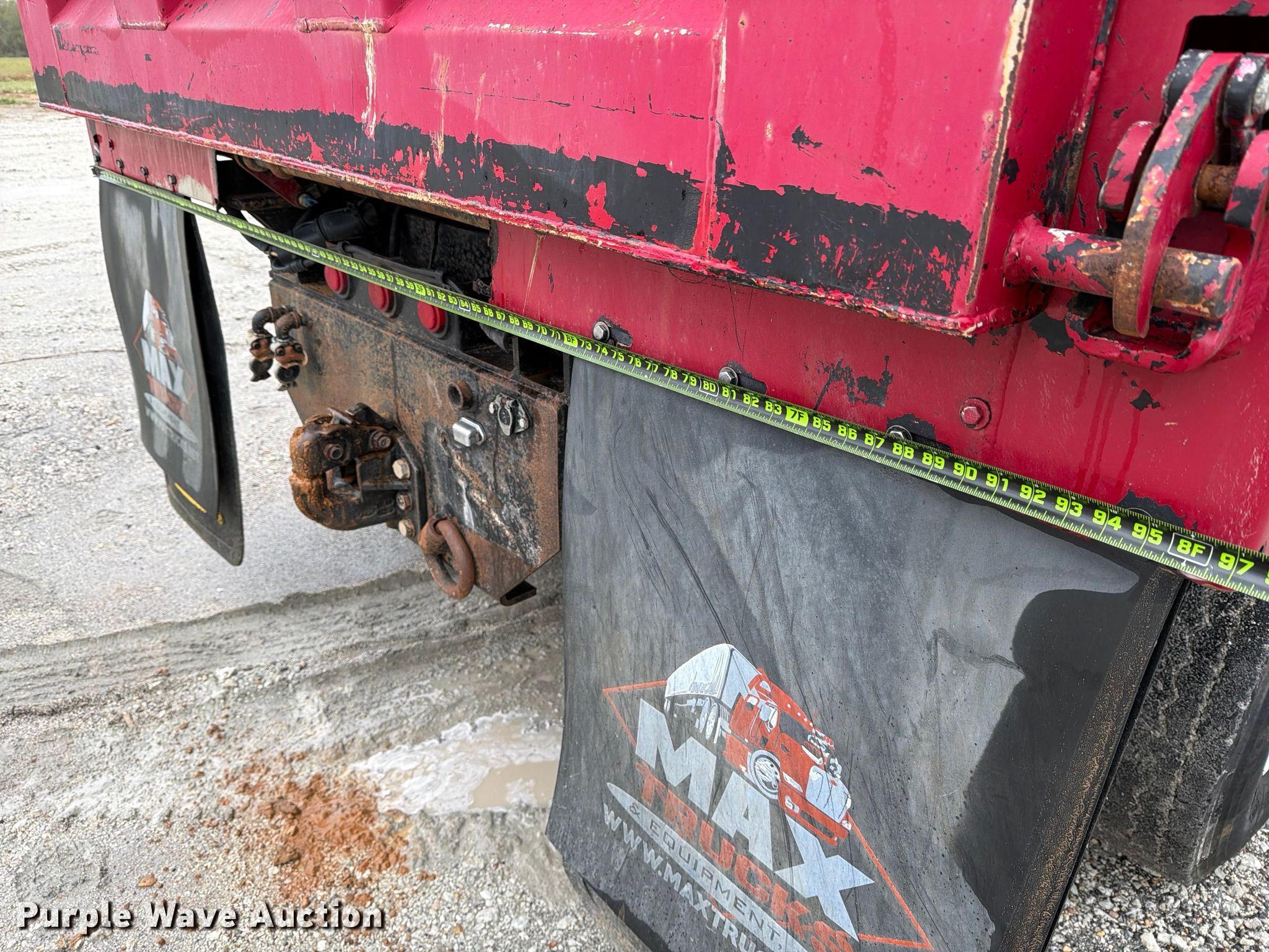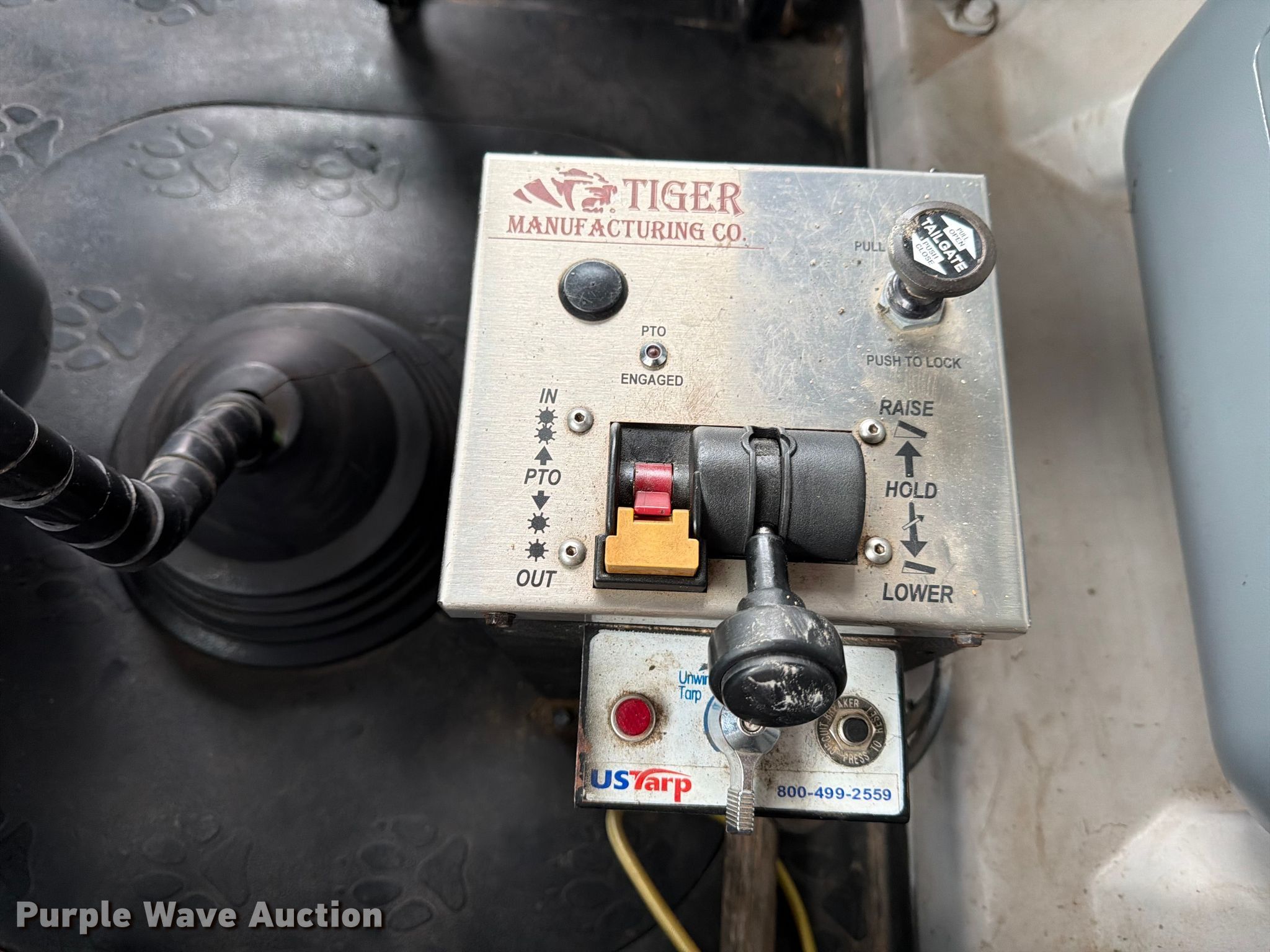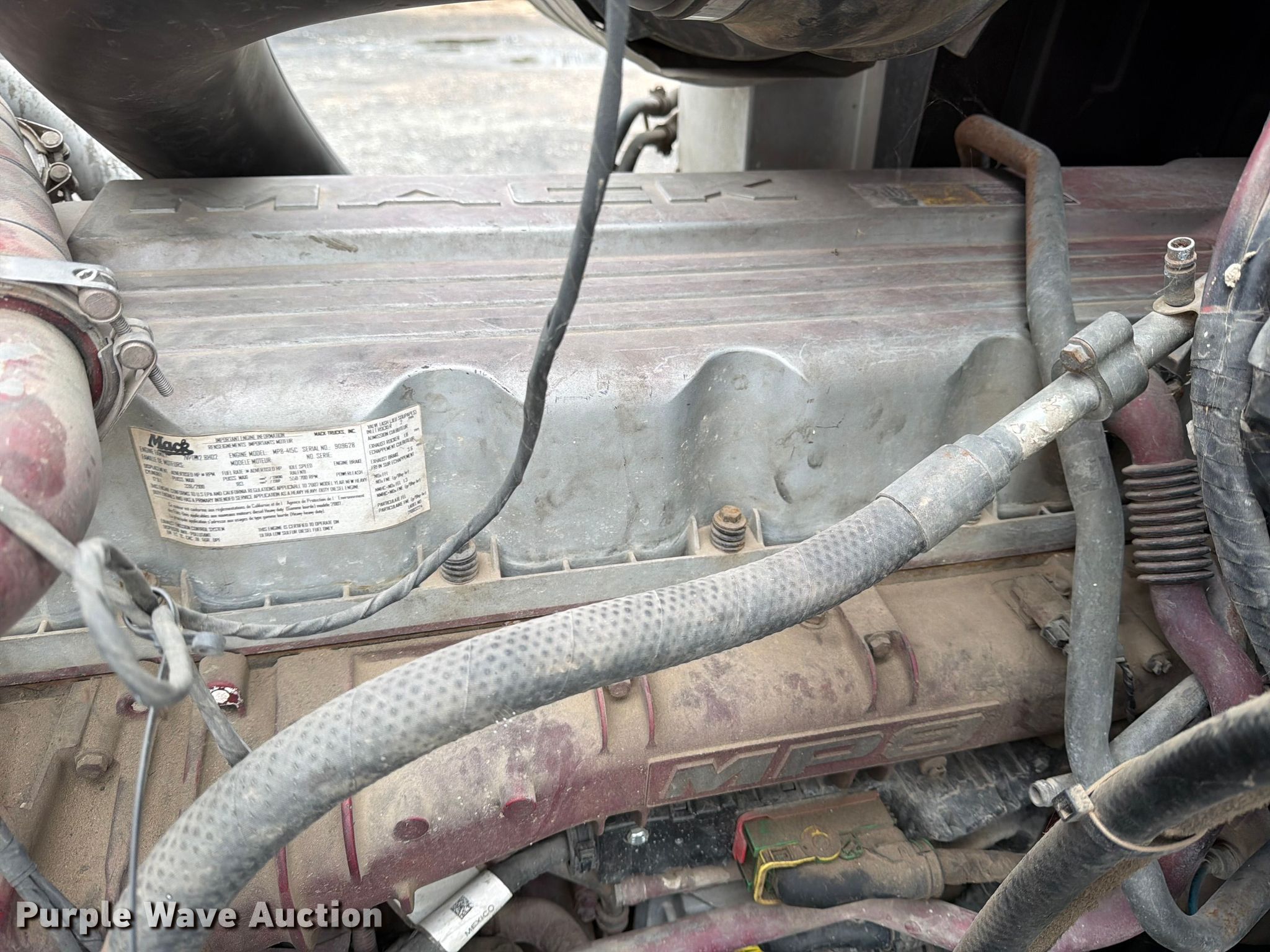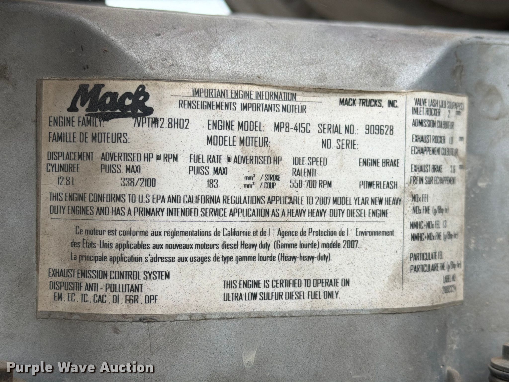 2008 Mack CHU613 dump truck. Miles: 95,255 on odometer, VIN: 1M1AN09Y18N003289. Engine Mack MP8-415C, Serial: 909628, Displacement: 12.8L, Cylinders: 6, Fuel type: Diesel, HP: 338, Engine brake. Transmission Eaton Fuller, Manual, Speed: 13. Chassis Axles: Tandem, Differential lock: Inter-axle, Suspension: Spring, Brakes: Air, PTO, GVWR: 58,320 lbs FAWR: 14,320 lbs, IAWR: 22,000 lbs, RAWR: 22,000 lbs. Interior AC, Heat, Heated mirrors, Cruise control. Features Bed Dump bed, Tiger Manufacturing, Serial: 9202-2/9627, Length: 14', Width: 97", Side height: 46", Side board height: 7", Bed type: Steel, Roll tarp, Ram: Single, End gate: Air operated. Tires Front: 11R24.5, Rear: 11R22.5. Notes Intermittent PTO issues, sticks, Roll tarp missing, Dash warning indicator: Electrical fault. Texas title. Title distribution may be delayed up to 14 days from verification of funds. Navasota, TX 77868