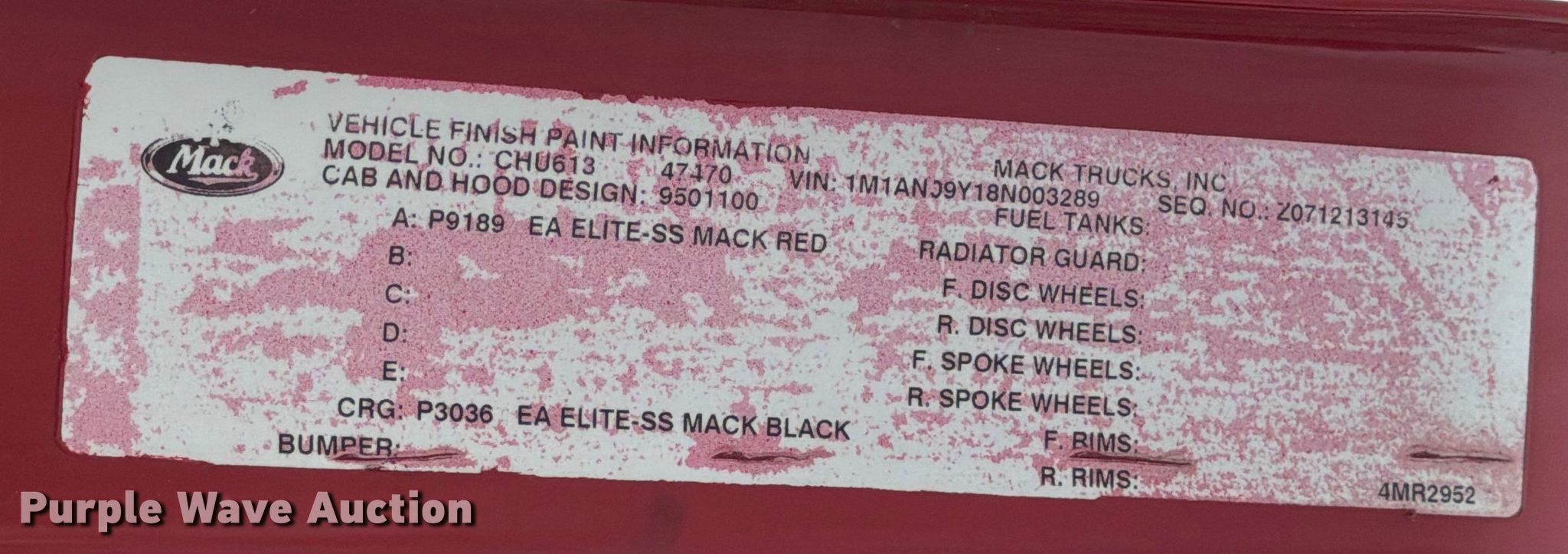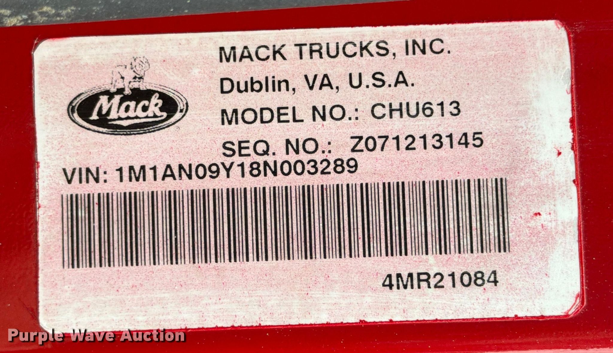 Take a look at this used 2008 Mack CHU613 dump truck being sold on December 31st, 2025 in the Wednesday December 31 Construction Equipment Auction made by Mack. Take a look at all of the item information below or take a look at similar auctions for Construction Trucks.