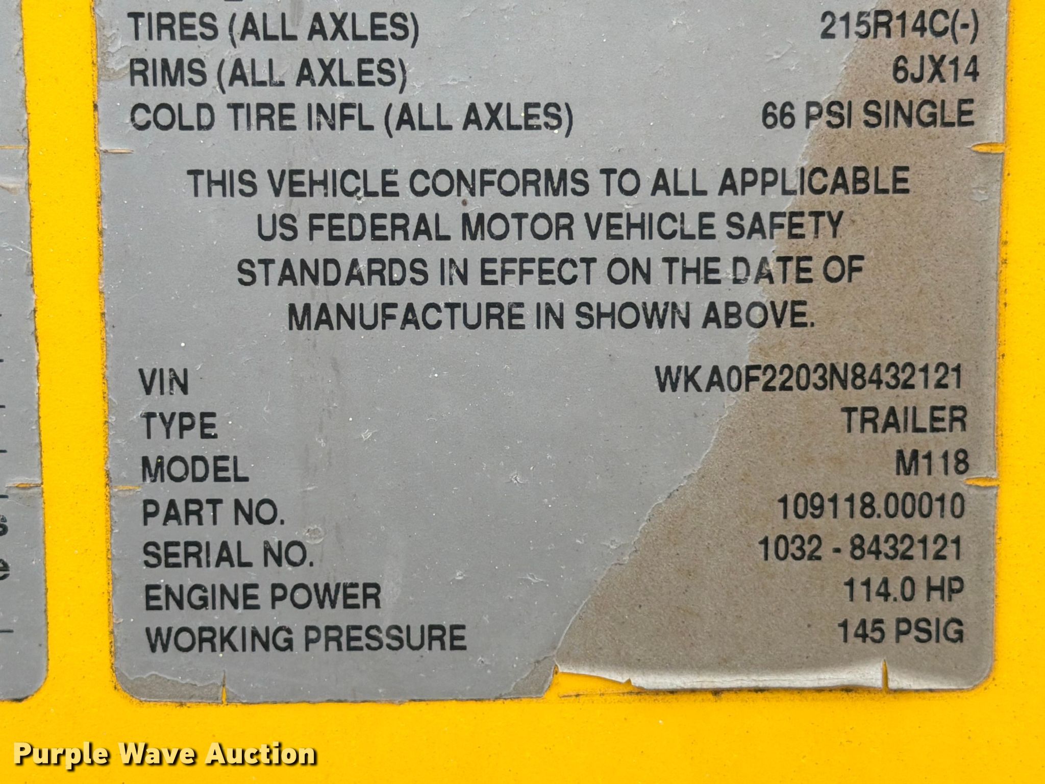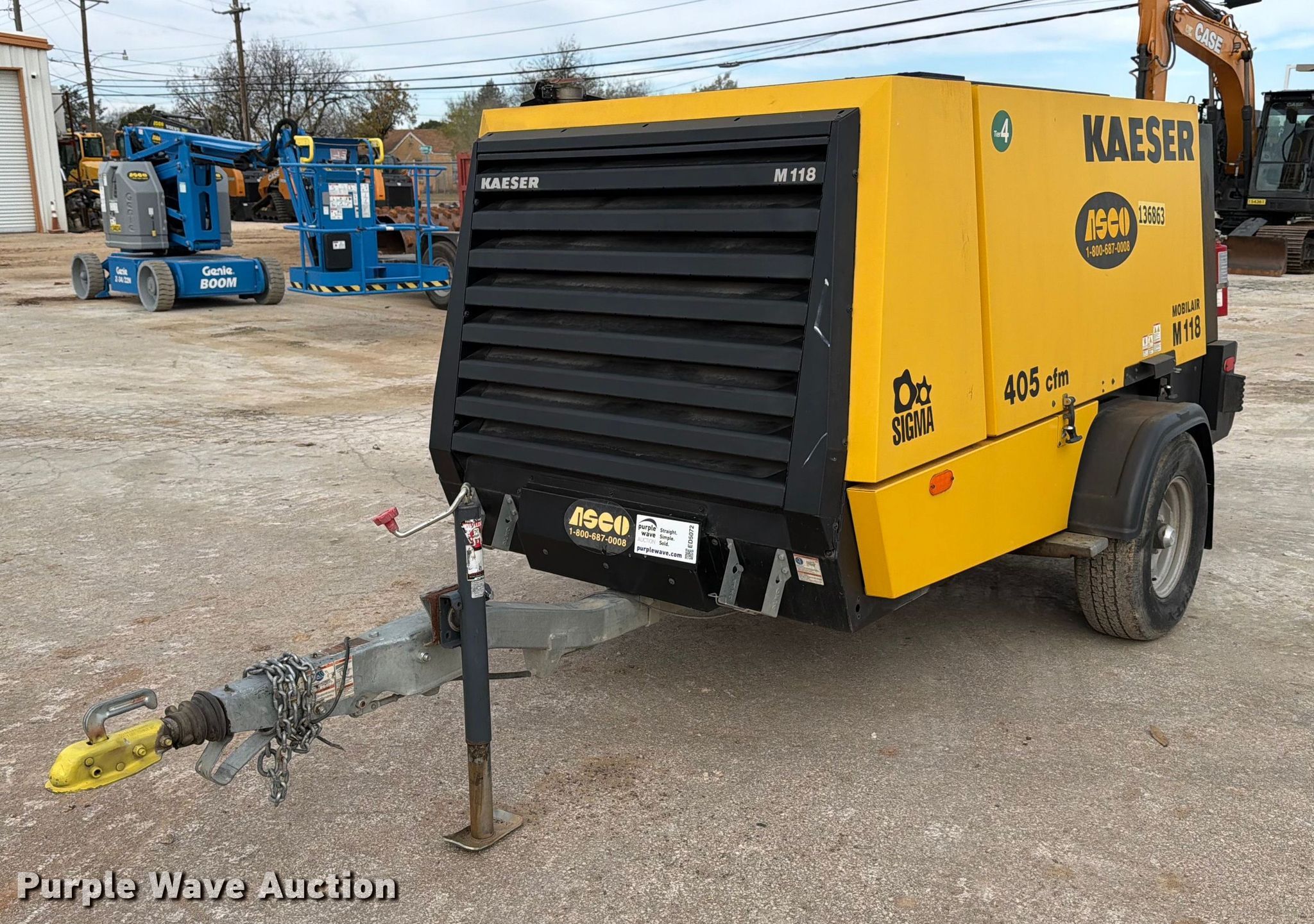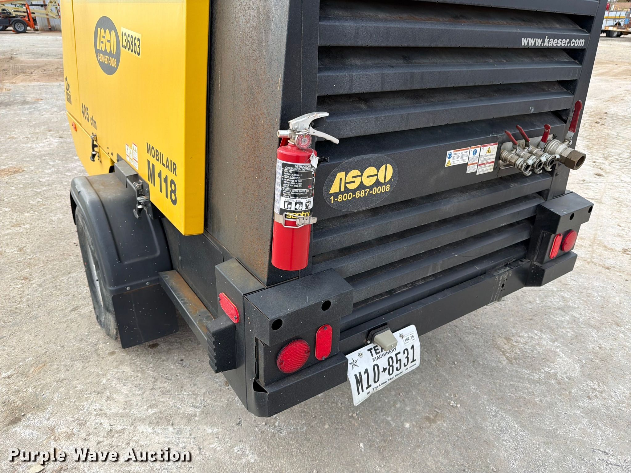 2022 Kaeser M118 air compressor. Hours: 2,266 on meter, VIN: WKA0F2203N8432121, Serial: 1032 - 8432121, Unit #: 136863. Engine Deutz TCD 3.6 L4, Serial: 12485770, Displacement: 3.621L, Cylinders: 4, Fuel type: Diesel, HP: 114, kW: 85. Features Air compressor Kaeser, CFM: 405, PSI: 145. Trailer 14' L x 74" W, Ball hitch size: 2", Suspension: Torsion, Brakes: Hydraulic, Axles: Single, Tire size: 215/R14C, GVWR: 4,462 lbs, GAWR: 4,850 lbs. This is worksite support equipment and will not come with a title. Transfer of ownership documentation will be a bill of sale. ASCO Equipment. Abilene, TX 79602
