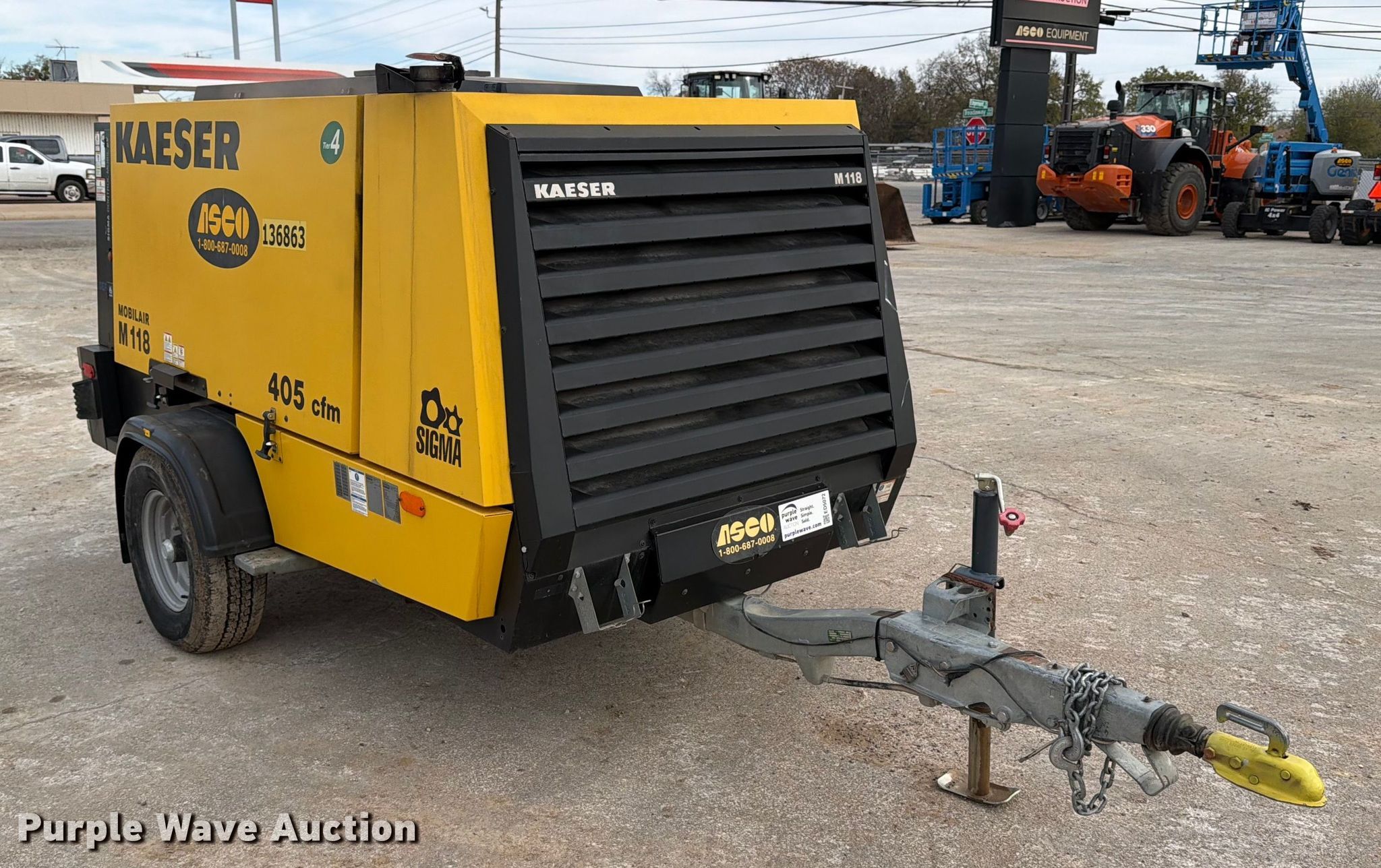 Purple Wave is selling a used Air Compressor in Texas. This item is a 2022 Kaeser M118 air compressor with the following: Hours: 2,266 on meter, VIN: WKA0F2203N8432121, Serial: 1032 - 8432121, Unit #: 136863