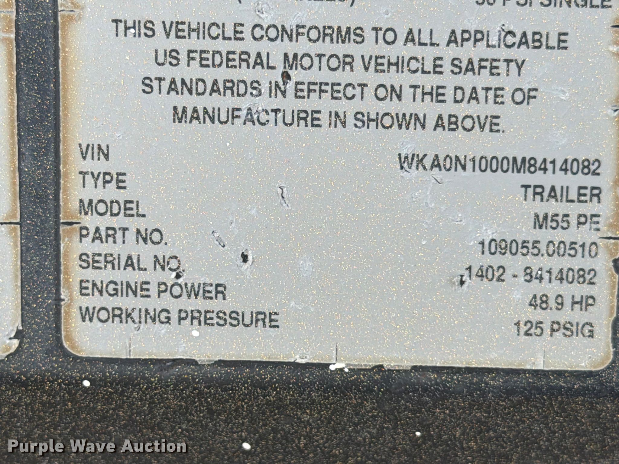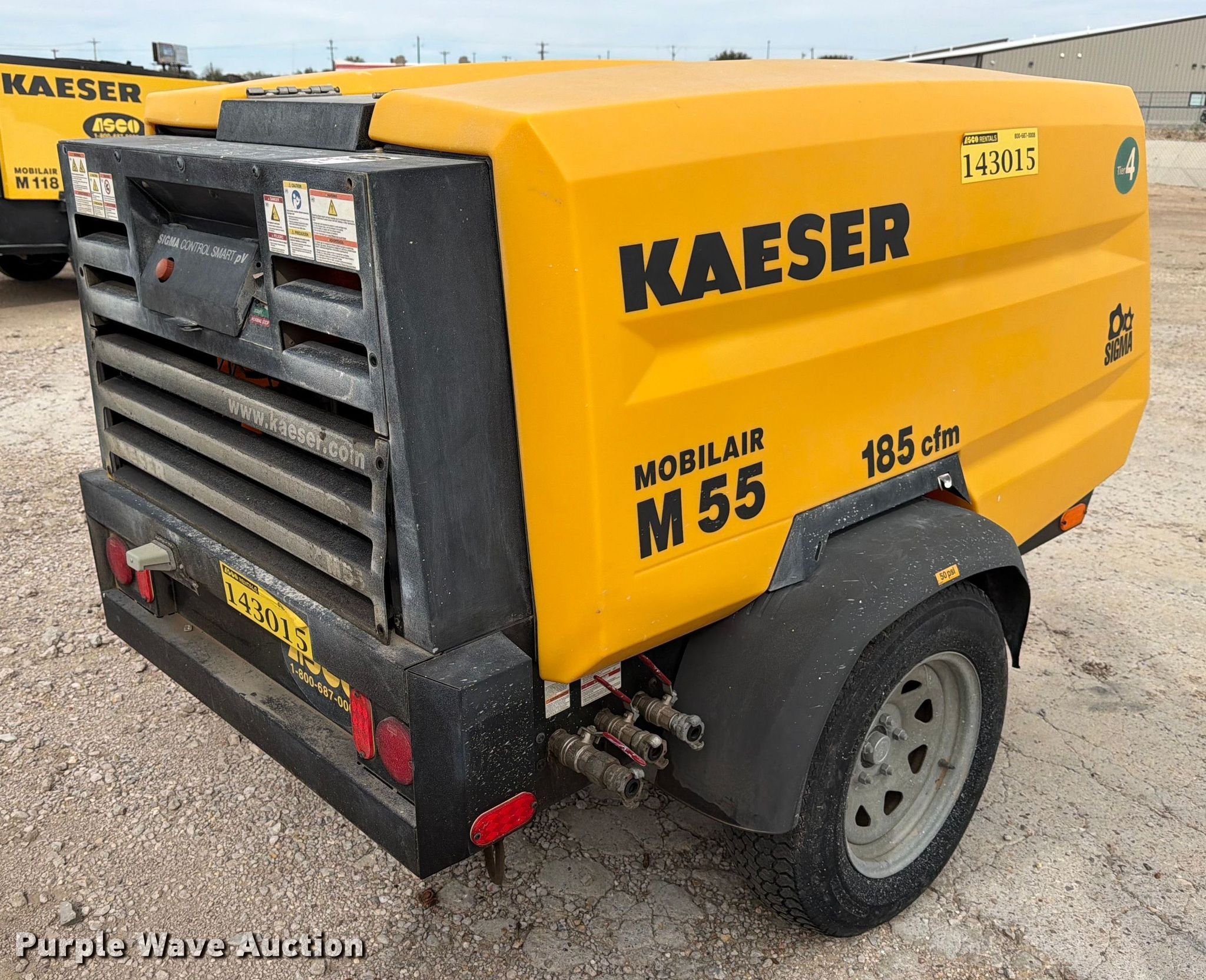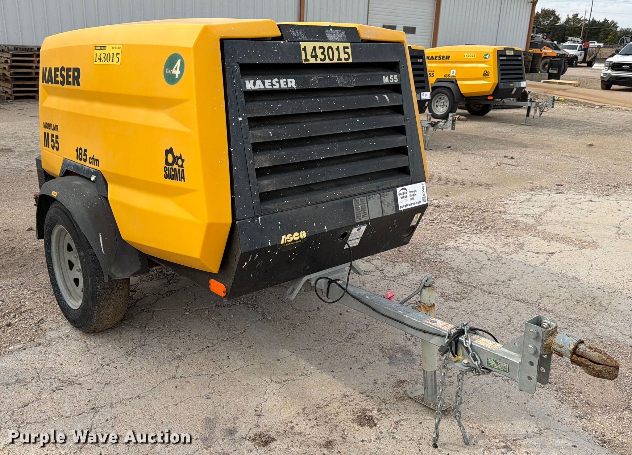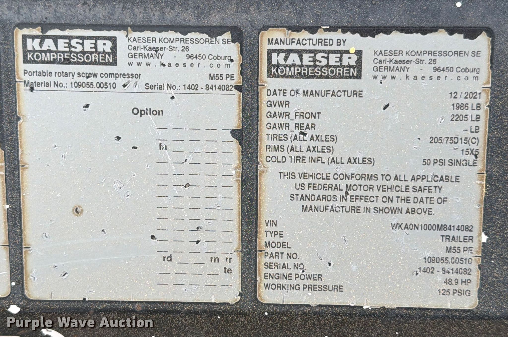 Purple Wave is selling a used Air Compressor in Texas. This item is a 2021 Kaeser M55 air compressor with the following: Hours: 1,573 on meter, VIN: WKA0N1000M8414082, Serial: 1402 - 8414082, Unit #: EQ0143015