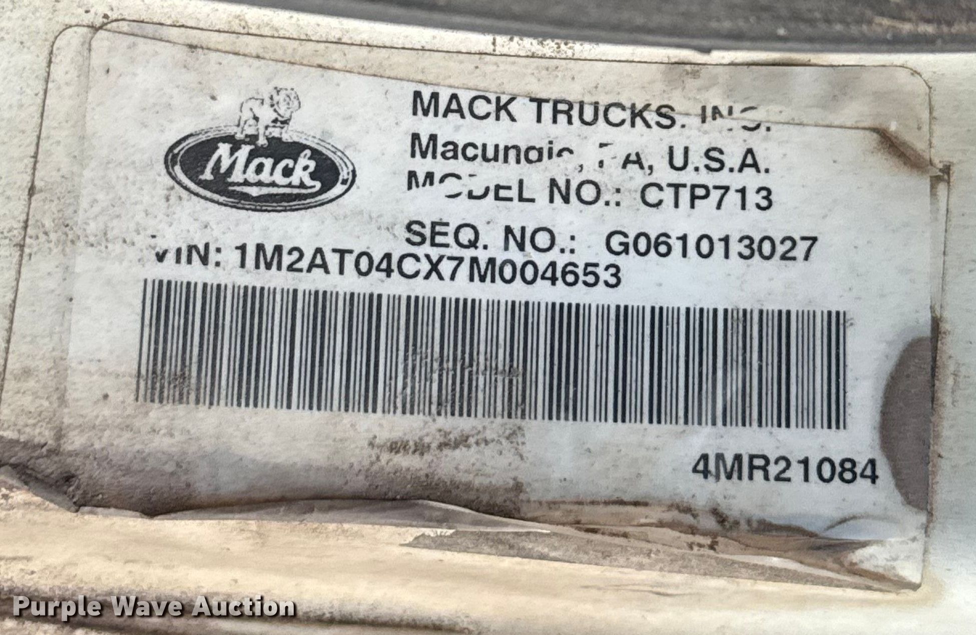 Purple Wave is selling a used Construction Dump Truck in Oklahoma. This item is a 2007 Mack CTP713 dump truck with the following: Miles: 126,872 on odometer, Hours: 8,137 on meter, VIN: 1M2AT04CX7M004653, Unit #: 203587
