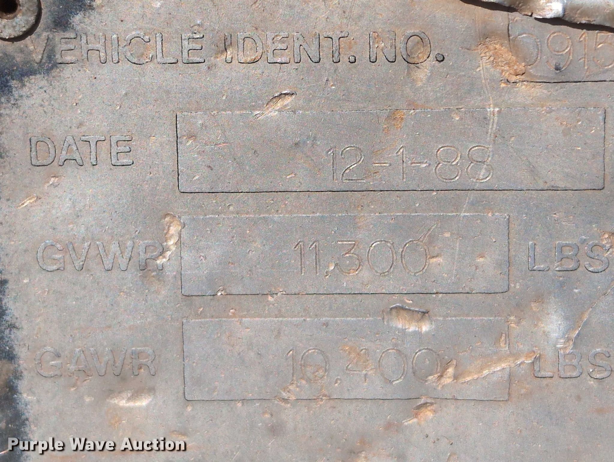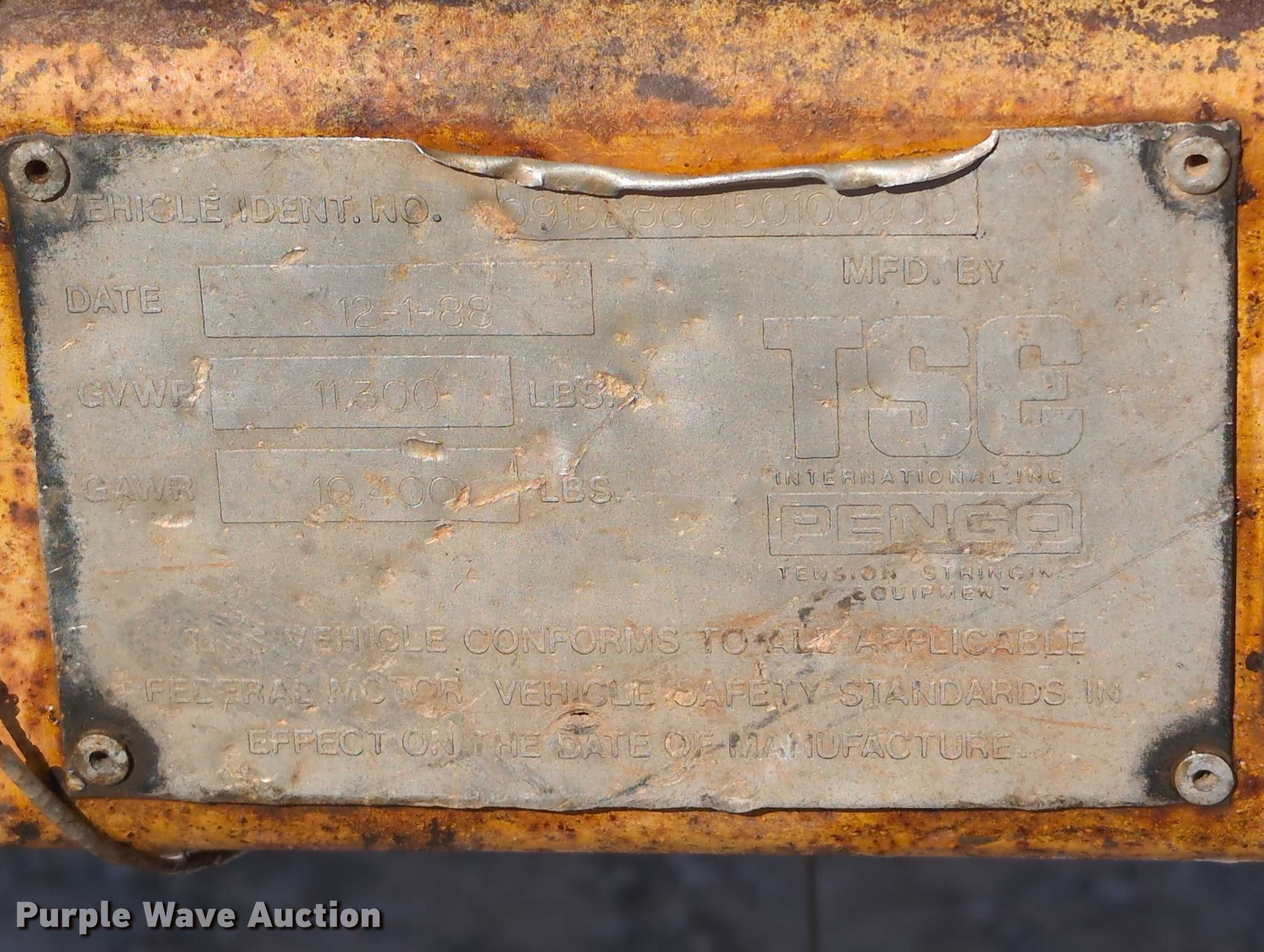 1988 TSE T30/36 VGRV reel trailer. VIN: 9152888150100000. Dimensions Overall Length: 16' 6", Width: 89". Features Reel: Single, Line tamer, Maximum reel width: 60". Chassis Hitch: Pintle, Landing gear: Single, Suspension: Spring, Brakes: Electric, Axles: Tandem, GVWR: 11,300 lbs, GAWR: 10,400 lbs. Tires Size: 235/80R16. Transfer of ownership documentation will be a bill of sale. Bennett Construction. Piedmont, OK 73078