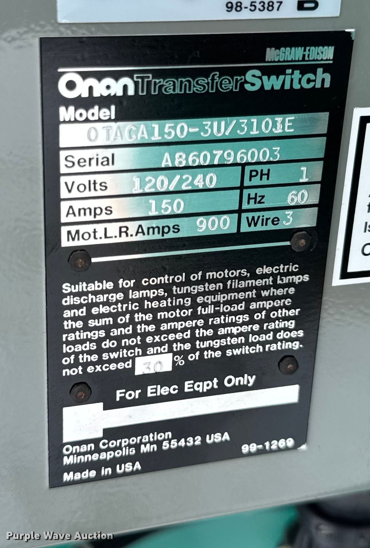 Onan 30.0EK-15R/23642R generator. Hours: 1,116 on meter, Serial: G860829773, Unit #: 13. Engine Ford CSG-6491-6005-A, Serial: 10667H-1-TK, Cylinders: 6, Fuel type: LPG. Features Generator Onan, kVA: 37.5, kW: 30, Phase: Three, Backup start, Electric start, Onan transfer switch. Notes No battery, Doors damaged. GRM Networks. PRINCETON, MO 64673
