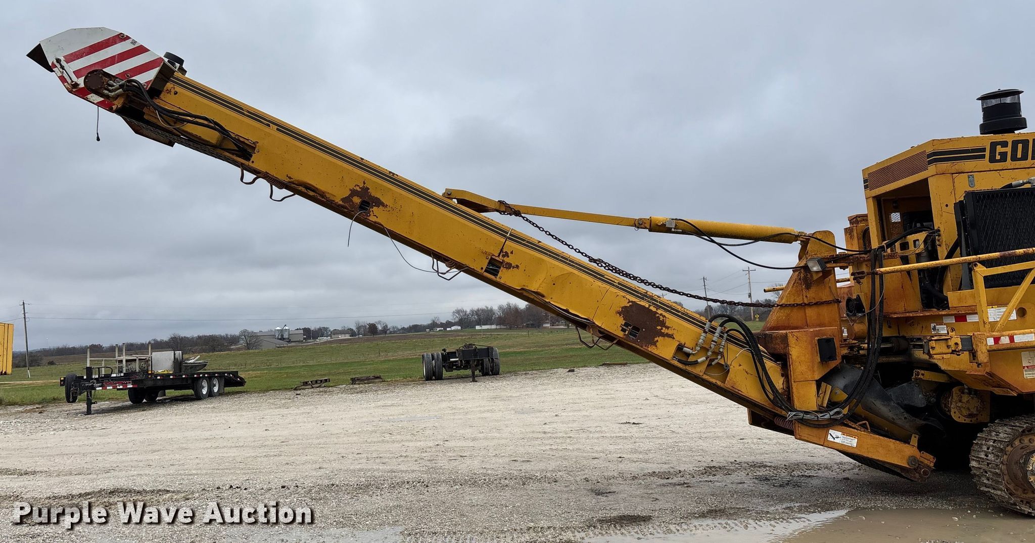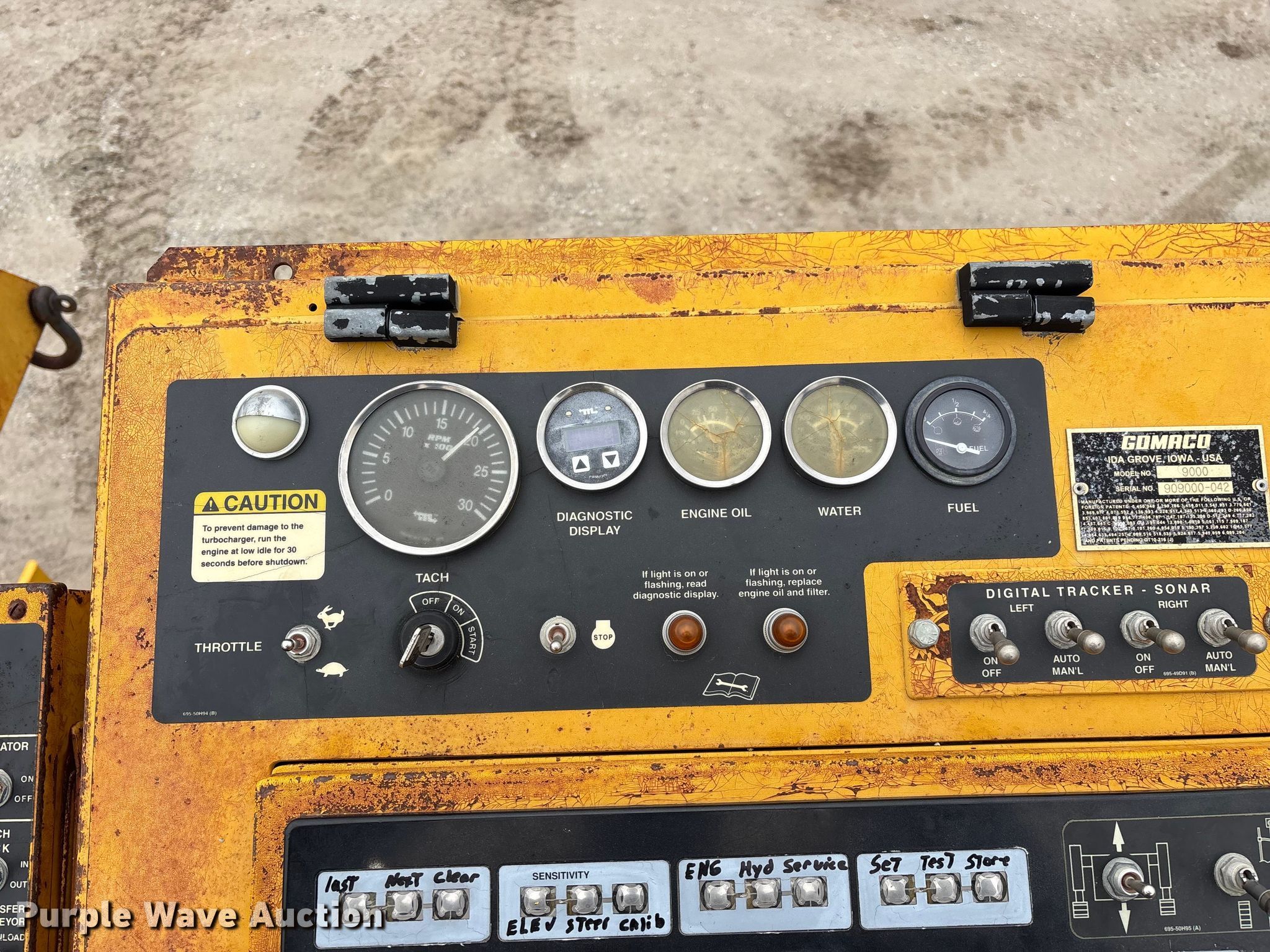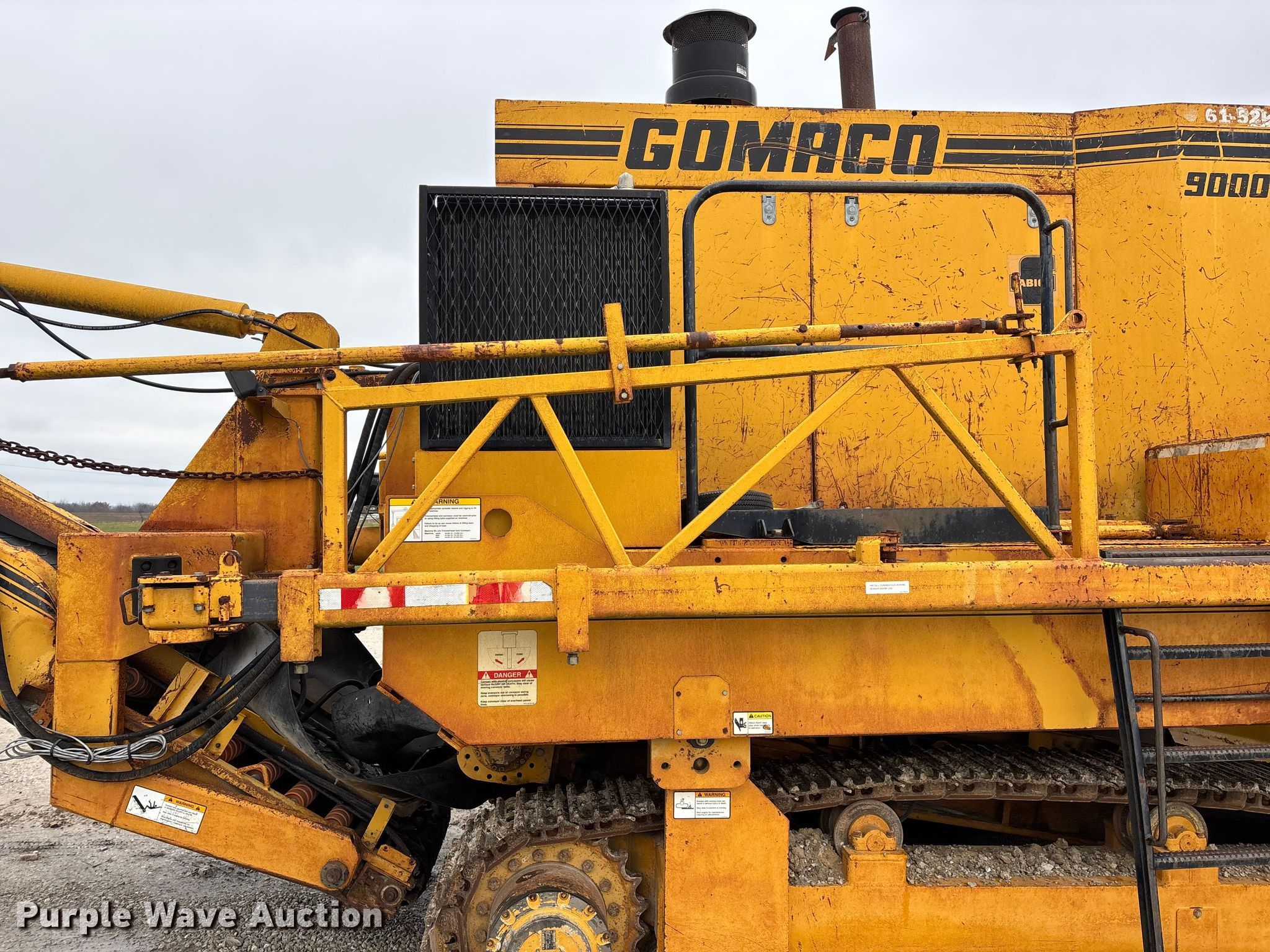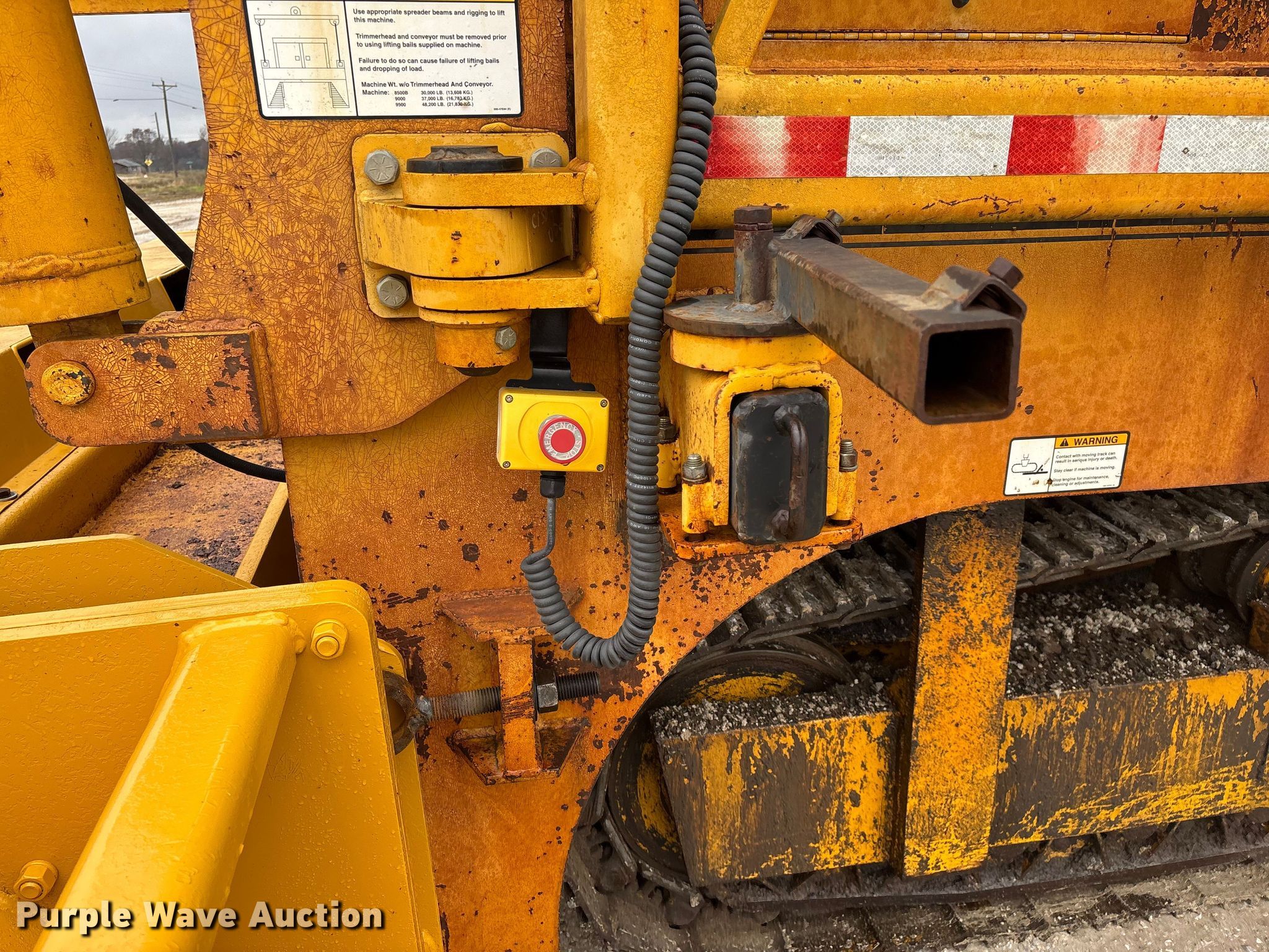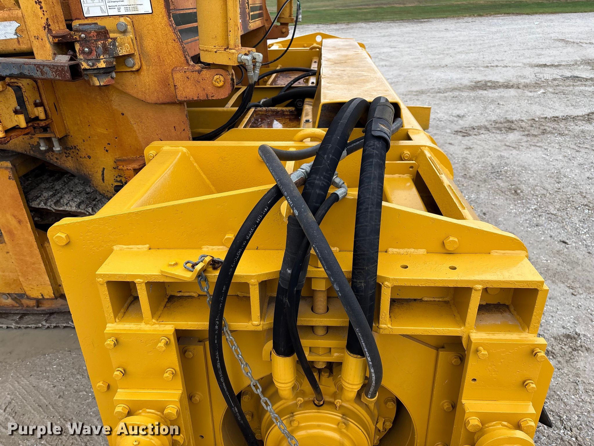 Gomaco 9000 trimmer. Hours: Unknown, Serial: 909000-042. Engine Caterpillar C-10, Serial: BCX02260, Displacement: 10.3L, Cylinders: 6, Fuel type: Diesel, HP: 439, kW: 327. Transmission Hydrostatic. Features 14' trimmer head, Transfer conveyor Size: 12' 2 L x 30" W, Rear conveyor Size: 24' L x 29.5" W. Tracks Width: 13.5", Steel. Notes Hour meter illumination issues, Hydraulic hose issues. Hardy Holding Group. Pilot Grove, MO 65276