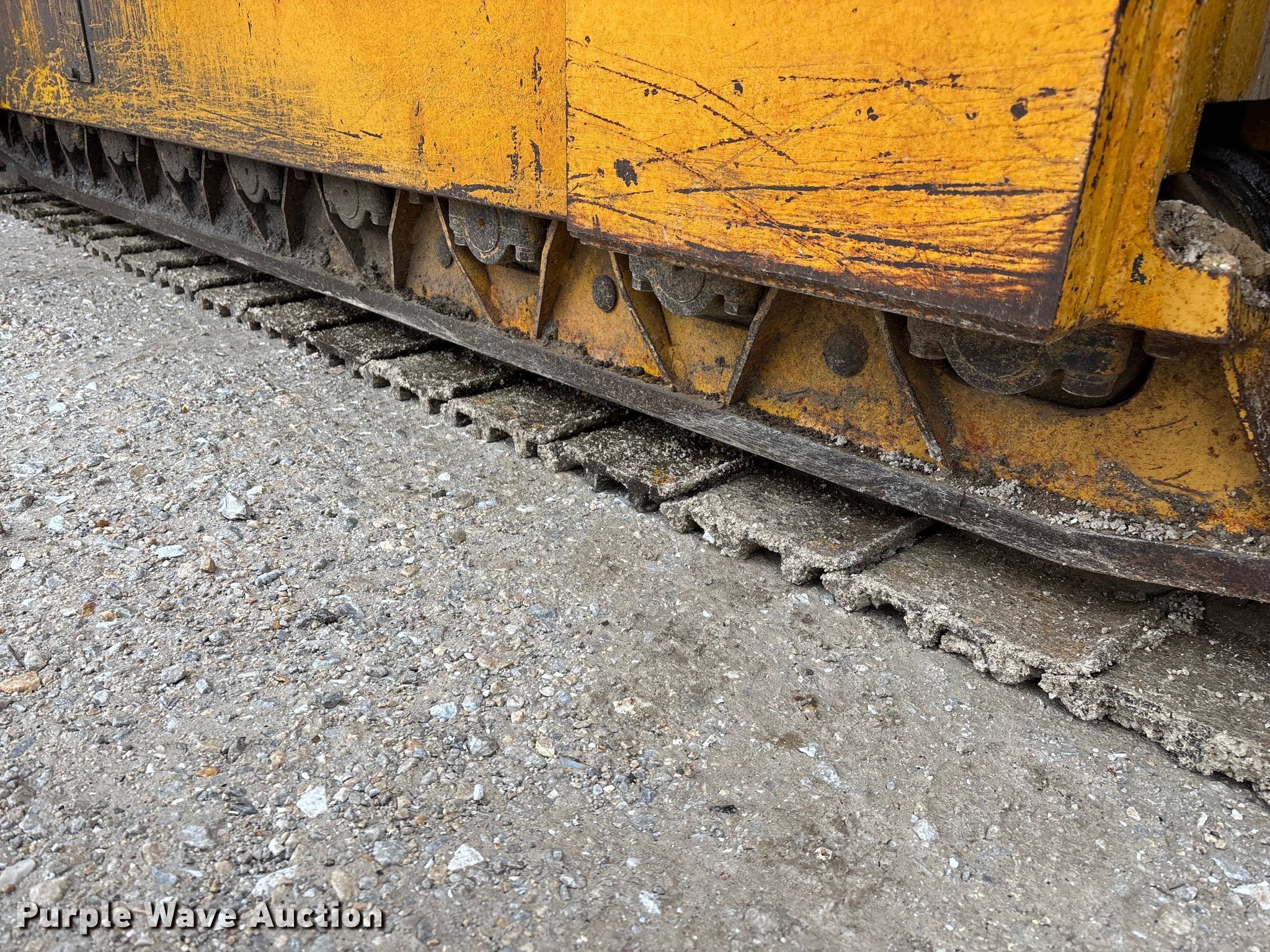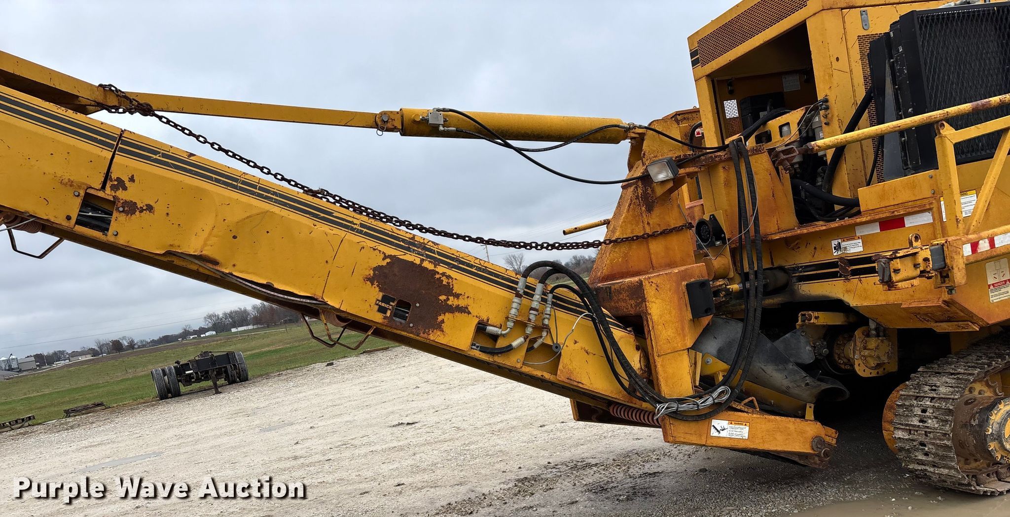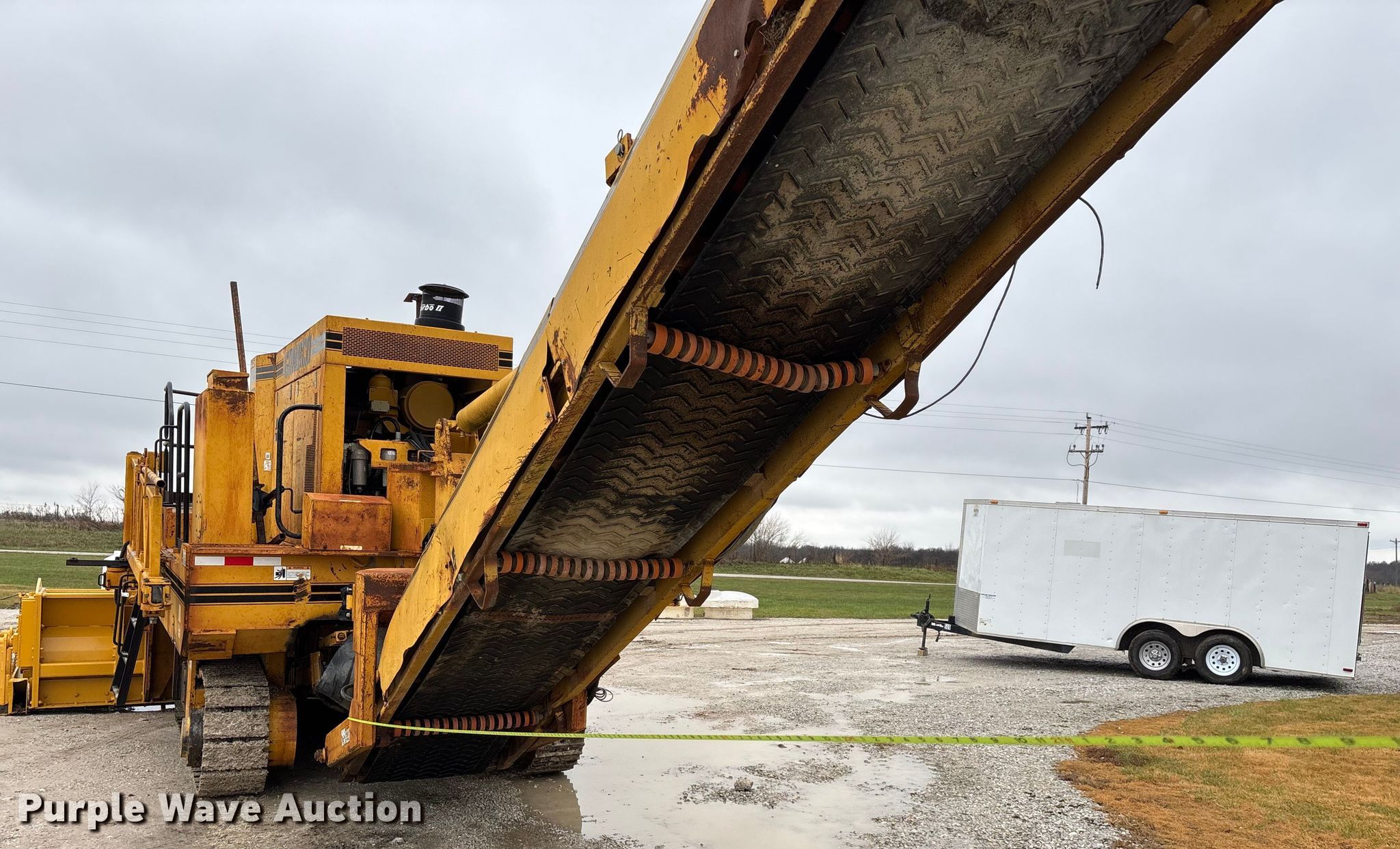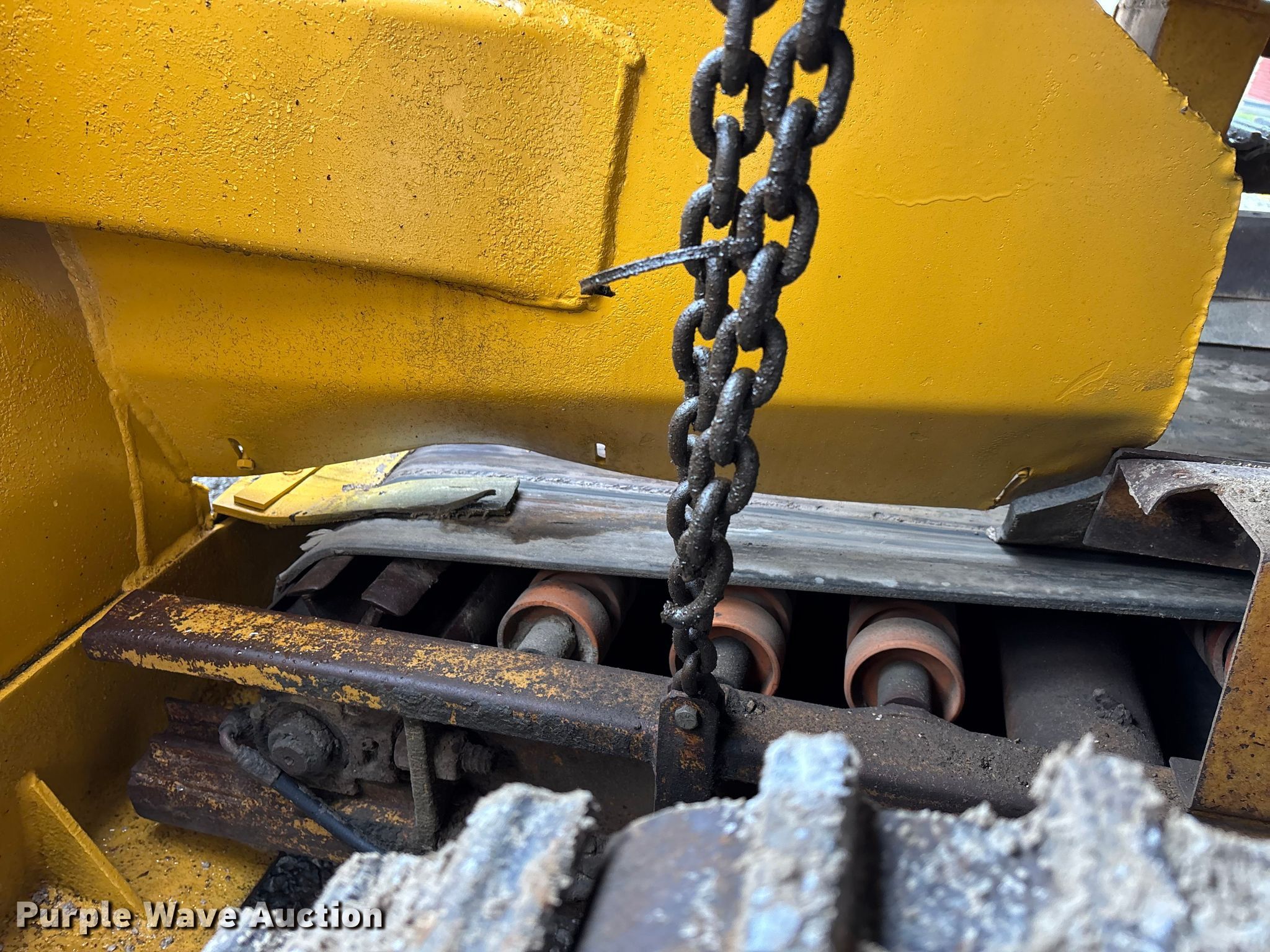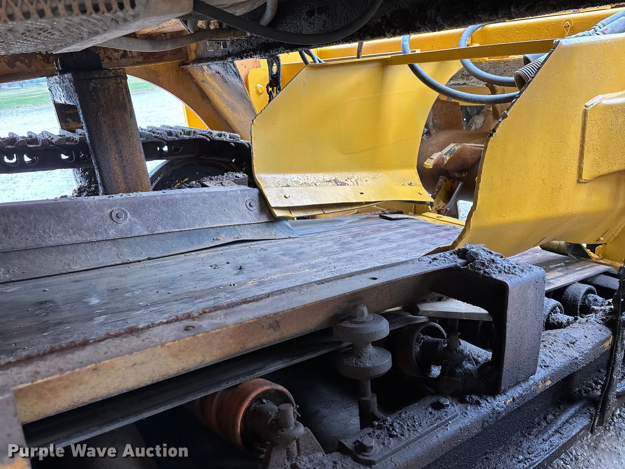 Gomaco 9000 trimmer. Hours: Unknown, Serial: 909000-042. Engine Caterpillar C-10, Serial: BCX02260, Displacement: 10.3L, Cylinders: 6, Fuel type: Diesel, HP: 439, kW: 327. Transmission Hydrostatic. Features 14' trimmer head, Transfer conveyor Size: 12' 2 L x 30" W, Rear conveyor Size: 24' L x 29.5" W. Tracks Width: 13.5", Steel. Notes Hour meter illumination issues, Hydraulic hose issues. Hardy Holding Group. Pilot Grove, MO 65276