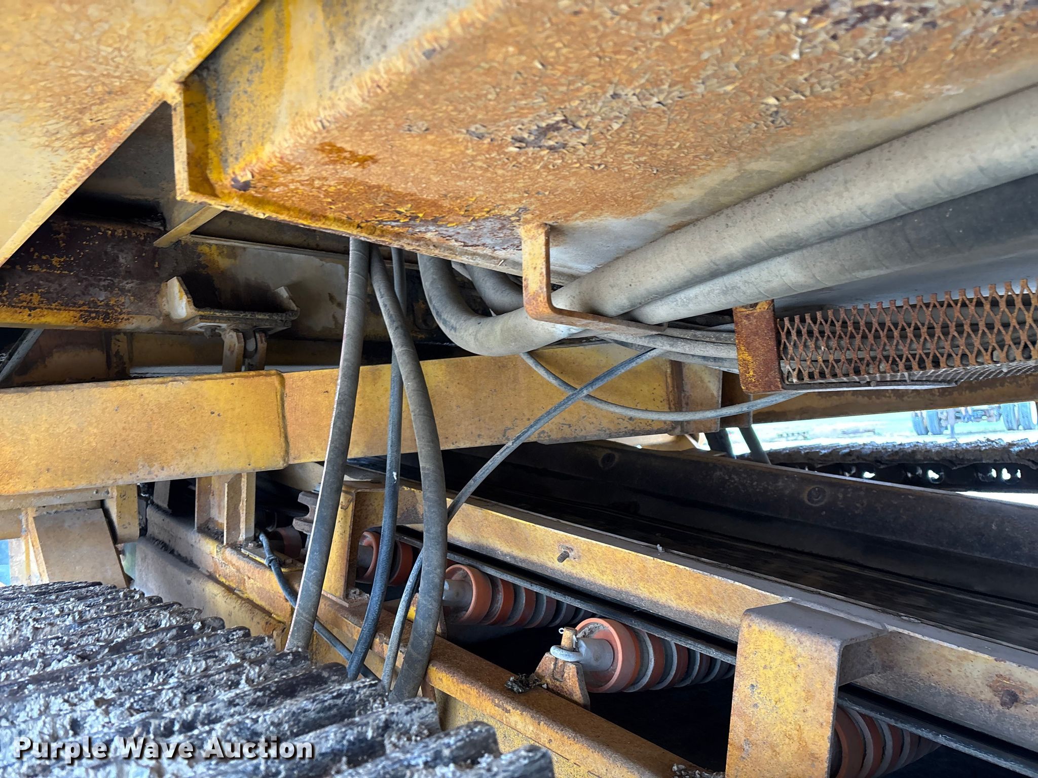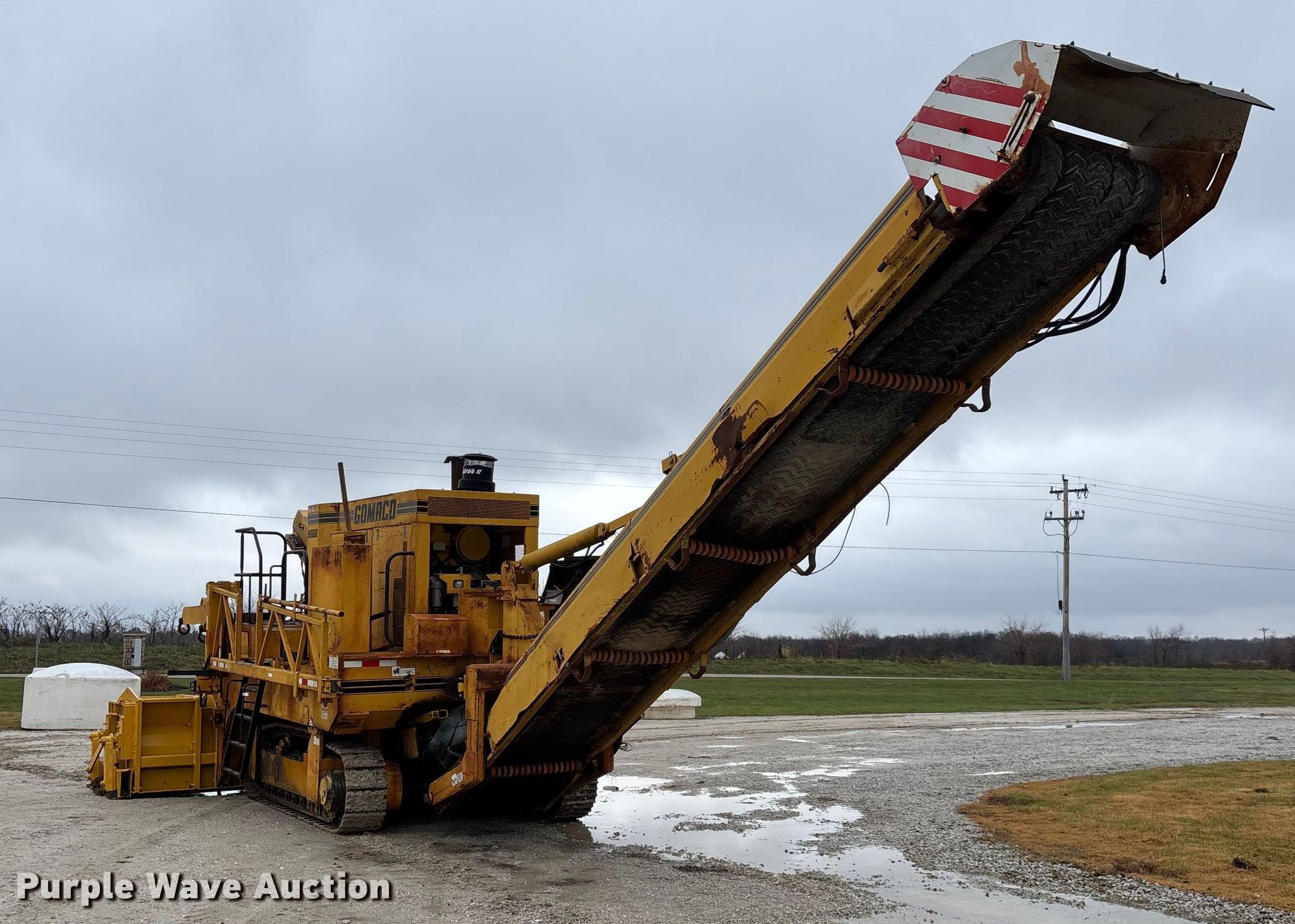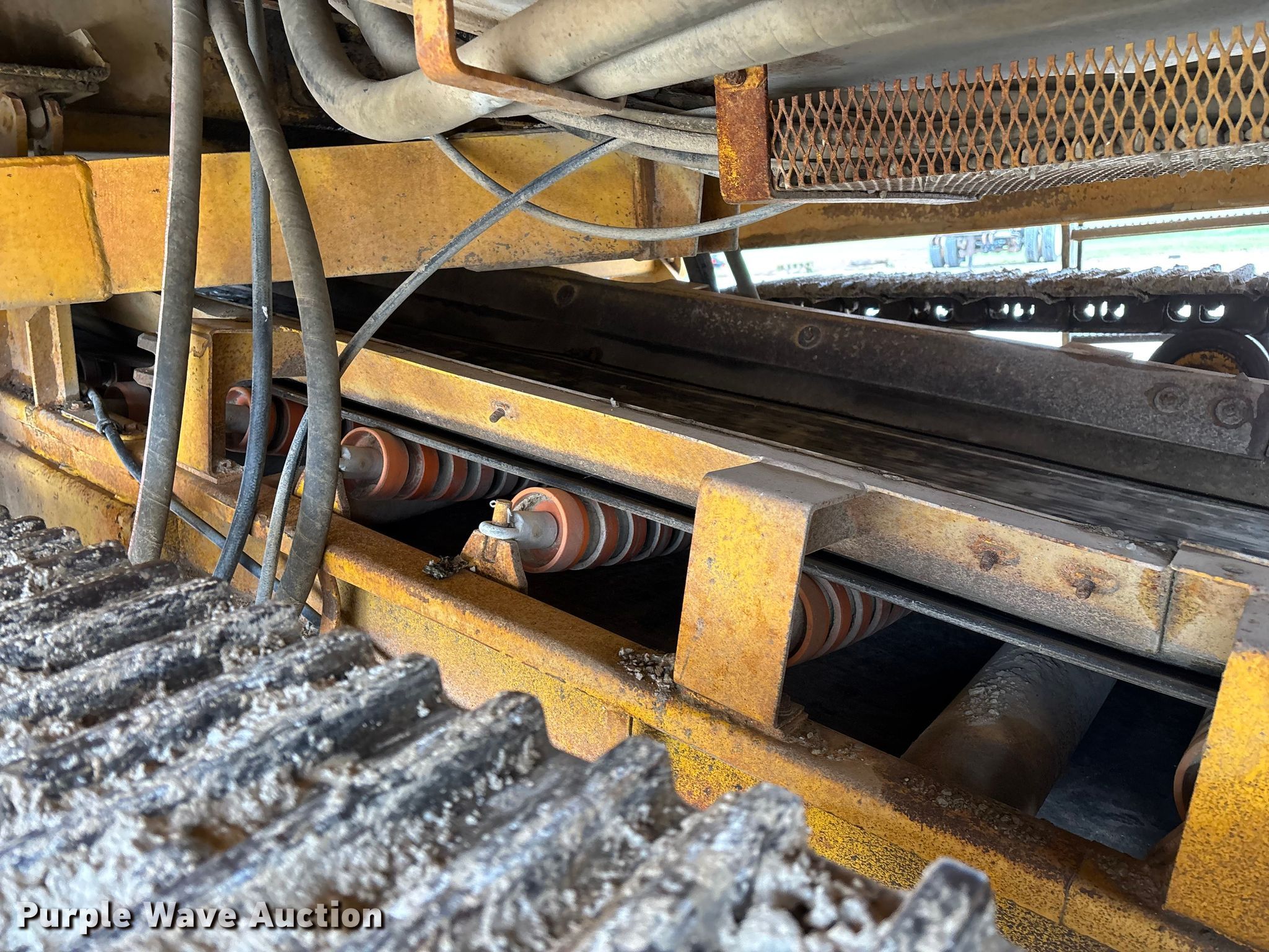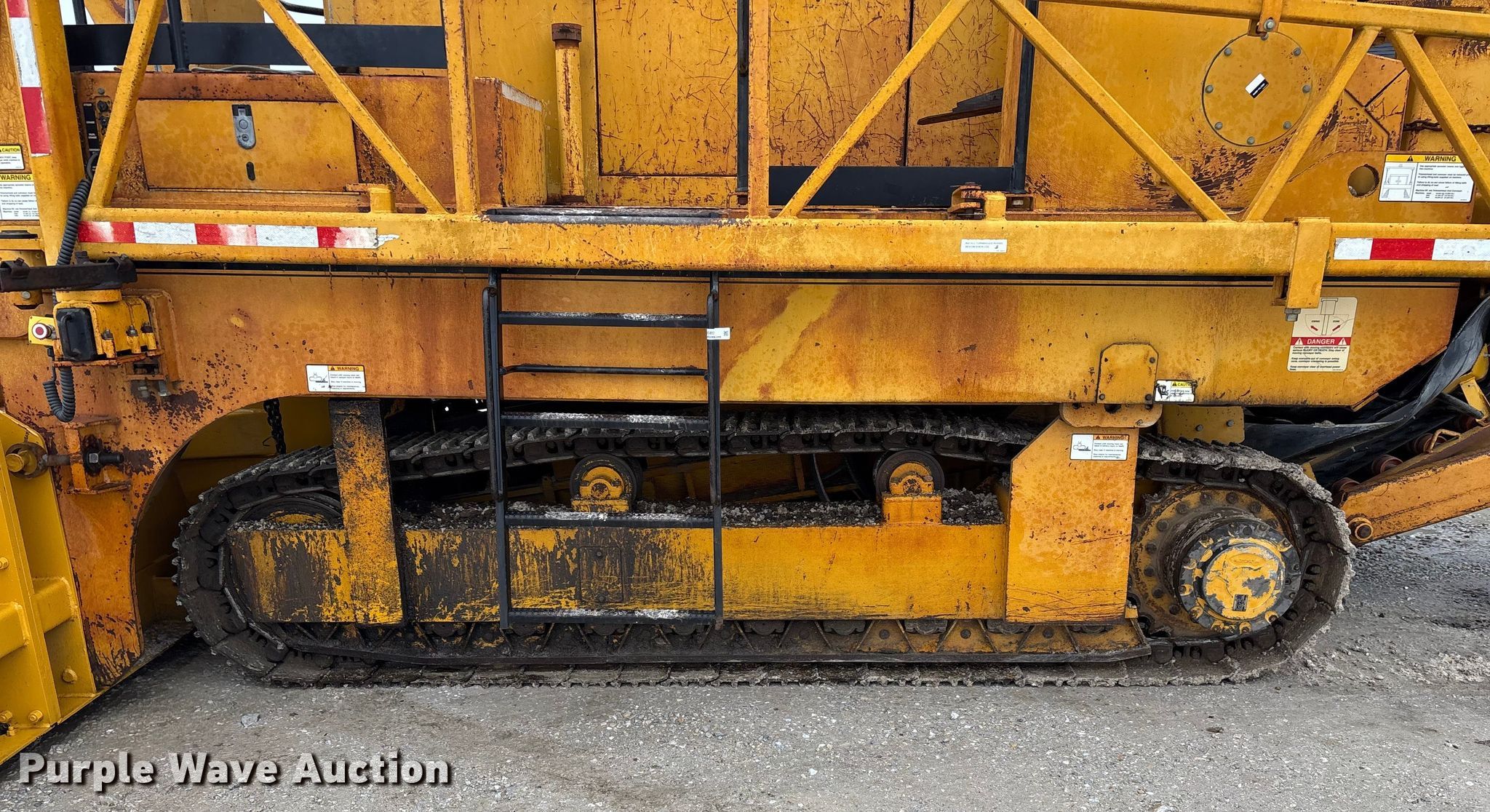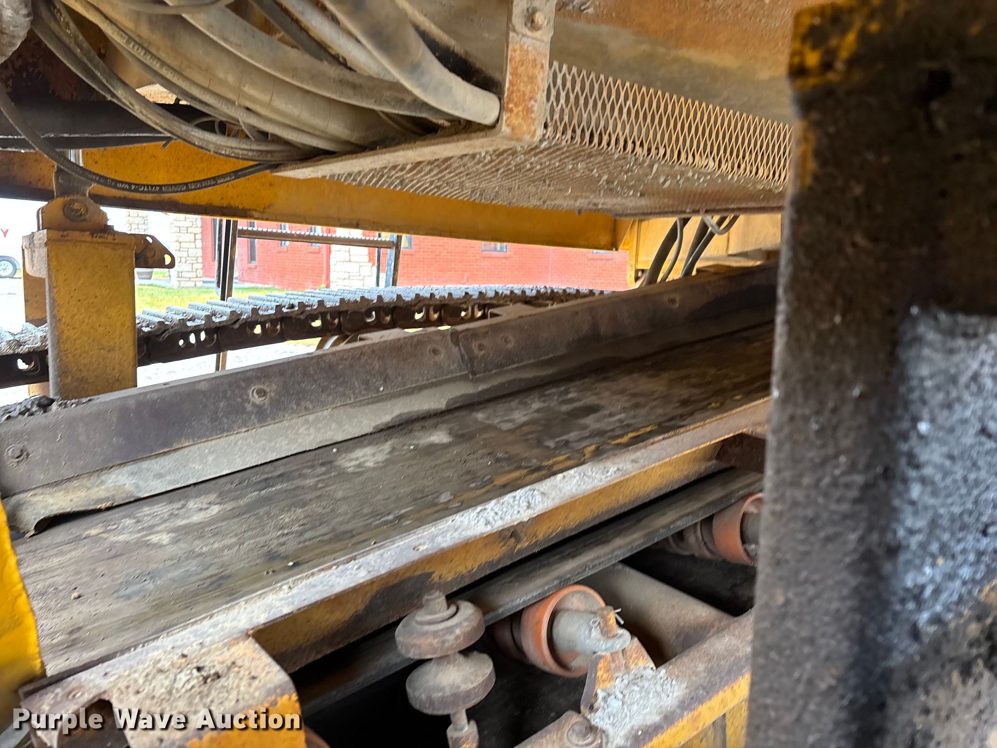 Gomaco 9000 trimmer. Hours: Unknown, Serial: 909000-042. Engine Caterpillar C-10, Serial: BCX02260, Displacement: 10.3L, Cylinders: 6, Fuel type: Diesel, HP: 439, kW: 327. Transmission Hydrostatic. Features 14' trimmer head, Transfer conveyor Size: 12' 2 L x 30" W, Rear conveyor Size: 24' L x 29.5" W. Tracks Width: 13.5", Steel. Notes Hour meter illumination issues, Hydraulic hose issues. Hardy Holding Group. Pilot Grove, MO 65276