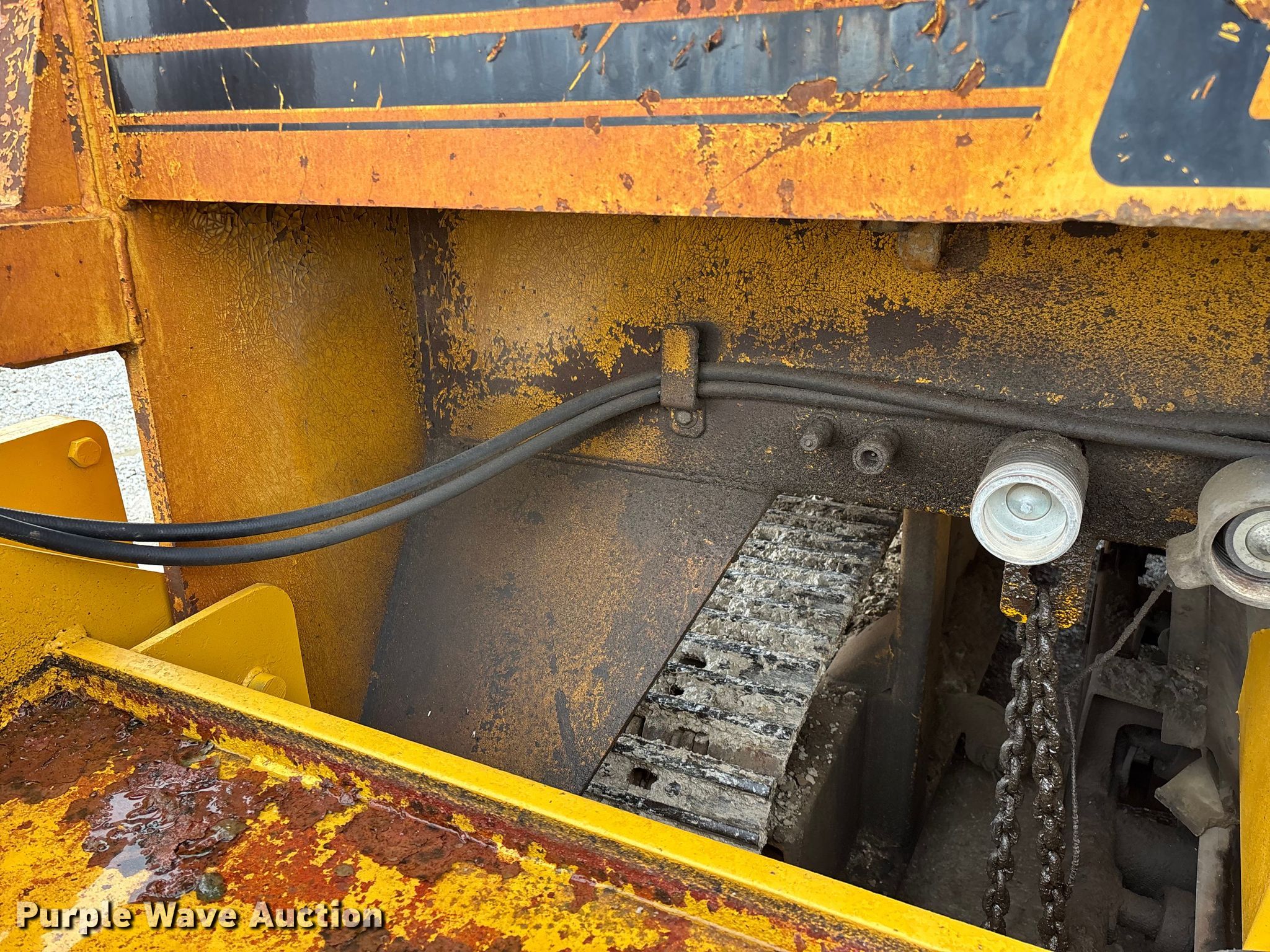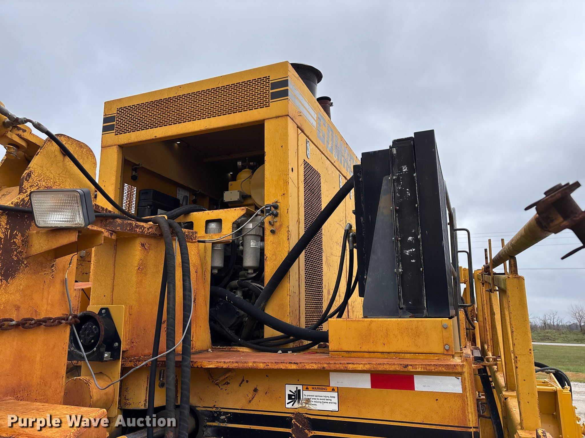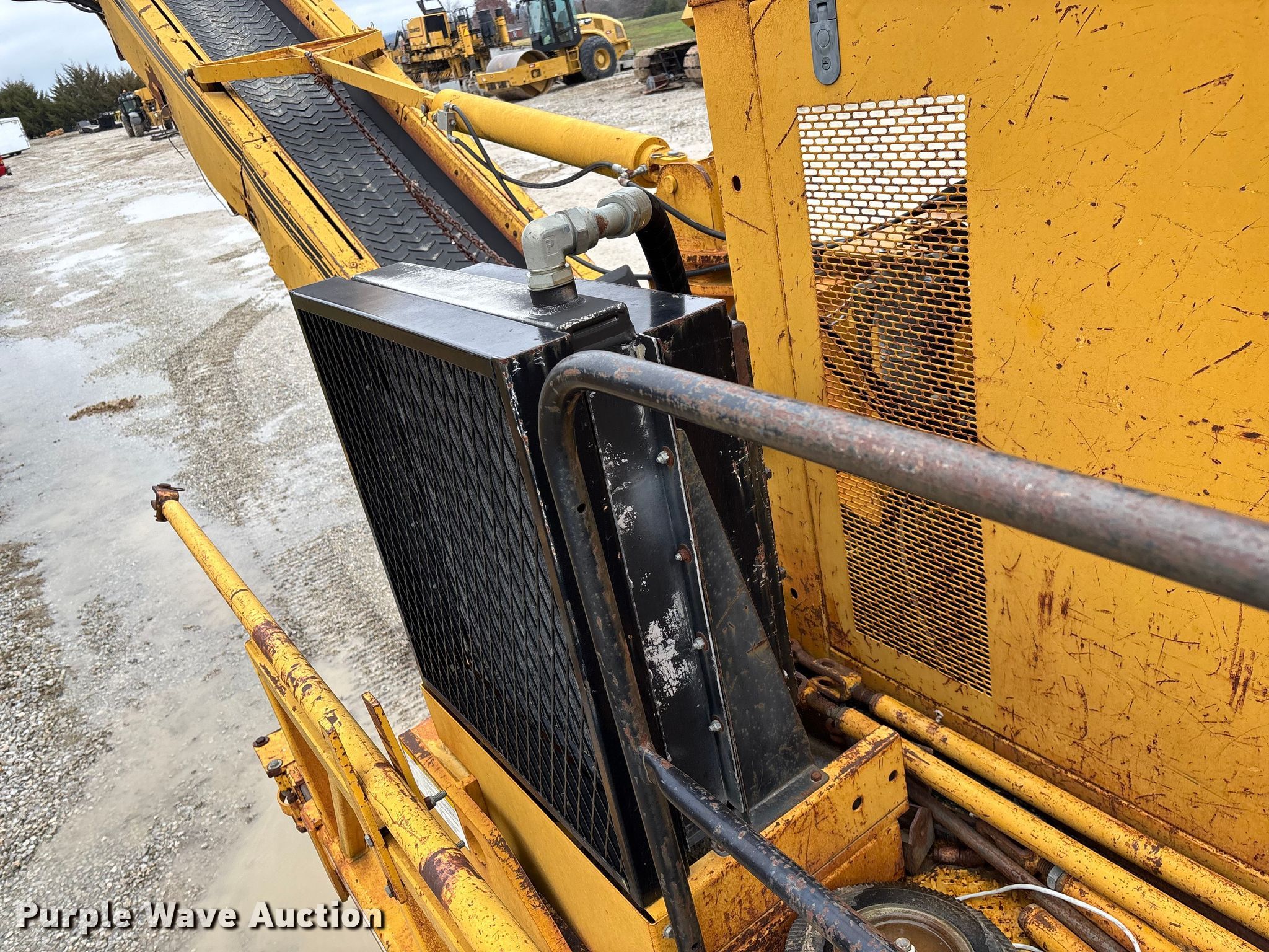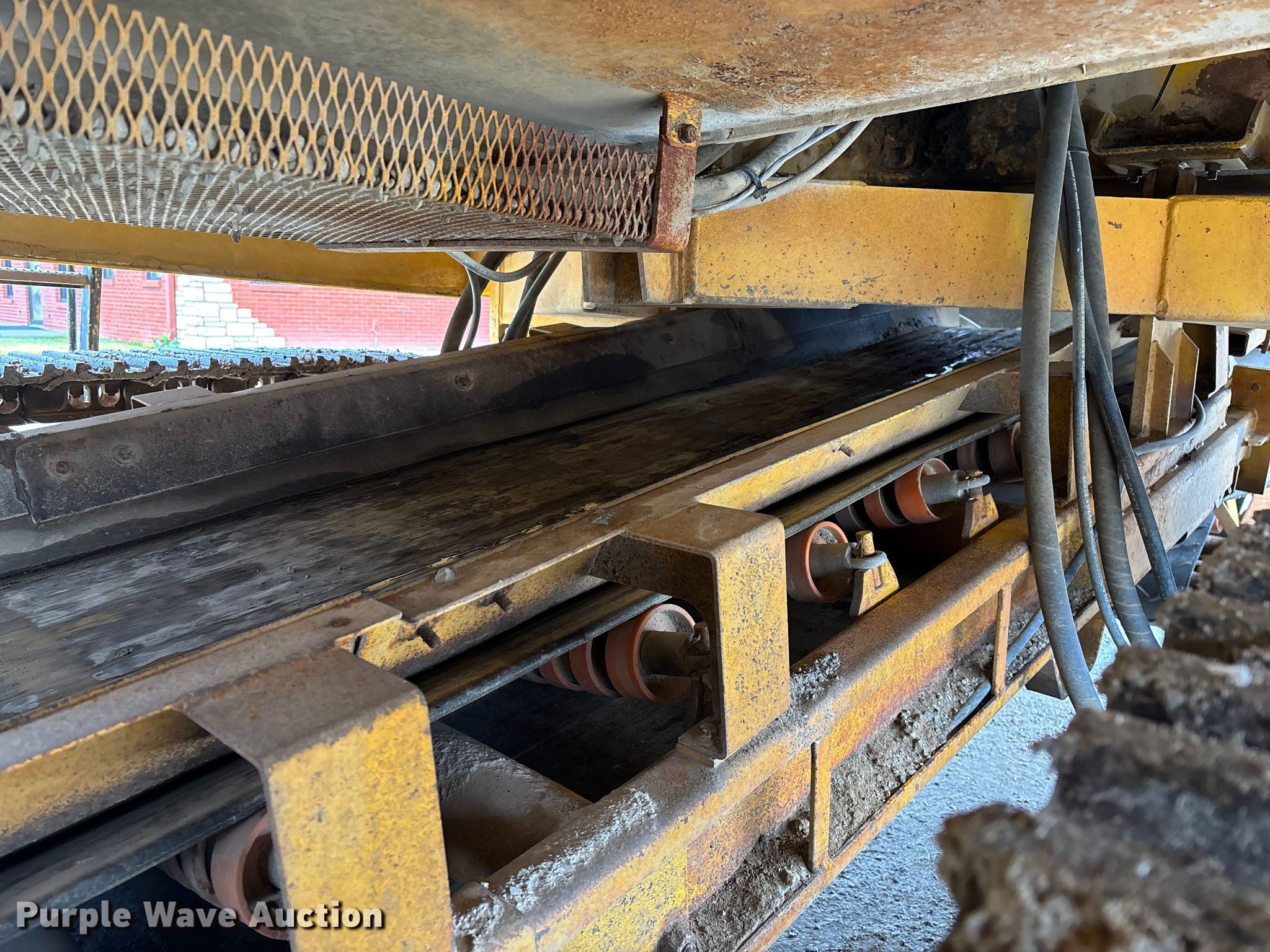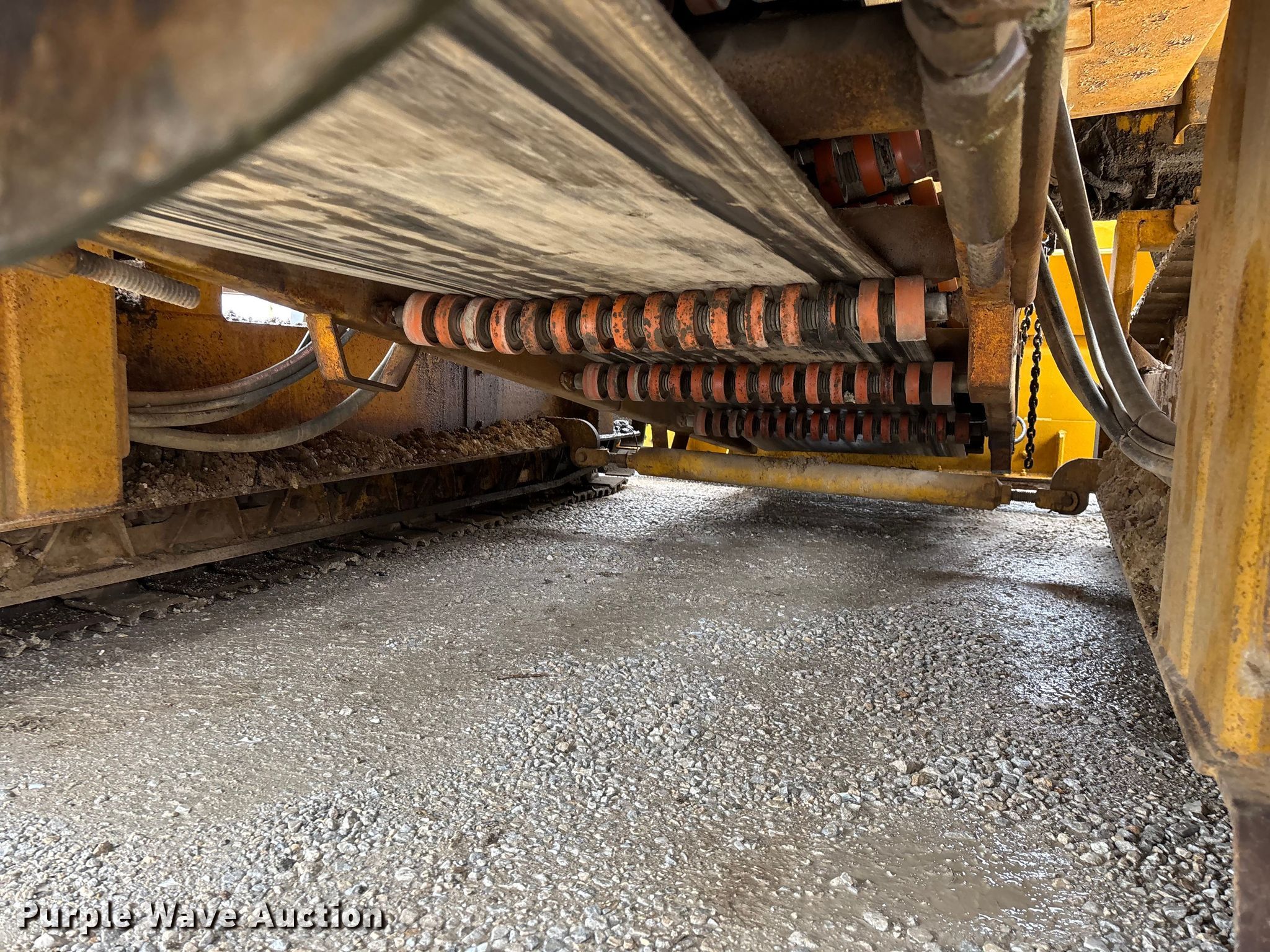 Gomaco 9000 trimmer. Hours: Unknown, Serial: 909000-042. Engine Caterpillar C-10, Serial: BCX02260, Displacement: 10.3L, Cylinders: 6, Fuel type: Diesel, HP: 439, kW: 327. Transmission Hydrostatic. Features 14' trimmer head, Transfer conveyor Size: 12' 2 L x 30" W, Rear conveyor Size: 24' L x 29.5" W. Tracks Width: 13.5", Steel. Notes Hour meter illumination issues, Hydraulic hose issues. Hardy Holding Group. Pilot Grove, MO 65276