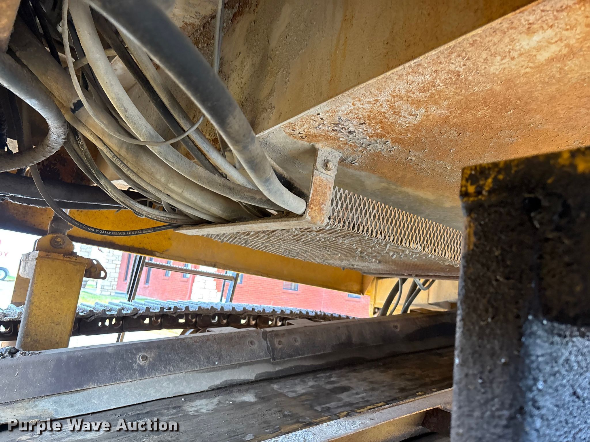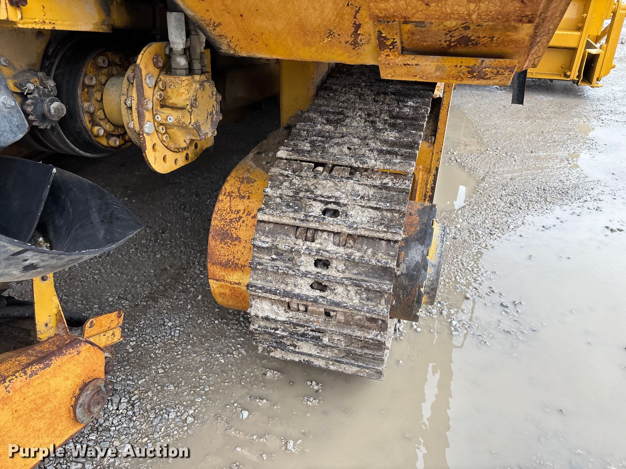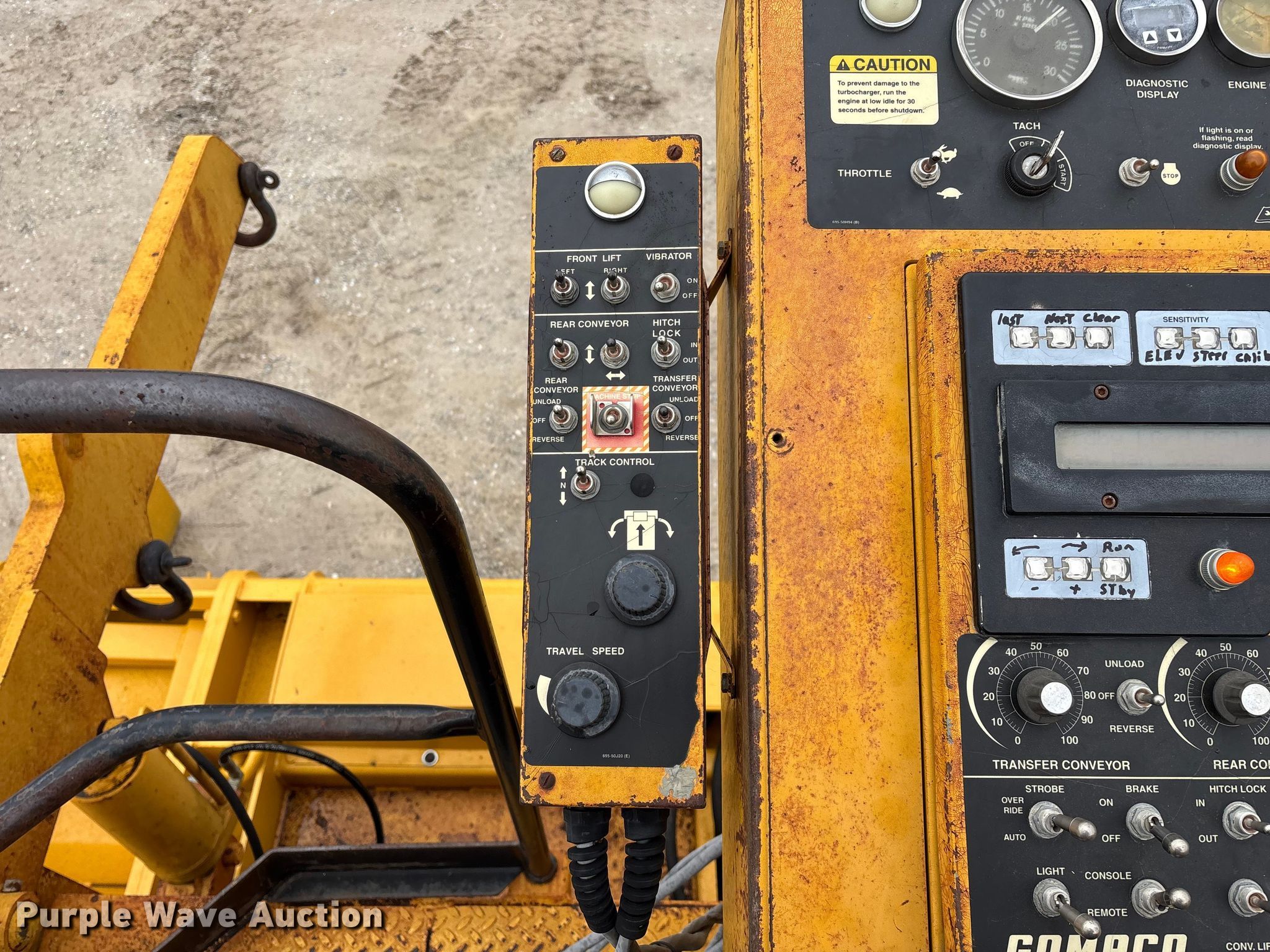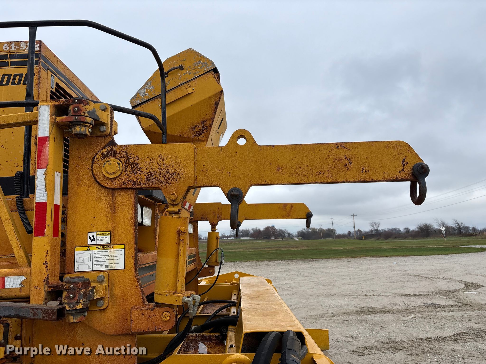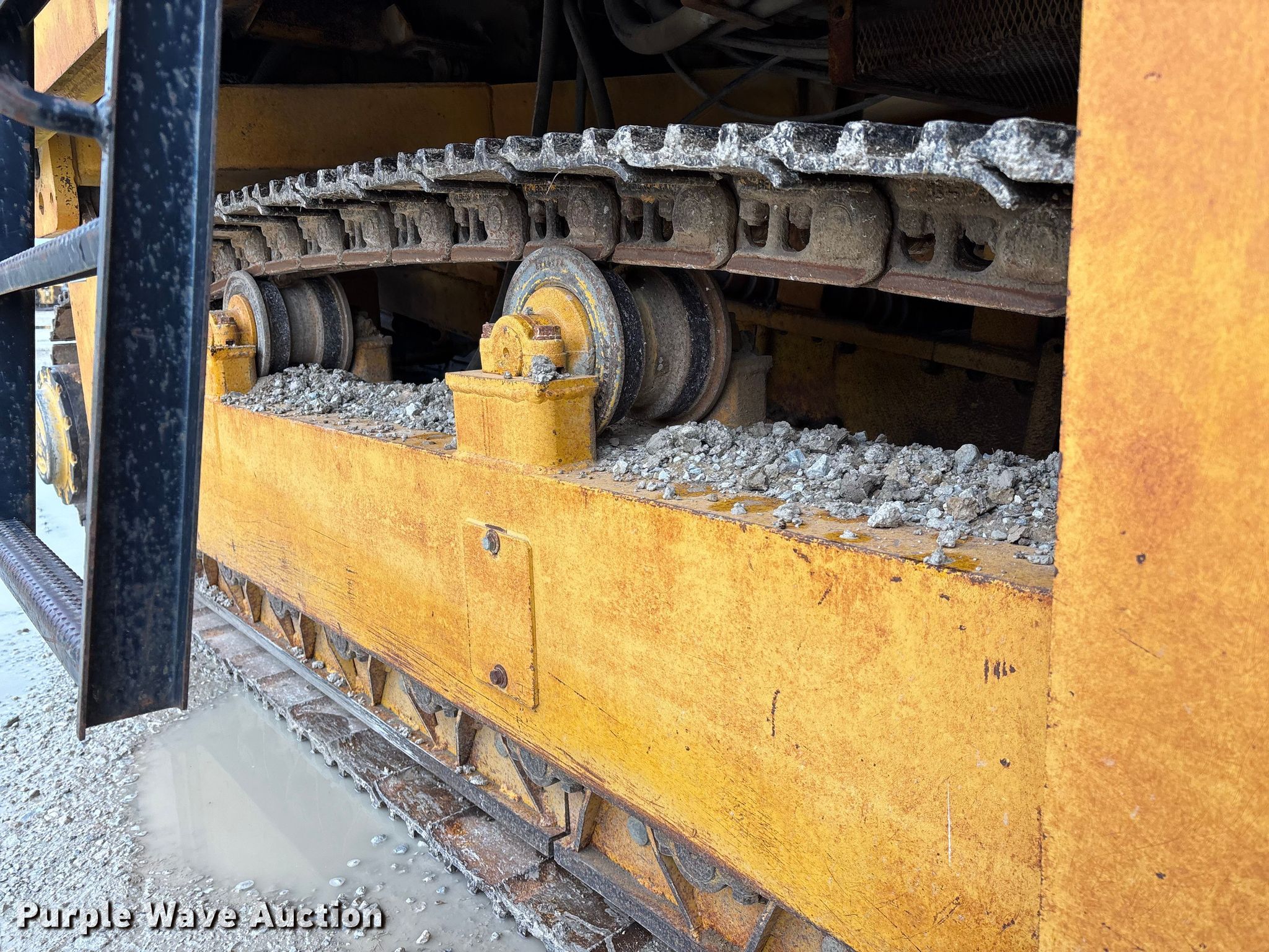 Gomaco 9000 trimmer. Hours: Unknown, Serial: 909000-042. Engine Caterpillar C-10, Serial: BCX02260, Displacement: 10.3L, Cylinders: 6, Fuel type: Diesel, HP: 439, kW: 327. Transmission Hydrostatic. Features 14' trimmer head, Transfer conveyor Size: 12' 2 L x 30" W, Rear conveyor Size: 24' L x 29.5" W. Tracks Width: 13.5", Steel. Notes Hour meter illumination issues, Hydraulic hose issues. Hardy Holding Group. Pilot Grove, MO 65276
