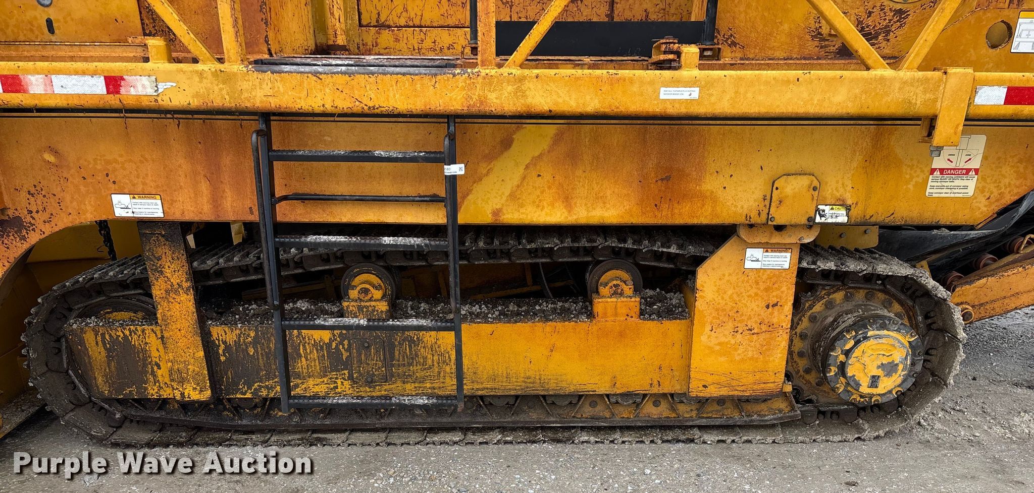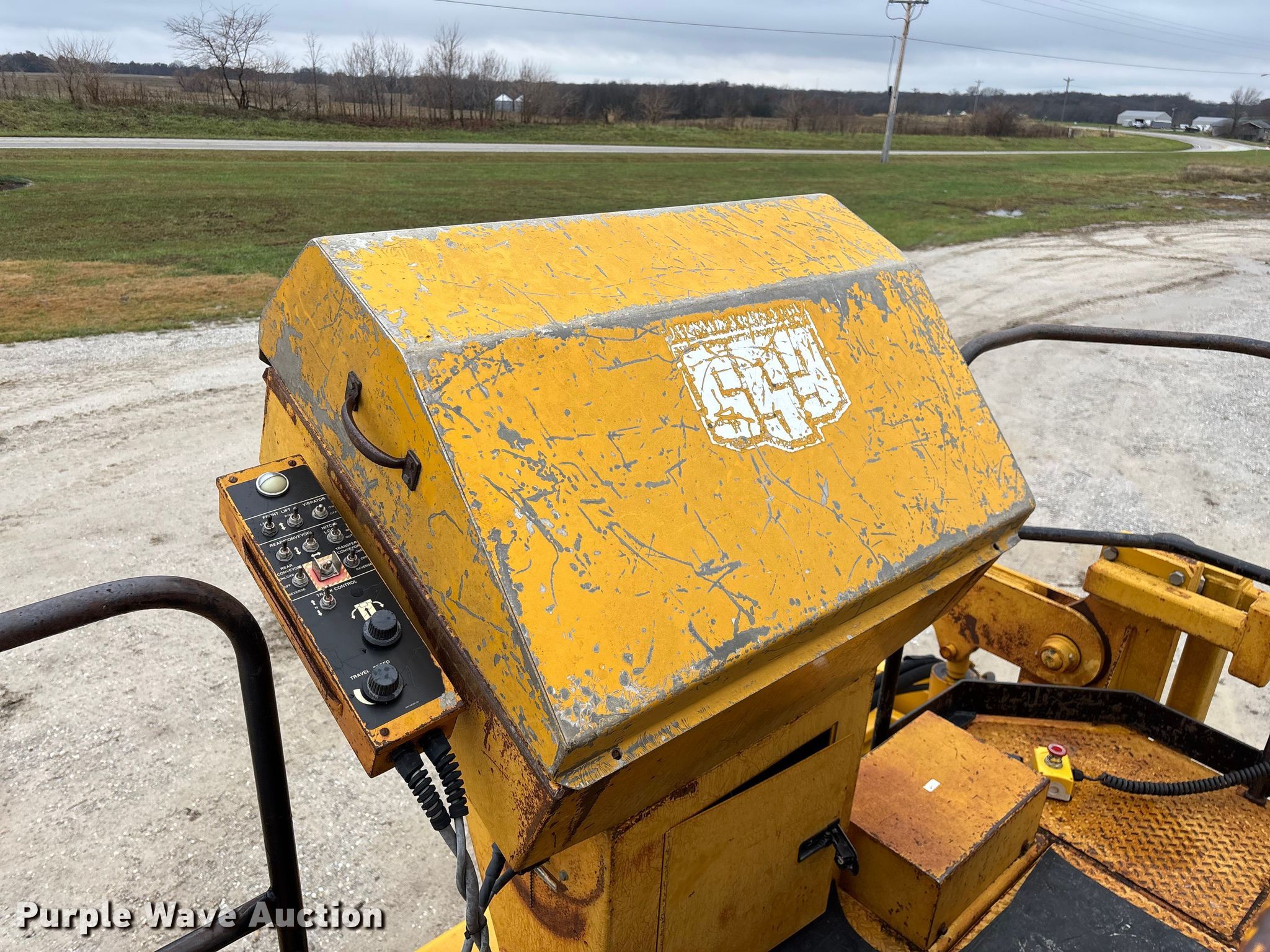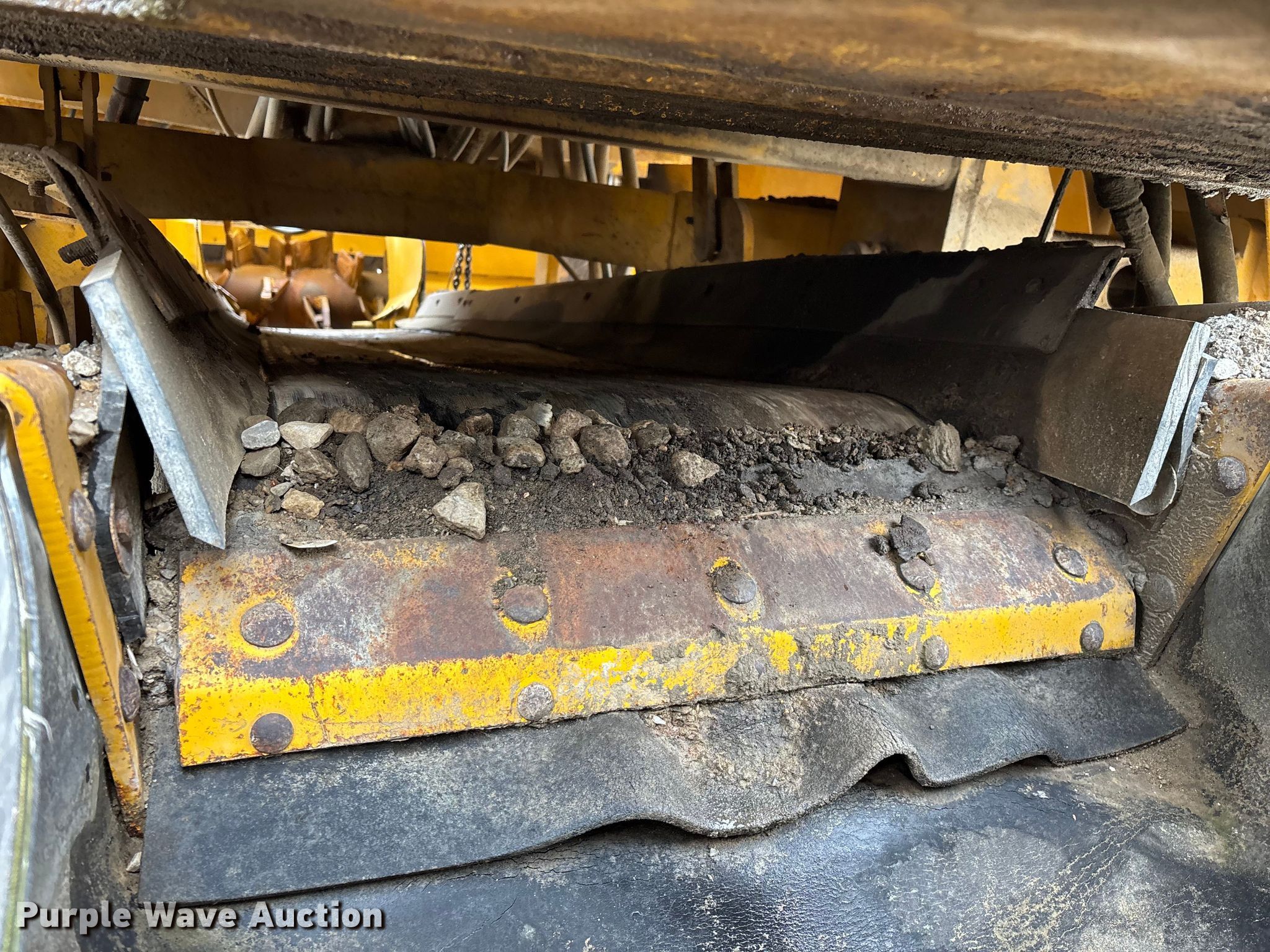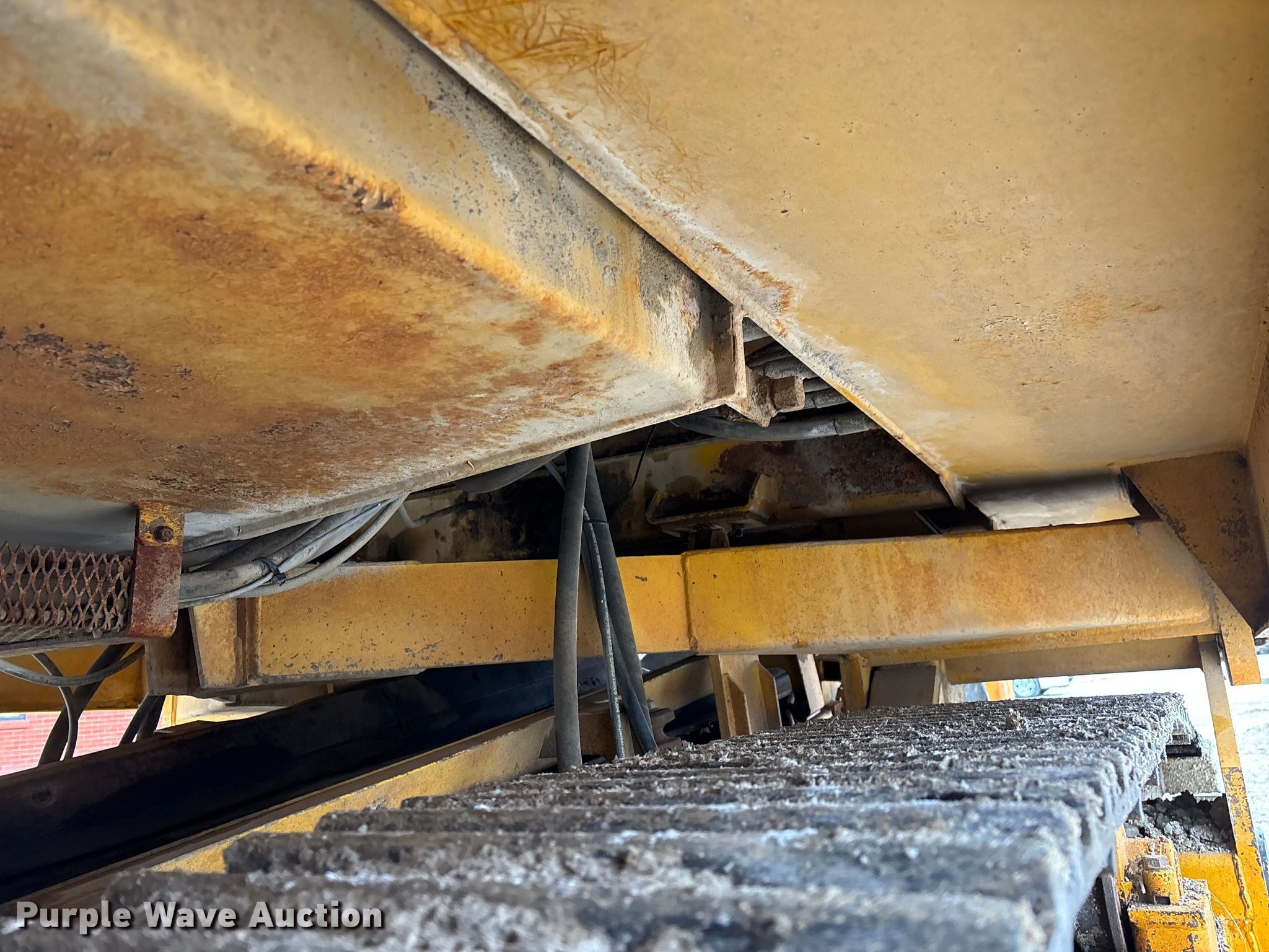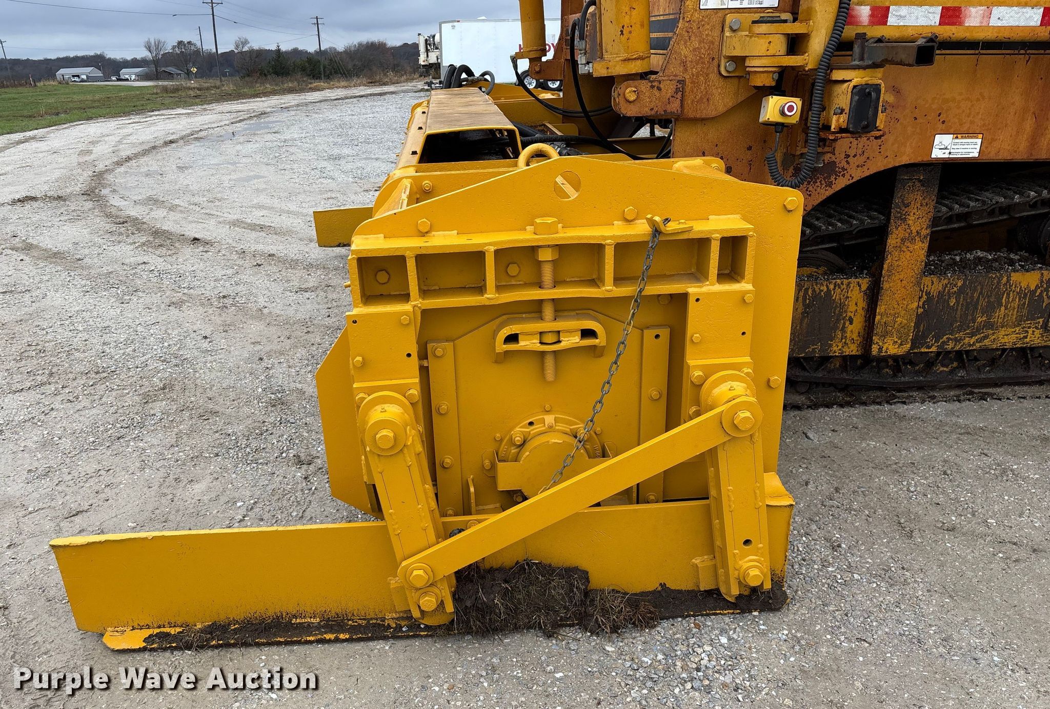 Gomaco 9000 trimmer. Hours: Unknown, Serial: 909000-042. Engine Caterpillar C-10, Serial: BCX02260, Displacement: 10.3L, Cylinders: 6, Fuel type: Diesel, HP: 439, kW: 327. Transmission Hydrostatic. Features 14' trimmer head, Transfer conveyor Size: 12' 2 L x 30" W, Rear conveyor Size: 24' L x 29.5" W. Tracks Width: 13.5", Steel. Notes Hour meter illumination issues, Hydraulic hose issues. Hardy Holding Group. Pilot Grove, MO 65276