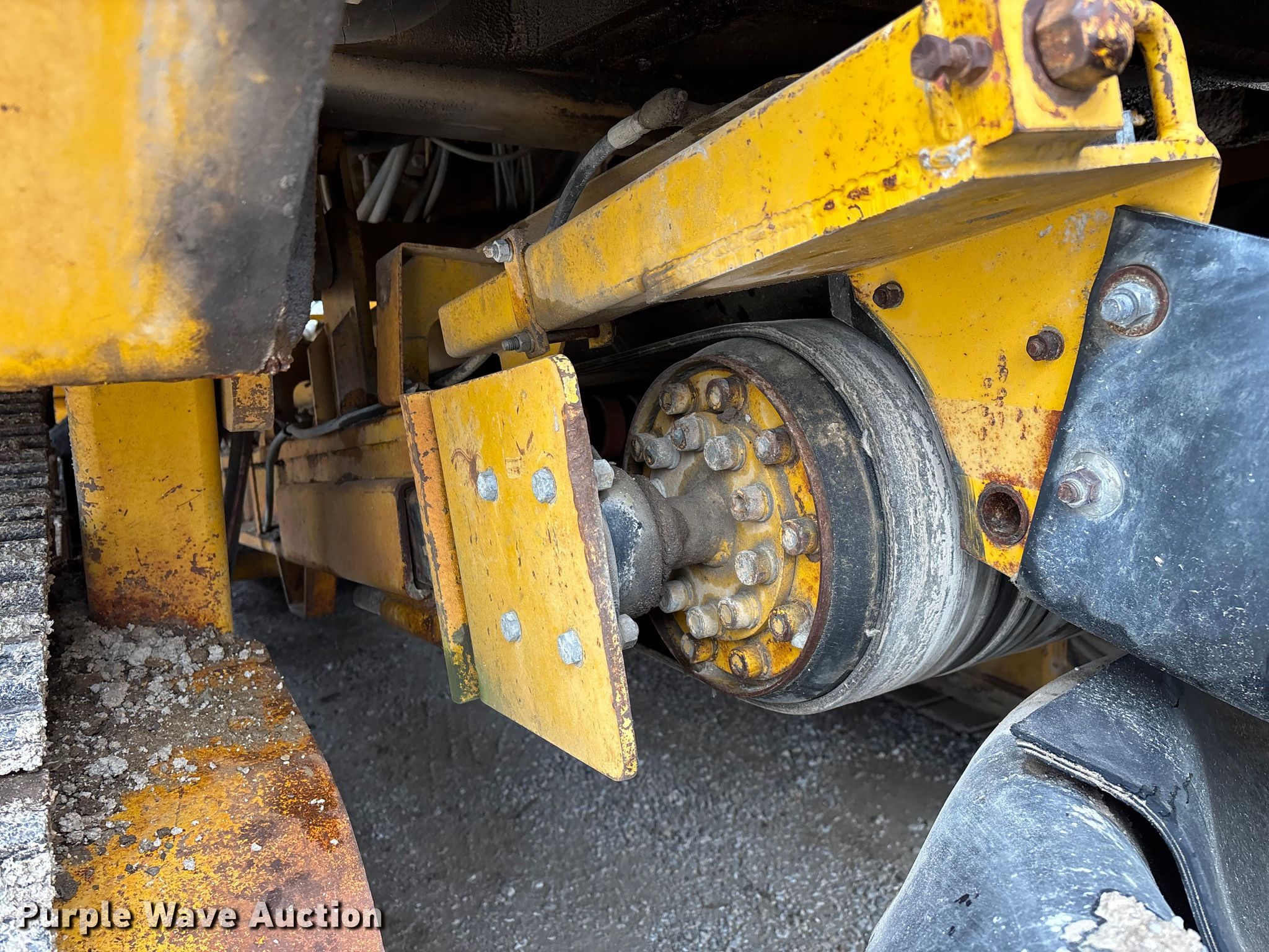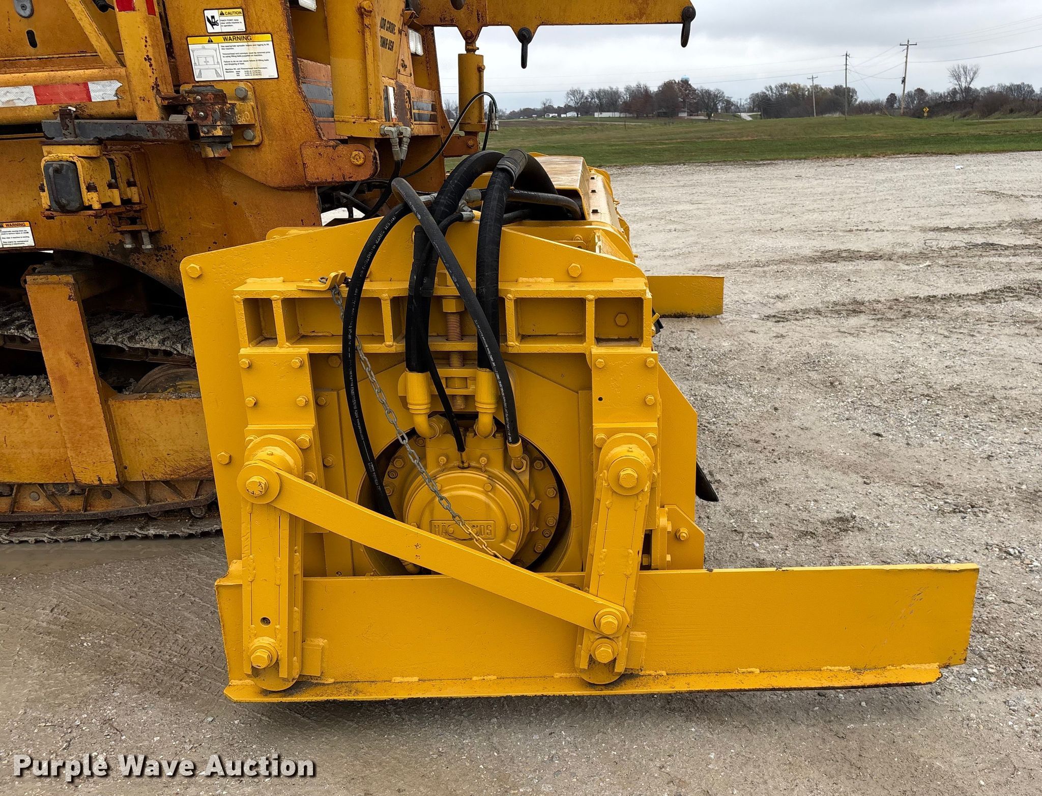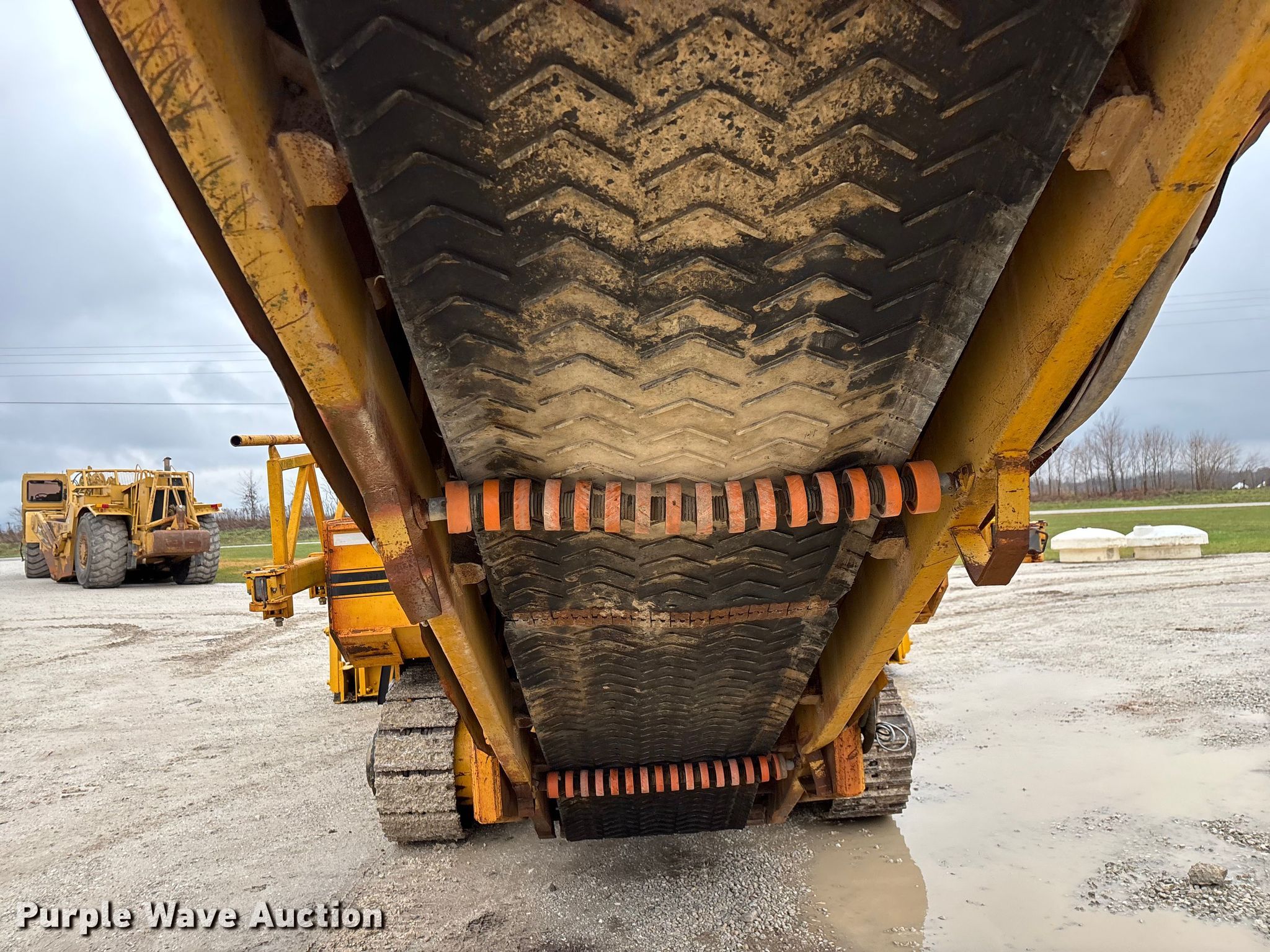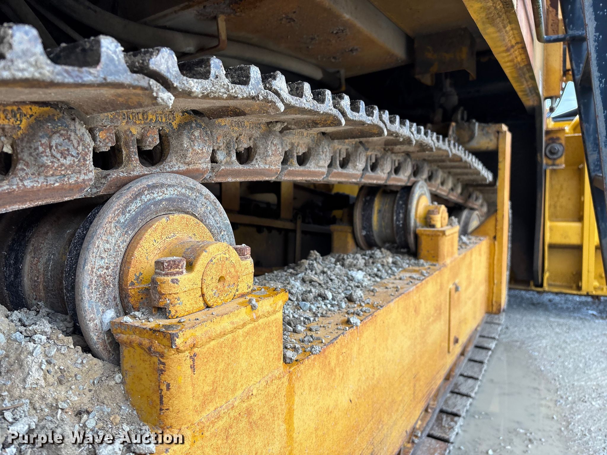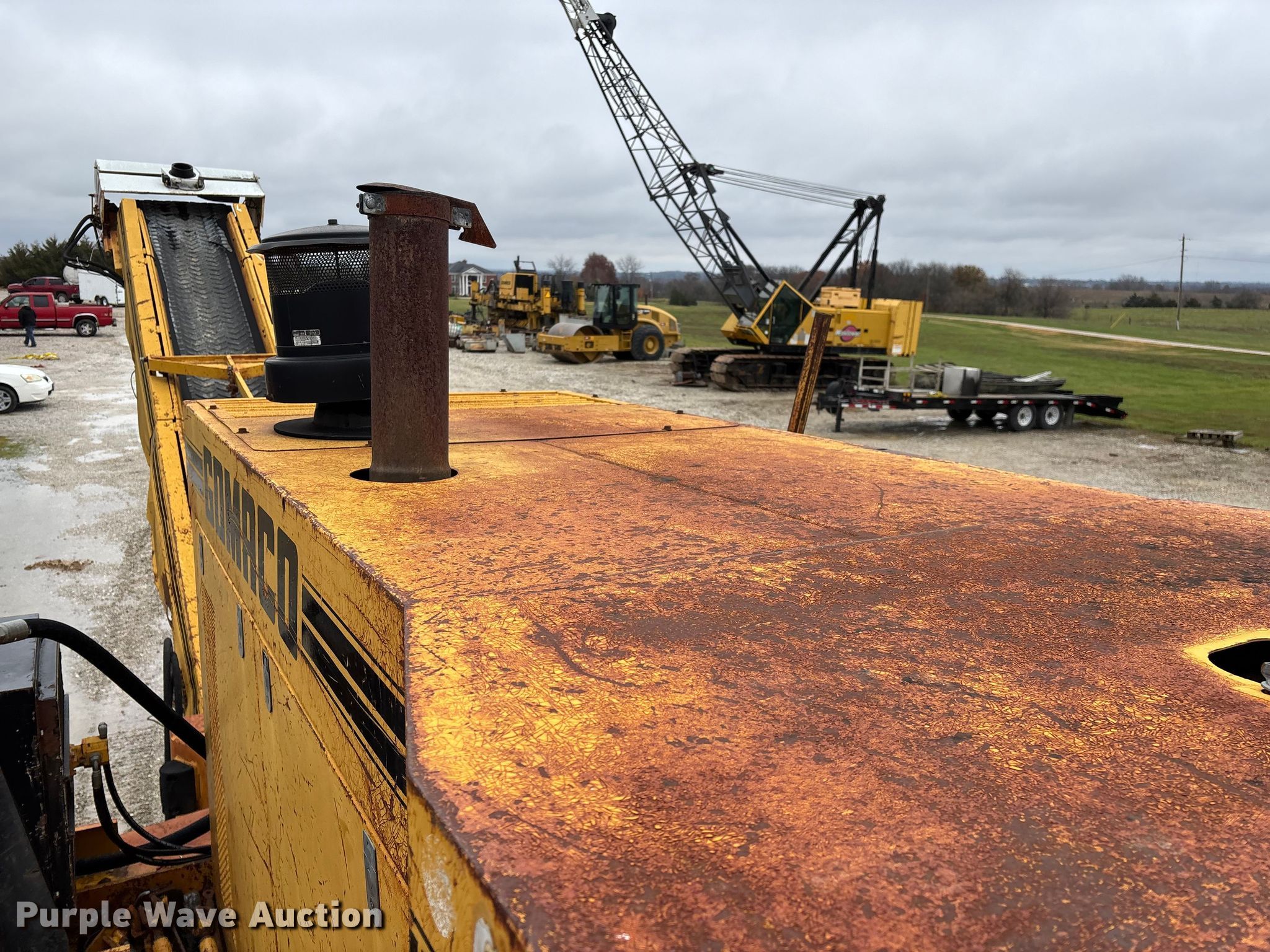 Gomaco 9000 trimmer. Hours: Unknown, Serial: 909000-042. Engine Caterpillar C-10, Serial: BCX02260, Displacement: 10.3L, Cylinders: 6, Fuel type: Diesel, HP: 439, kW: 327. Transmission Hydrostatic. Features 14' trimmer head, Transfer conveyor Size: 12' 2 L x 30" W, Rear conveyor Size: 24' L x 29.5" W. Tracks Width: 13.5", Steel. Notes Hour meter illumination issues, Hydraulic hose issues. Hardy Holding Group. Pilot Grove, MO 65276