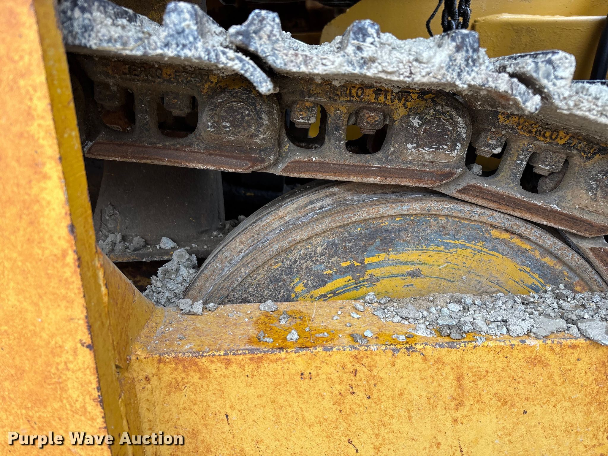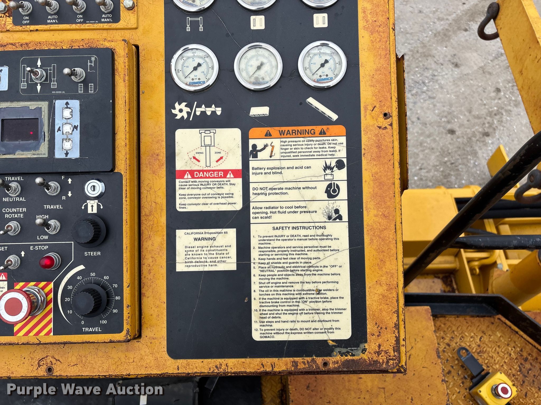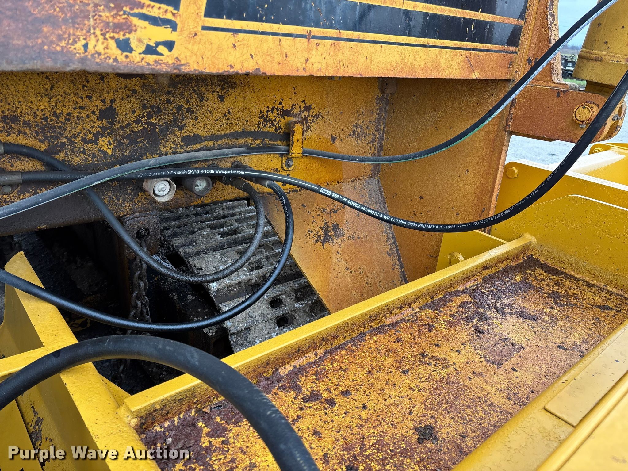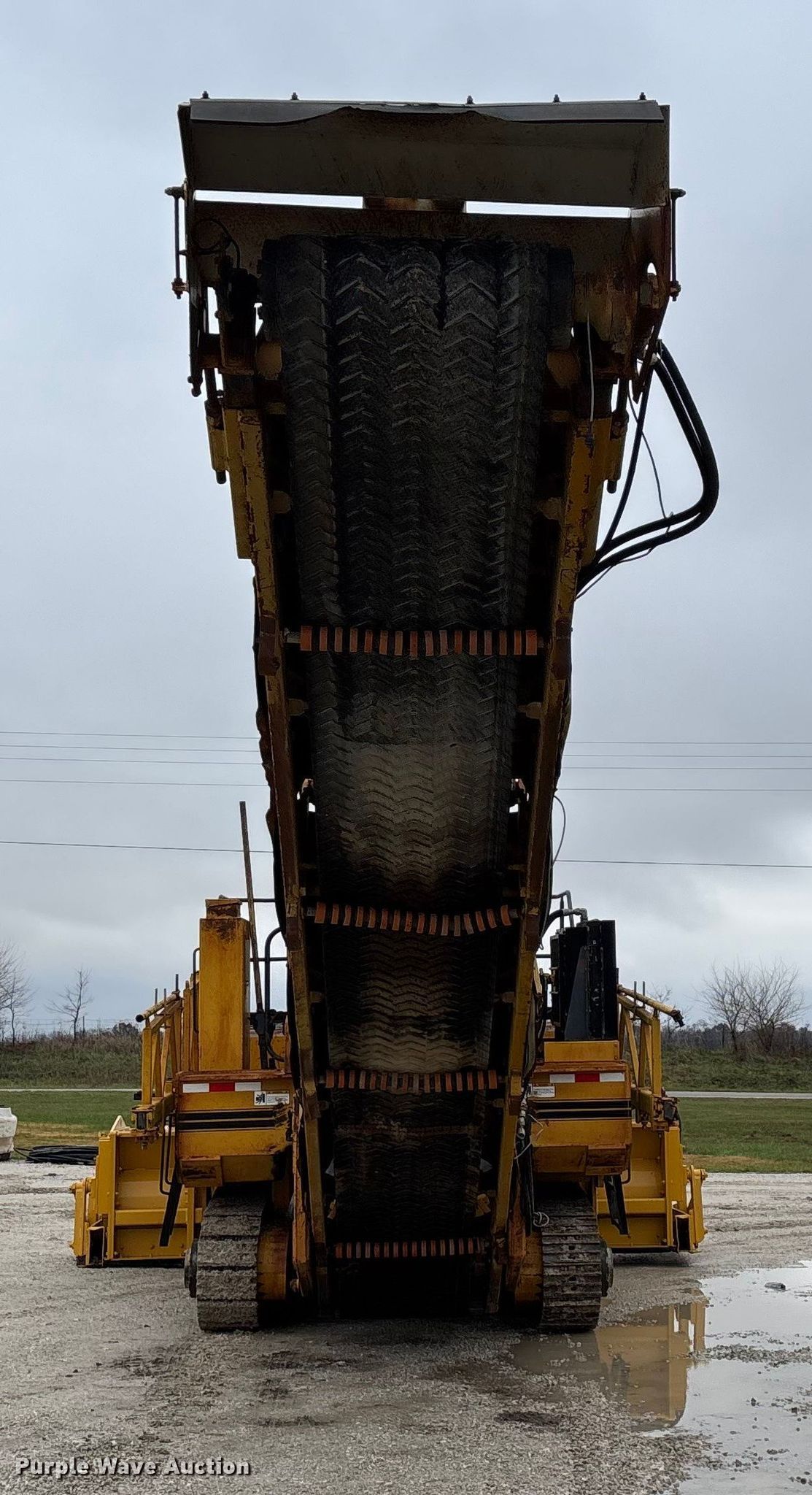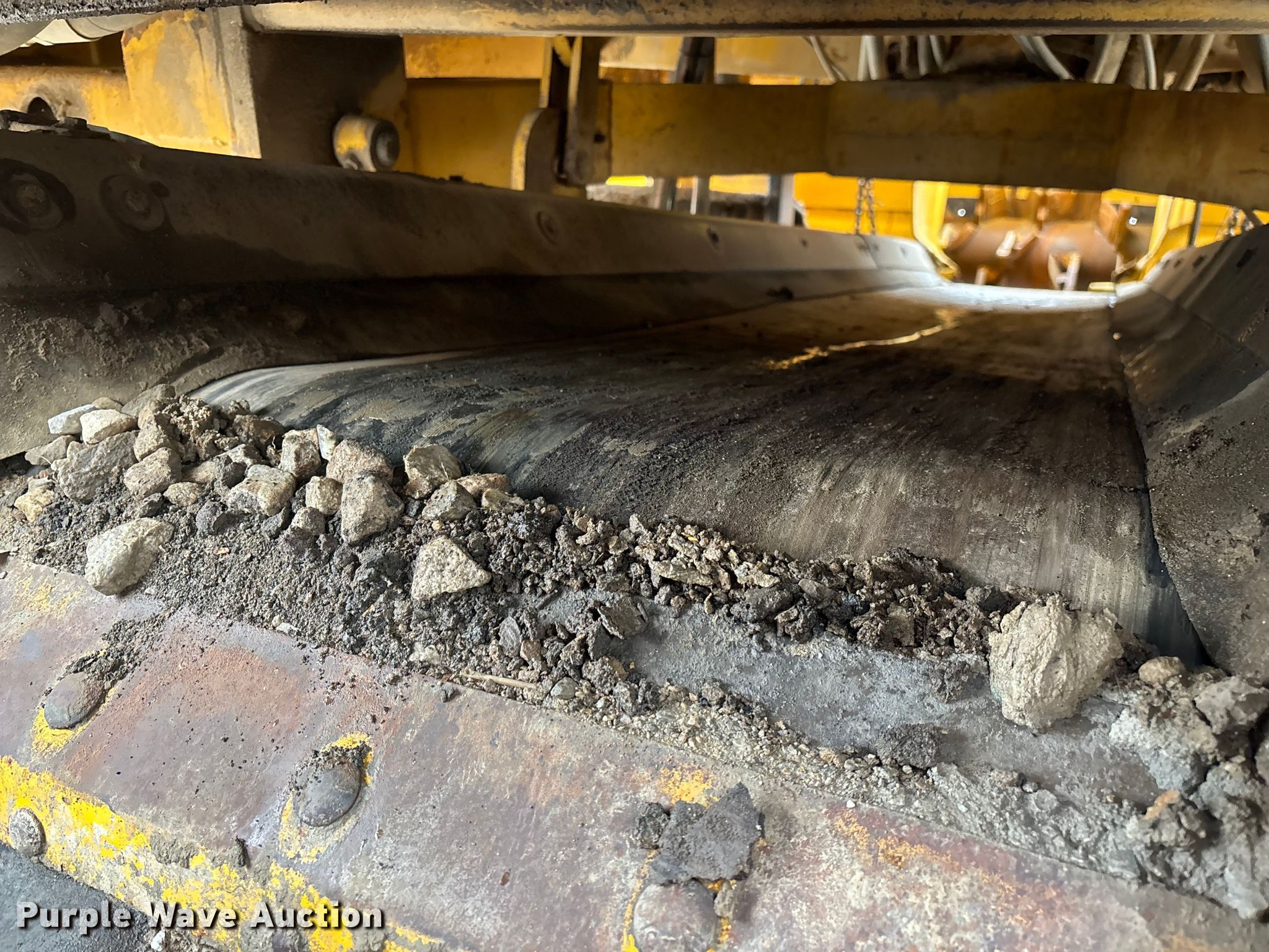 Gomaco 9000 trimmer. Hours: Unknown, Serial: 909000-042. Engine Caterpillar C-10, Serial: BCX02260, Displacement: 10.3L, Cylinders: 6, Fuel type: Diesel, HP: 439, kW: 327. Transmission Hydrostatic. Features 14' trimmer head, Transfer conveyor Size: 12' 2 L x 30" W, Rear conveyor Size: 24' L x 29.5" W. Tracks Width: 13.5", Steel. Notes Hour meter illumination issues, Hydraulic hose issues. Hardy Holding Group. Pilot Grove, MO 65276