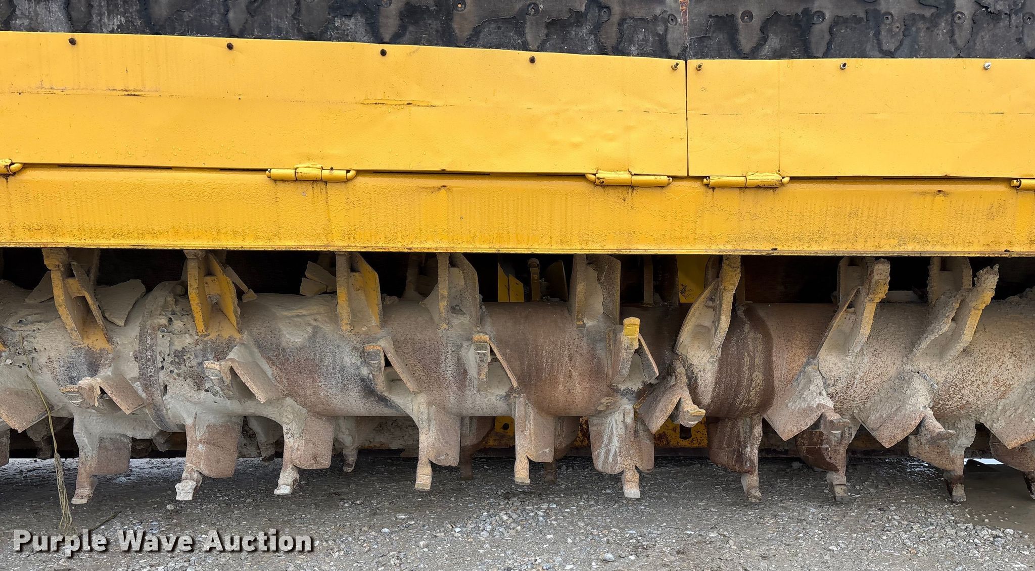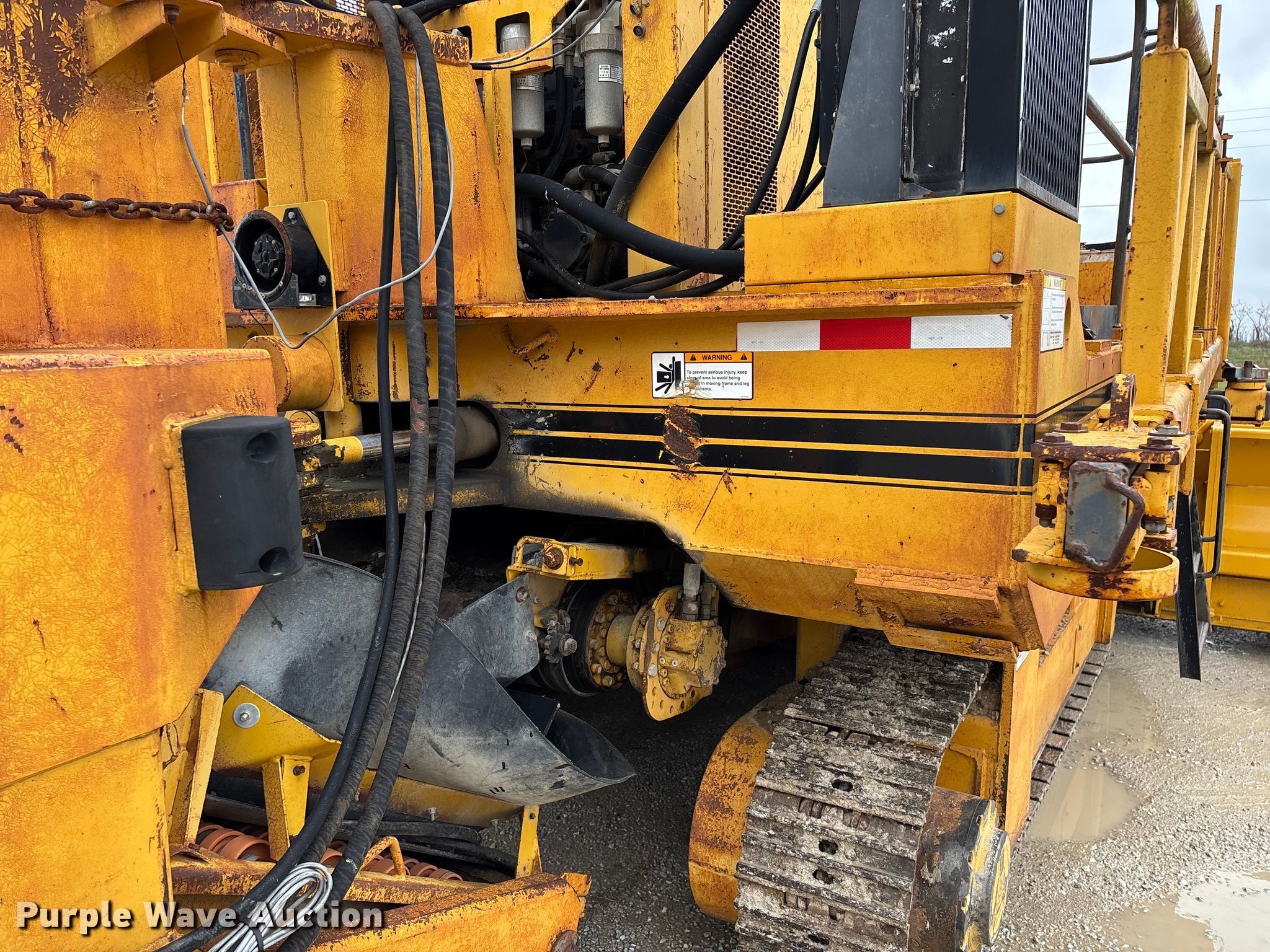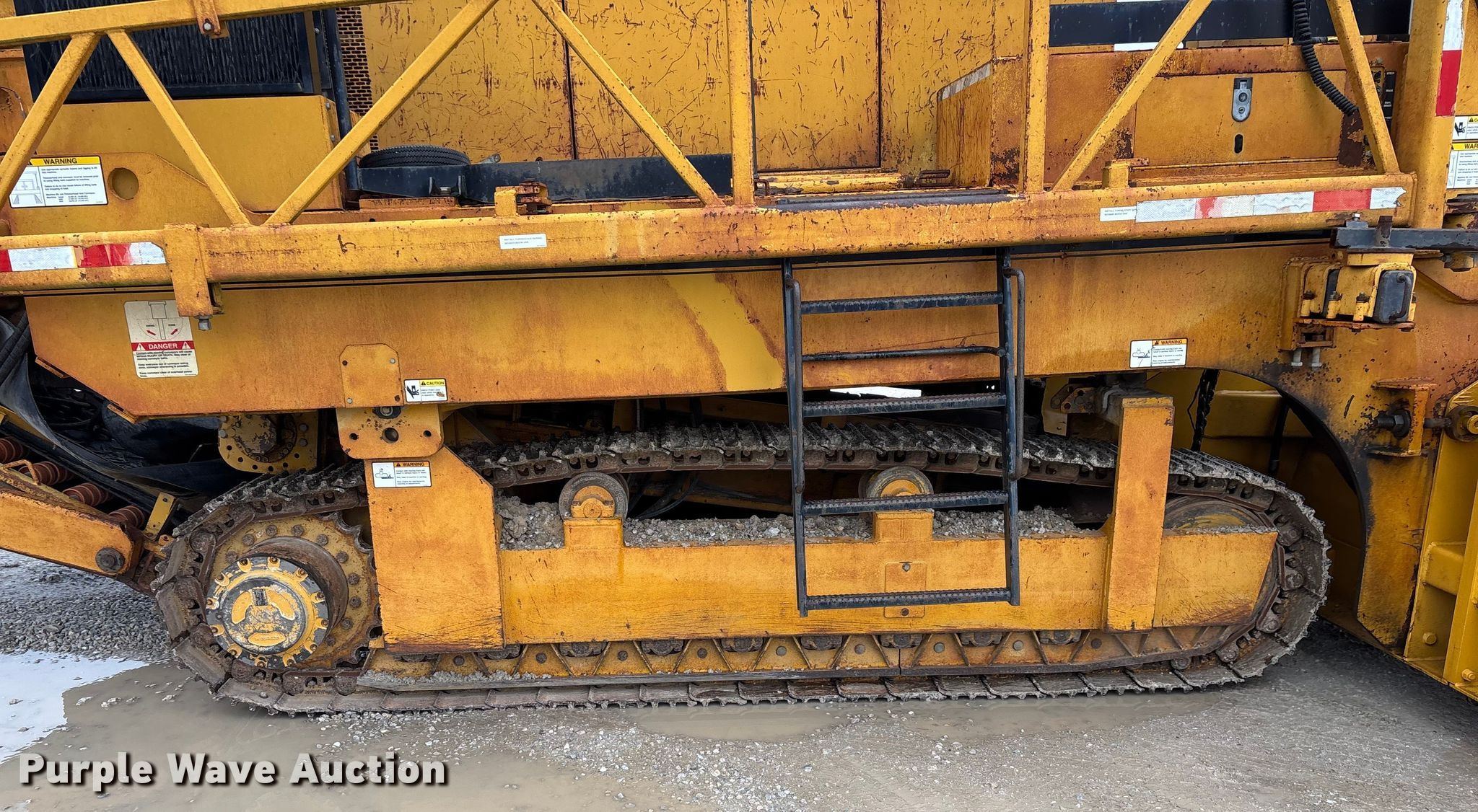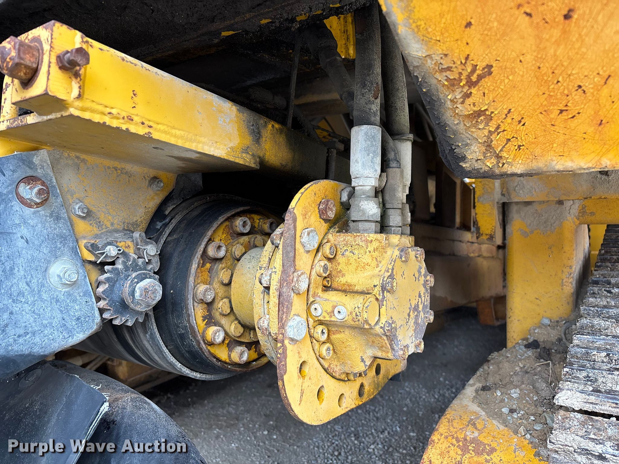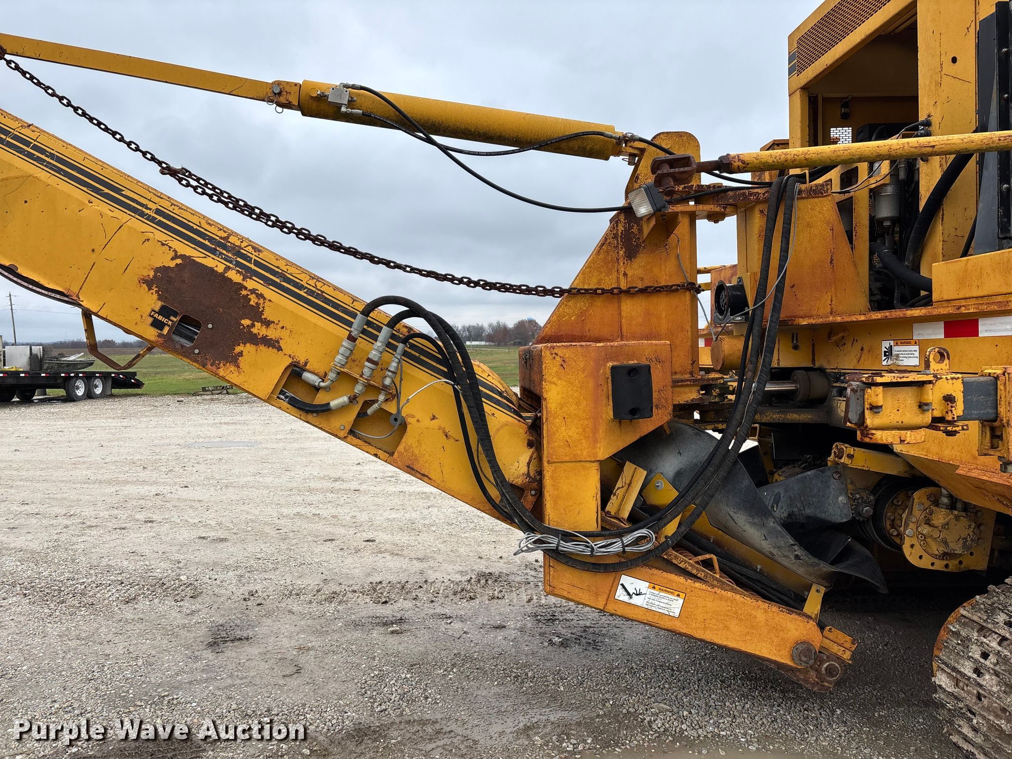 Gomaco 9000 trimmer. Hours: Unknown, Serial: 909000-042. Engine Caterpillar C-10, Serial: BCX02260, Displacement: 10.3L, Cylinders: 6, Fuel type: Diesel, HP: 439, kW: 327. Transmission Hydrostatic. Features 14' trimmer head, Transfer conveyor Size: 12' 2 L x 30" W, Rear conveyor Size: 24' L x 29.5" W. Tracks Width: 13.5", Steel. Notes Hour meter illumination issues, Hydraulic hose issues. Hardy Holding Group. Pilot Grove, MO 65276