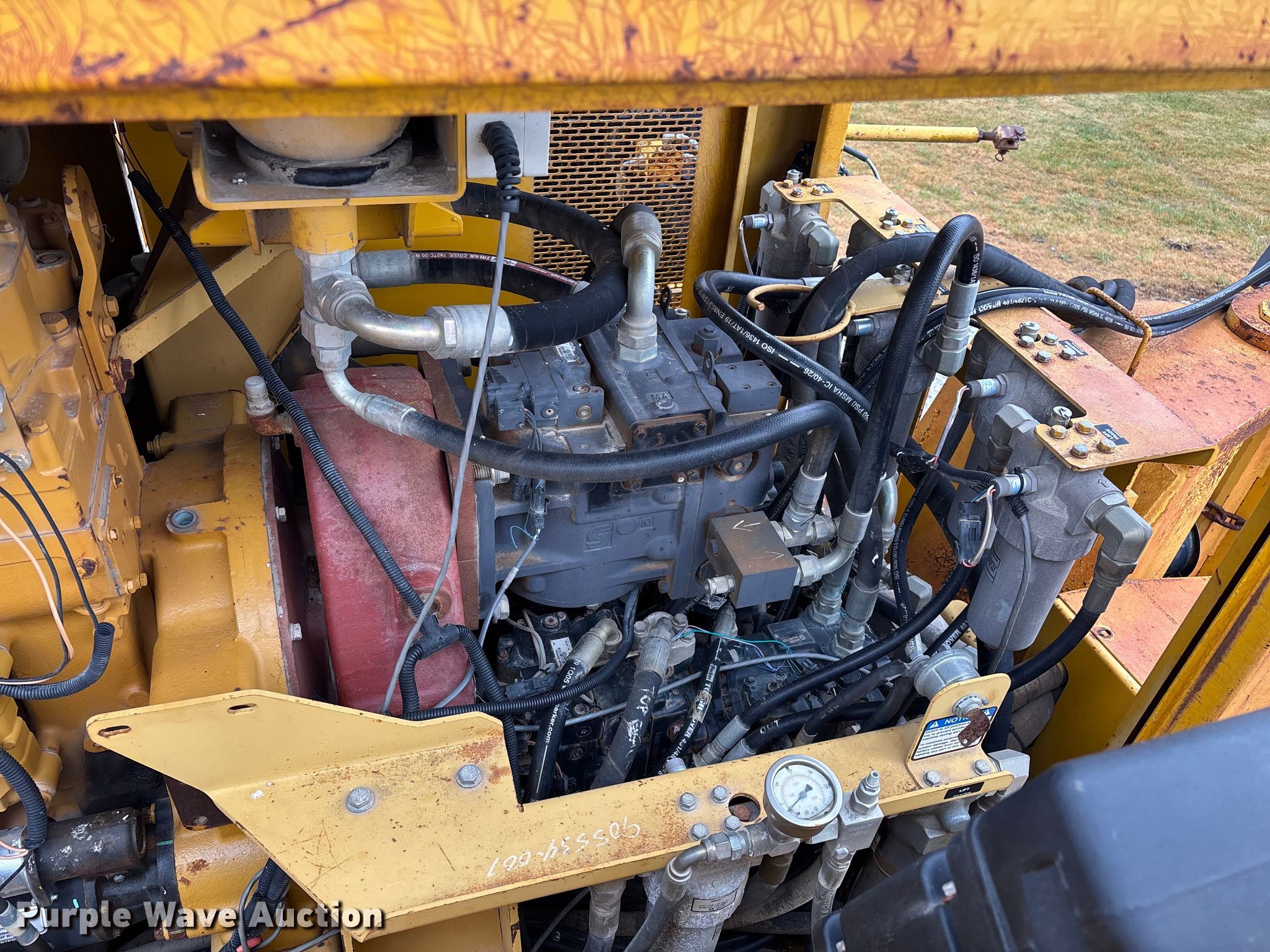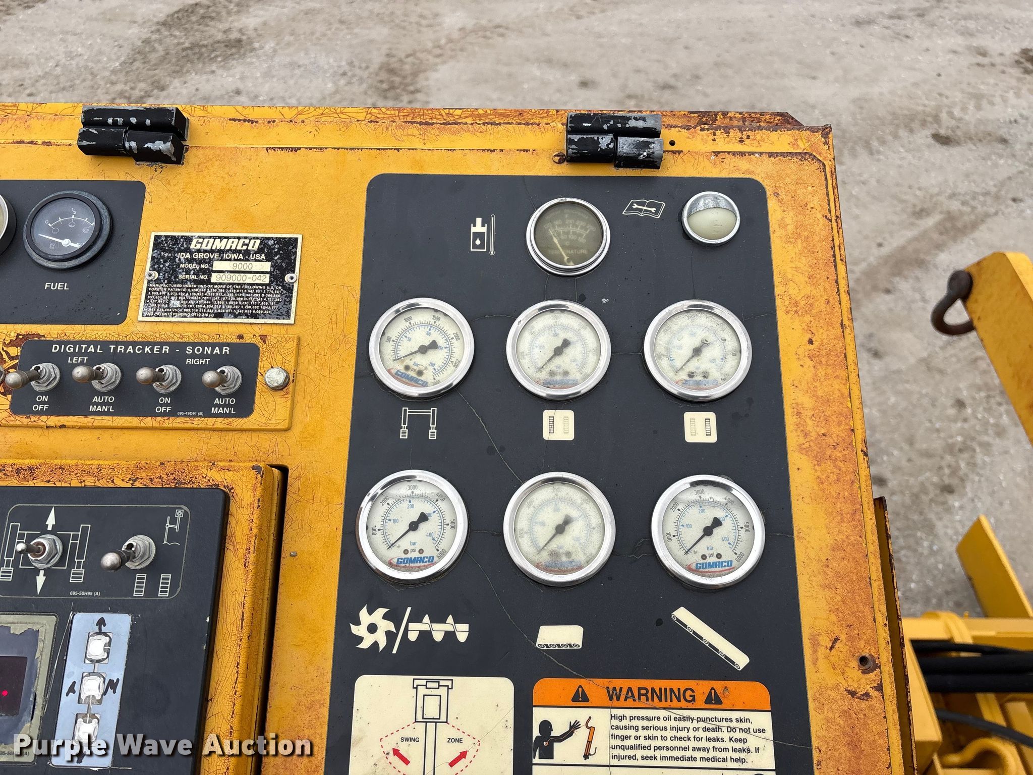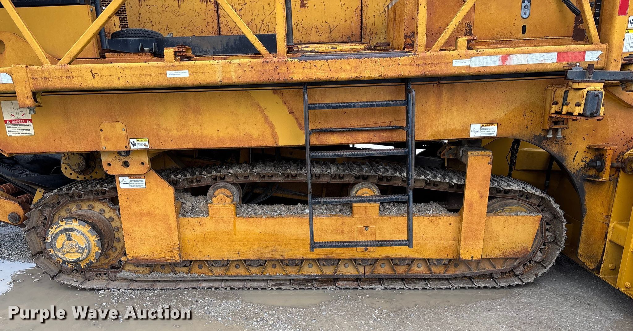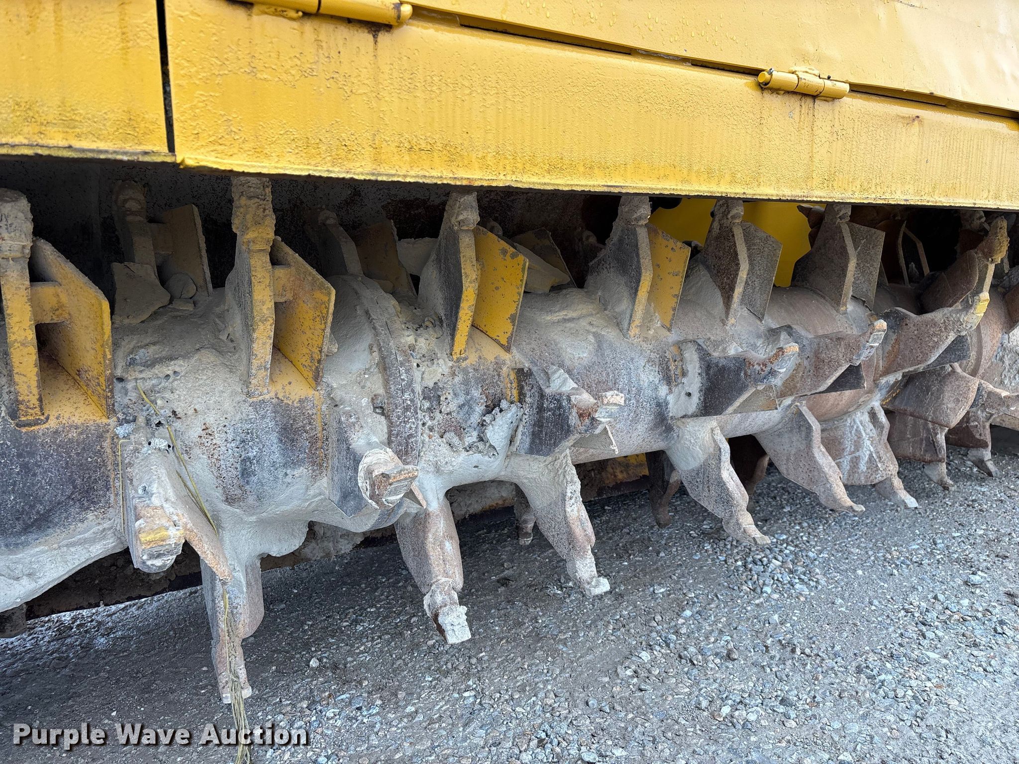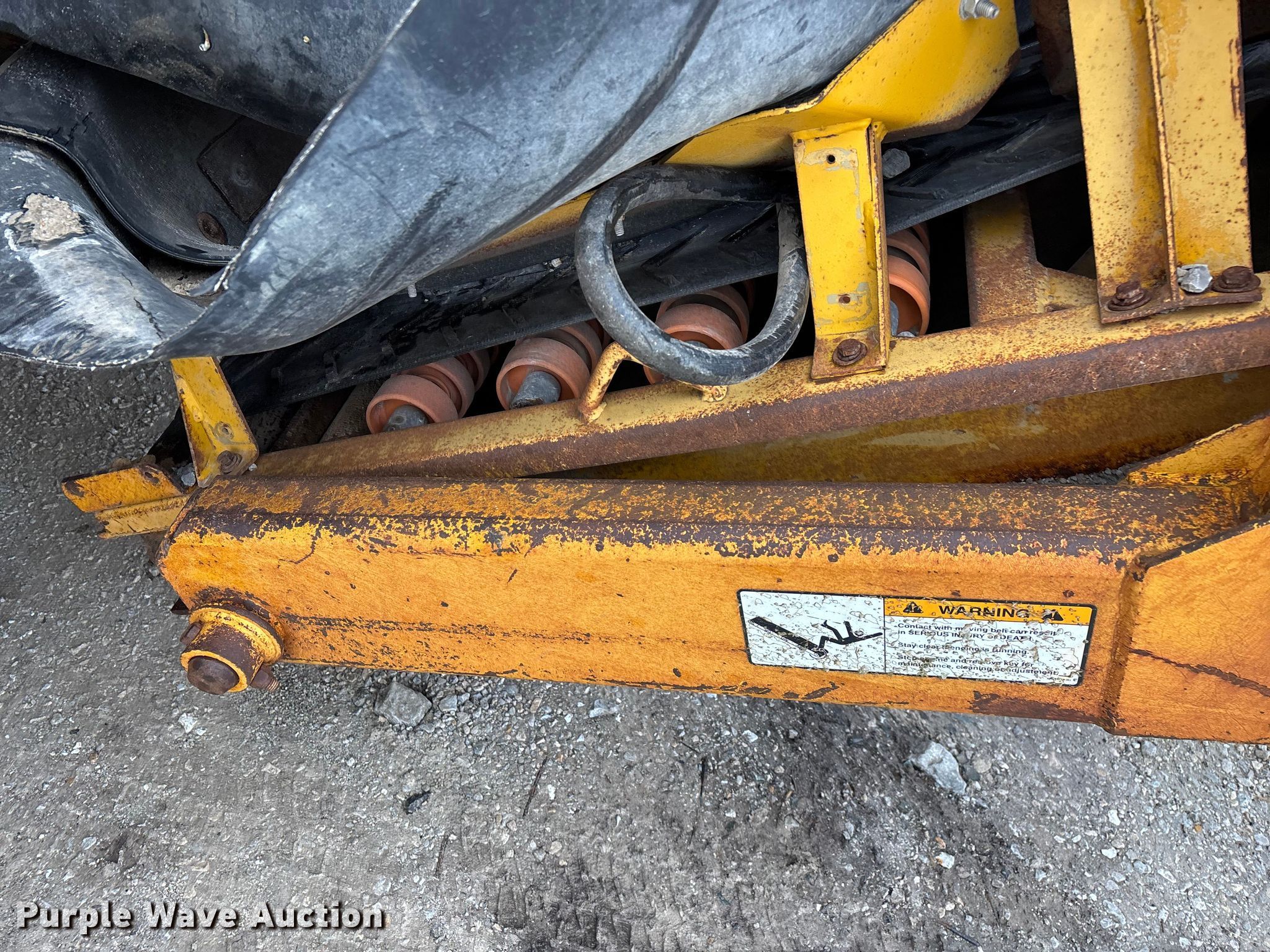 Gomaco 9000 trimmer. Hours: Unknown, Serial: 909000-042. Engine Caterpillar C-10, Serial: BCX02260, Displacement: 10.3L, Cylinders: 6, Fuel type: Diesel, HP: 439, kW: 327. Transmission Hydrostatic. Features 14' trimmer head, Transfer conveyor Size: 12' 2 L x 30" W, Rear conveyor Size: 24' L x 29.5" W. Tracks Width: 13.5", Steel. Notes Hour meter illumination issues, Hydraulic hose issues. Hardy Holding Group. Pilot Grove, MO 65276