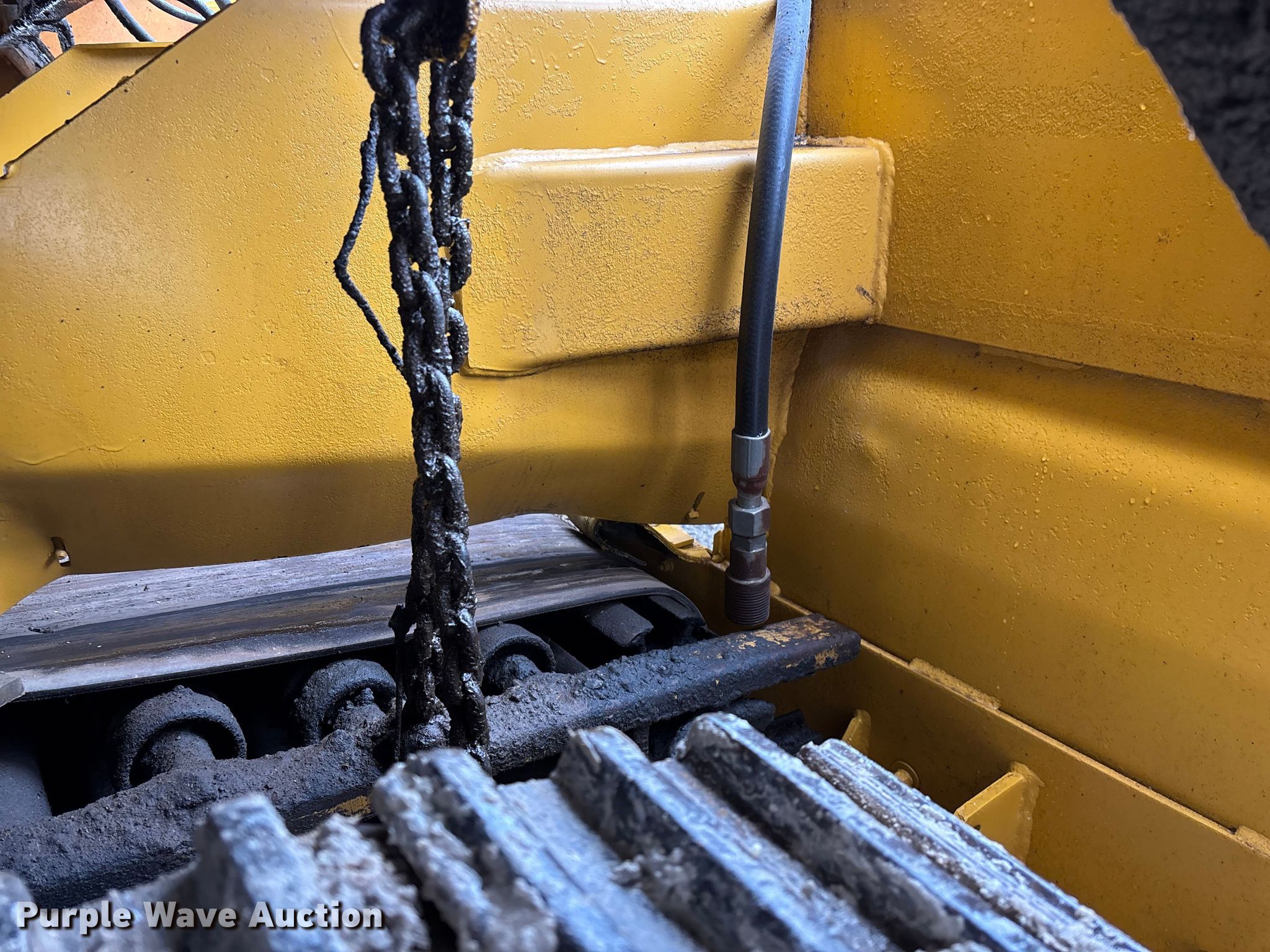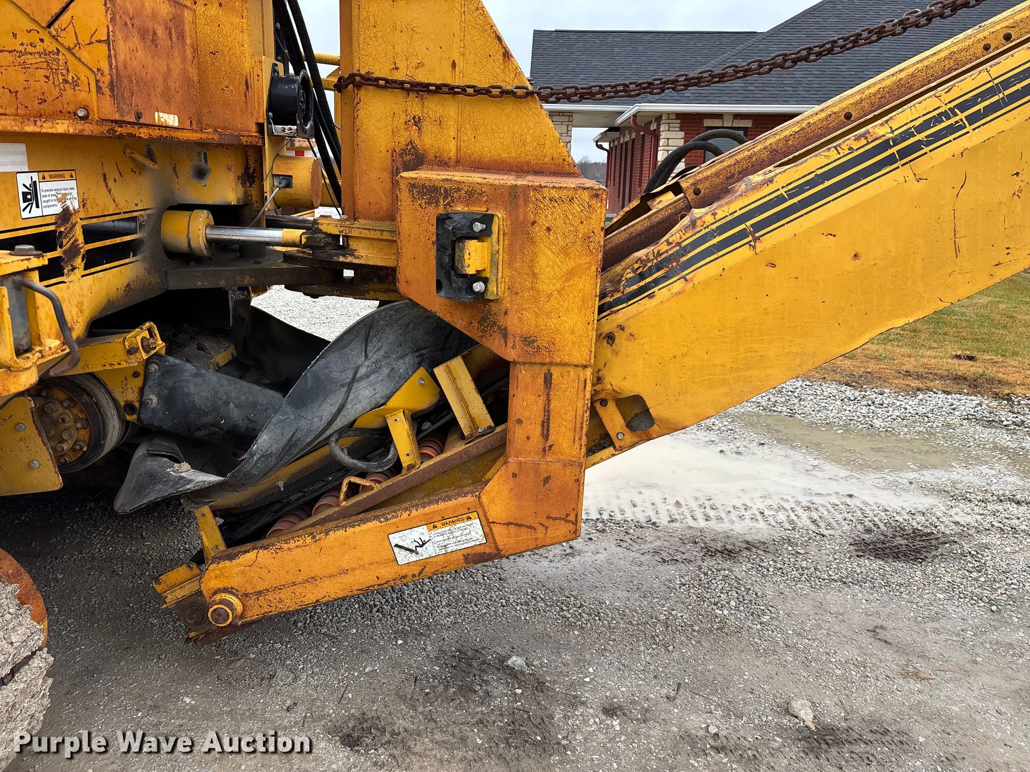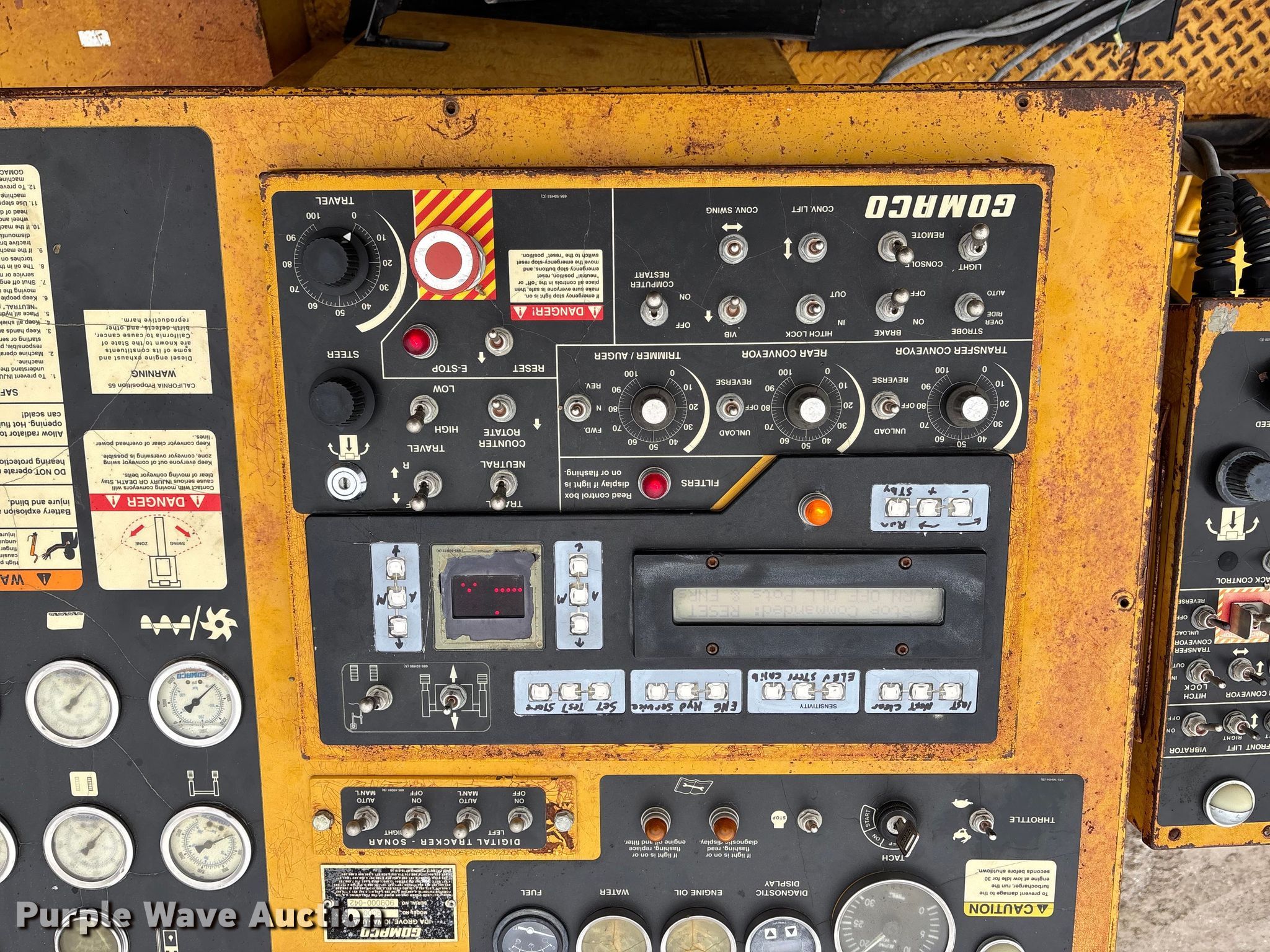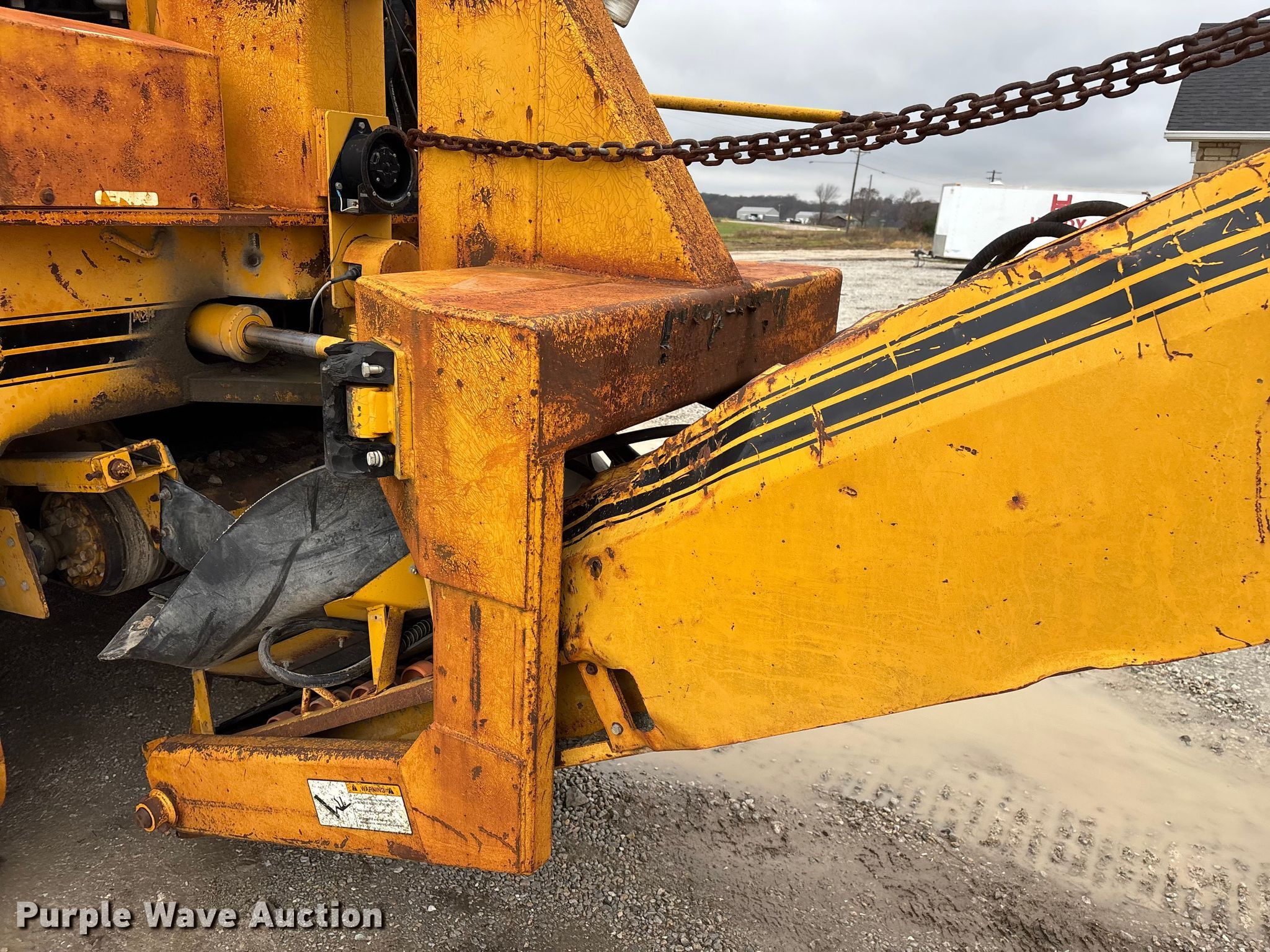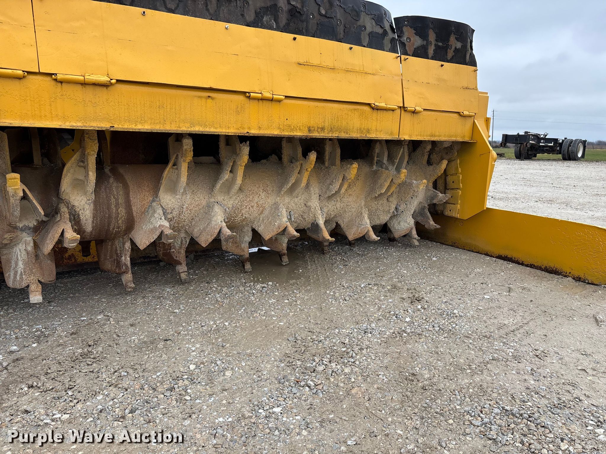 Gomaco 9000 trimmer. Hours: Unknown, Serial: 909000-042. Engine Caterpillar C-10, Serial: BCX02260, Displacement: 10.3L, Cylinders: 6, Fuel type: Diesel, HP: 439, kW: 327. Transmission Hydrostatic. Features 14' trimmer head, Transfer conveyor Size: 12' 2 L x 30" W, Rear conveyor Size: 24' L x 29.5" W. Tracks Width: 13.5", Steel. Notes Hour meter illumination issues, Hydraulic hose issues. Hardy Holding Group. Pilot Grove, MO 65276