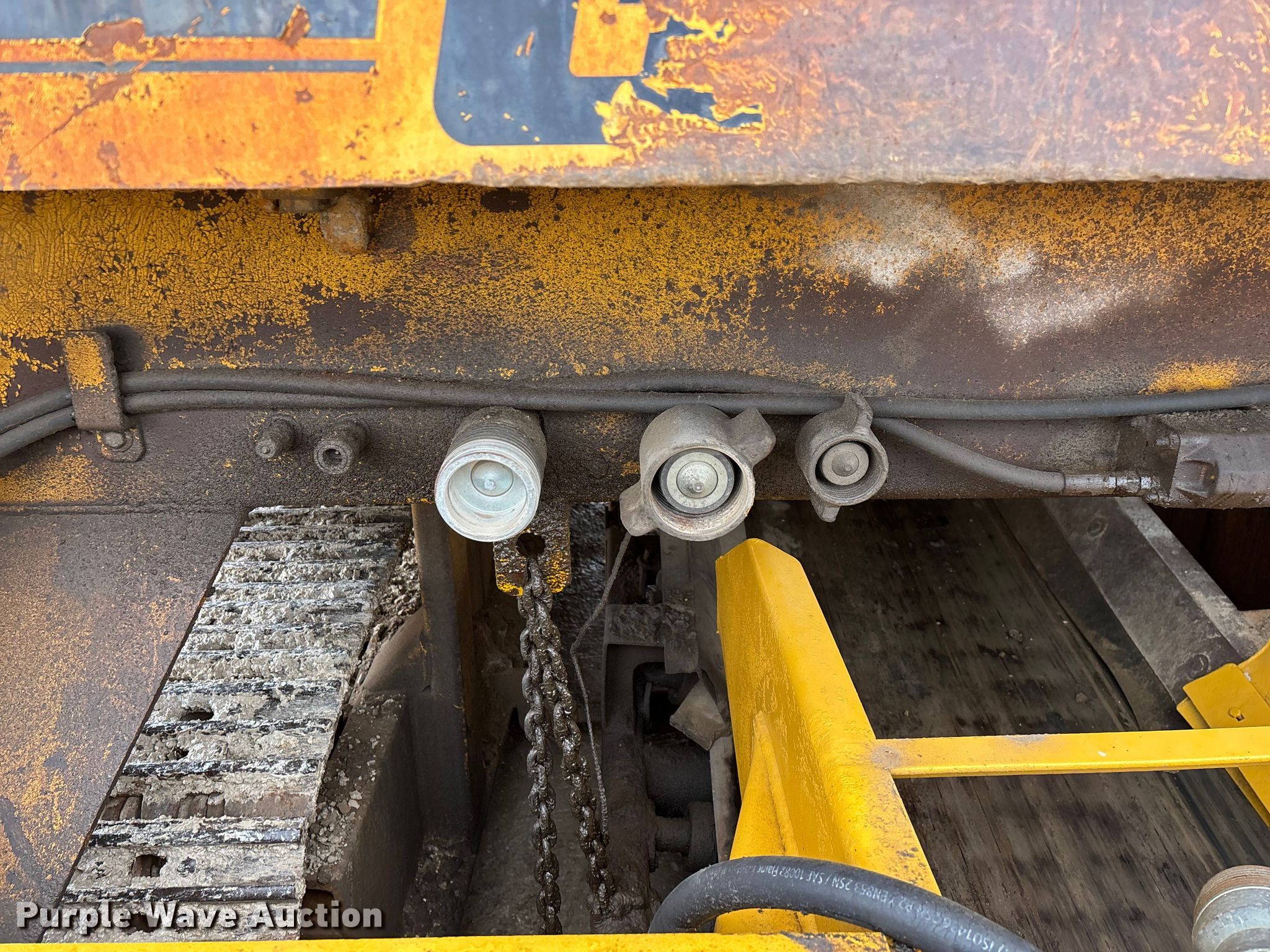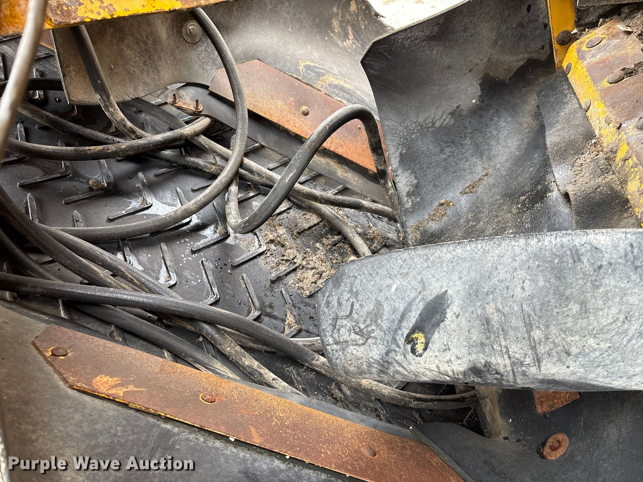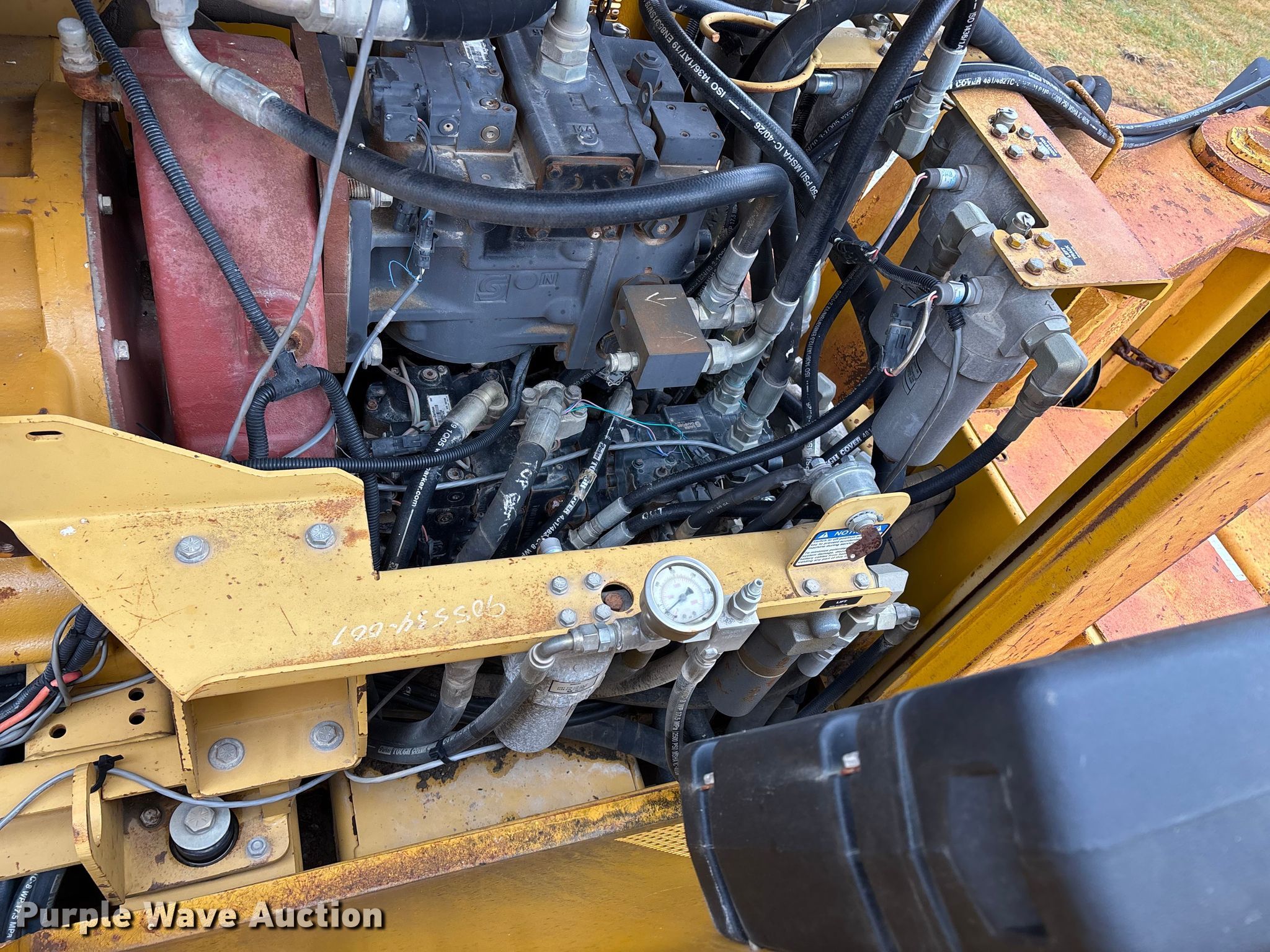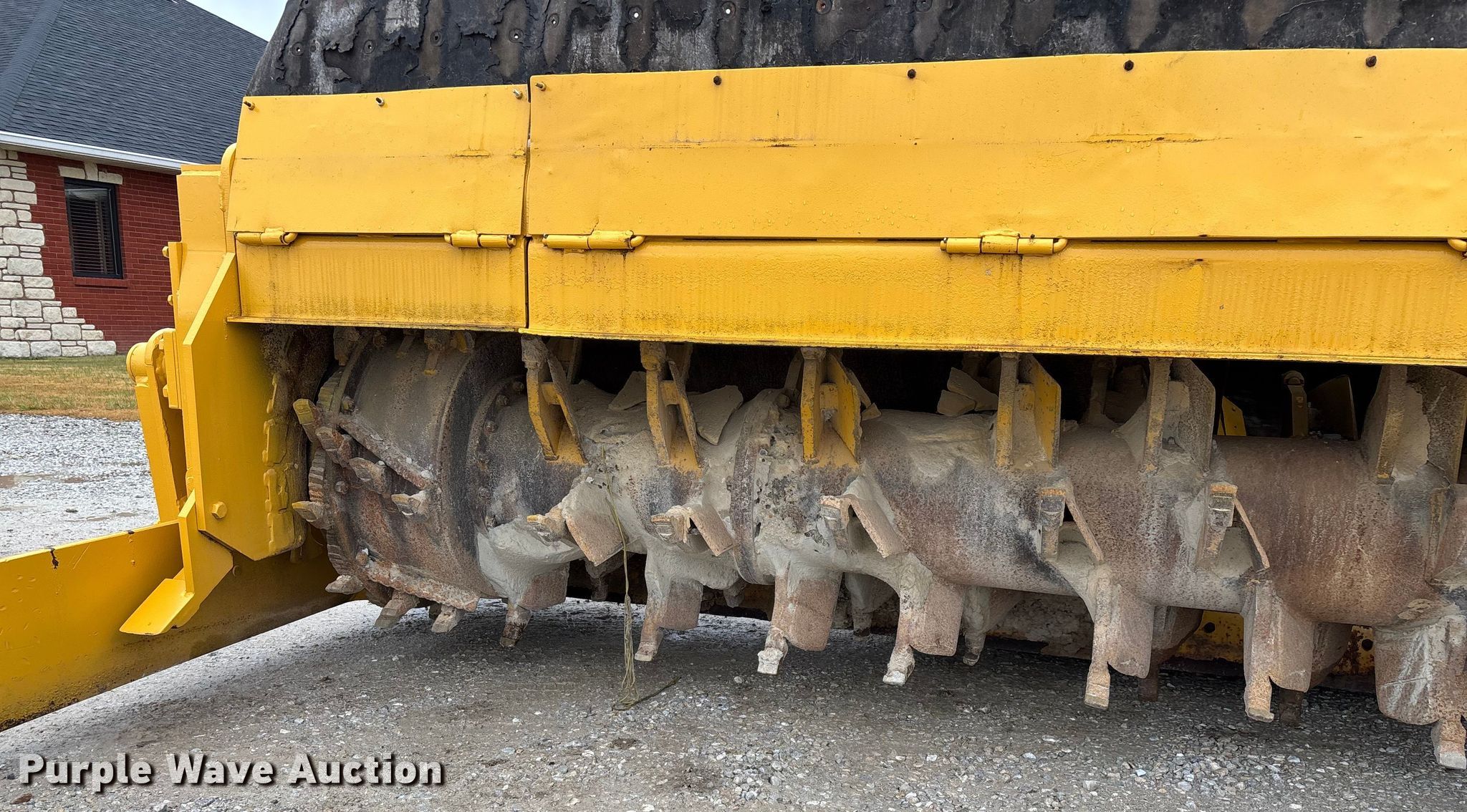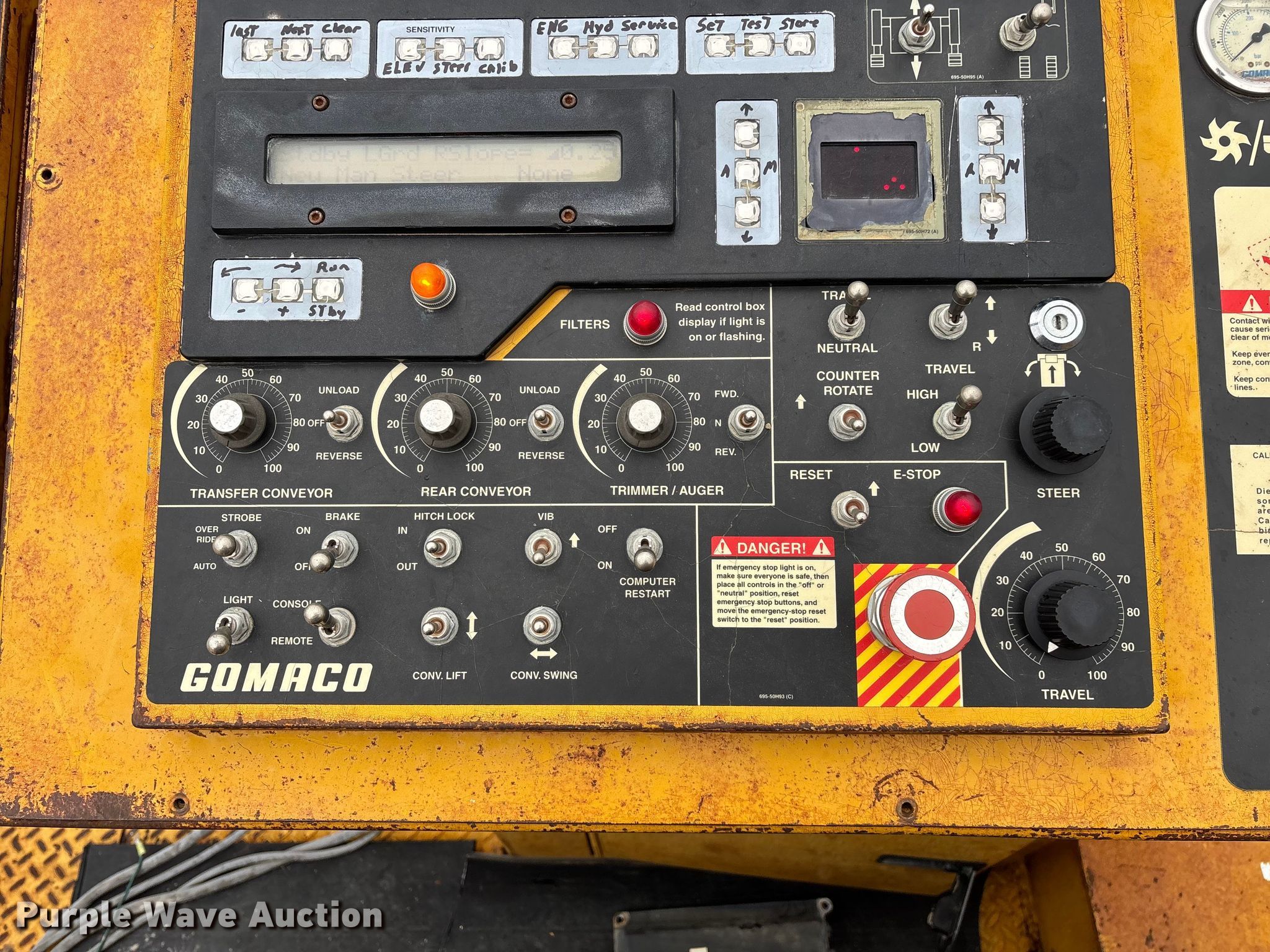 Gomaco 9000 trimmer. Hours: Unknown, Serial: 909000-042. Engine Caterpillar C-10, Serial: BCX02260, Displacement: 10.3L, Cylinders: 6, Fuel type: Diesel, HP: 439, kW: 327. Transmission Hydrostatic. Features 14' trimmer head, Transfer conveyor Size: 12' 2 L x 30" W, Rear conveyor Size: 24' L x 29.5" W. Tracks Width: 13.5", Steel. Notes Hour meter illumination issues, Hydraulic hose issues. Hardy Holding Group. Pilot Grove, MO 65276