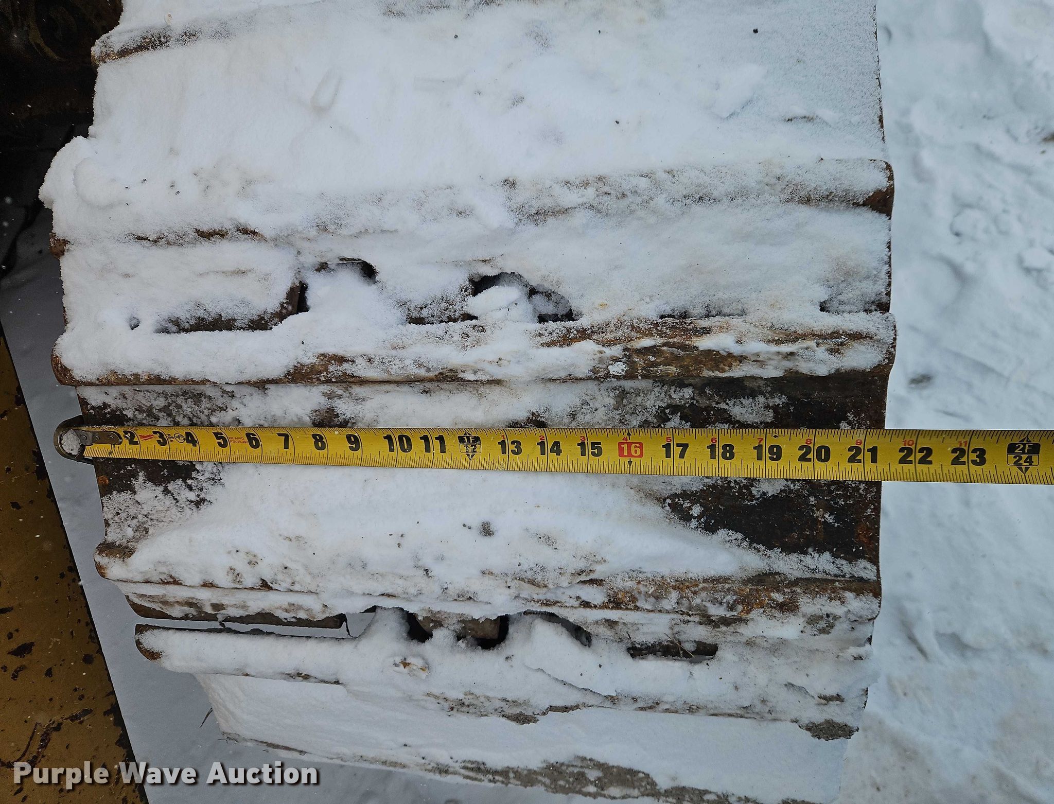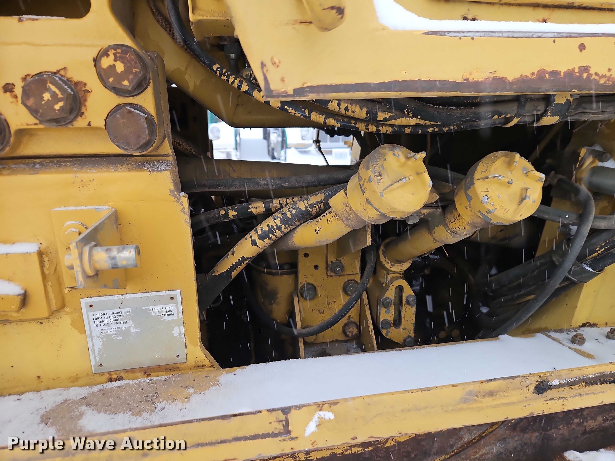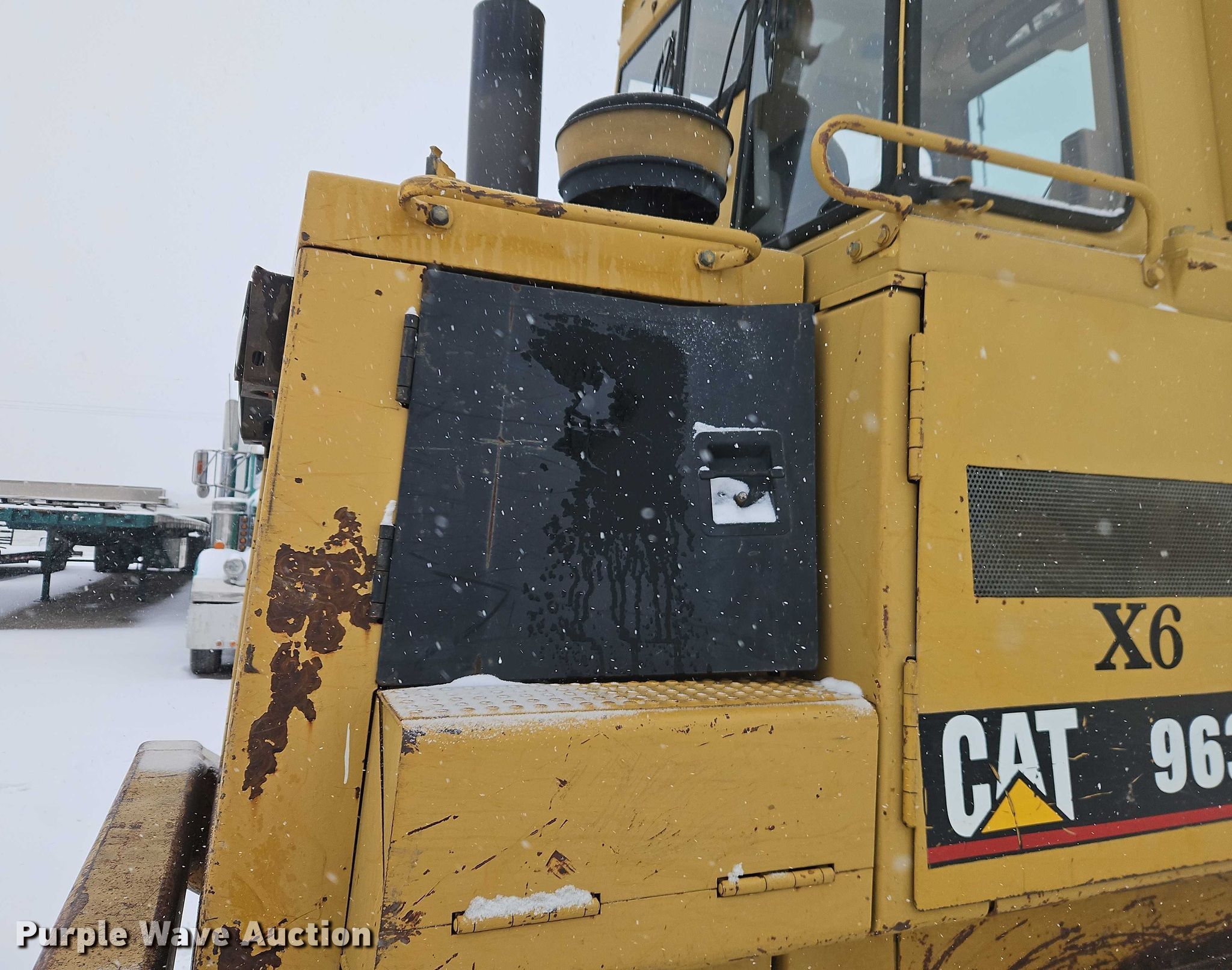1991 Caterpillar 963 track loader. Hours: 8,065 on meter, Serial: 21Z04148. Engine Caterpillar 3304, Cylinders: 4, Fuel type: Diesel. Transmission Hydrostatic. Operators station Enclosed cab, Heat, Bucket controls: Two-lever. Features Self-leveling loader, Bucket Width: 100", Cutting edge: Bolt-on, Teeth: 8. Tracks Width: 22", Grouser pads: Double. Helt Turf Farm. Pleasant Hill, MO 64080