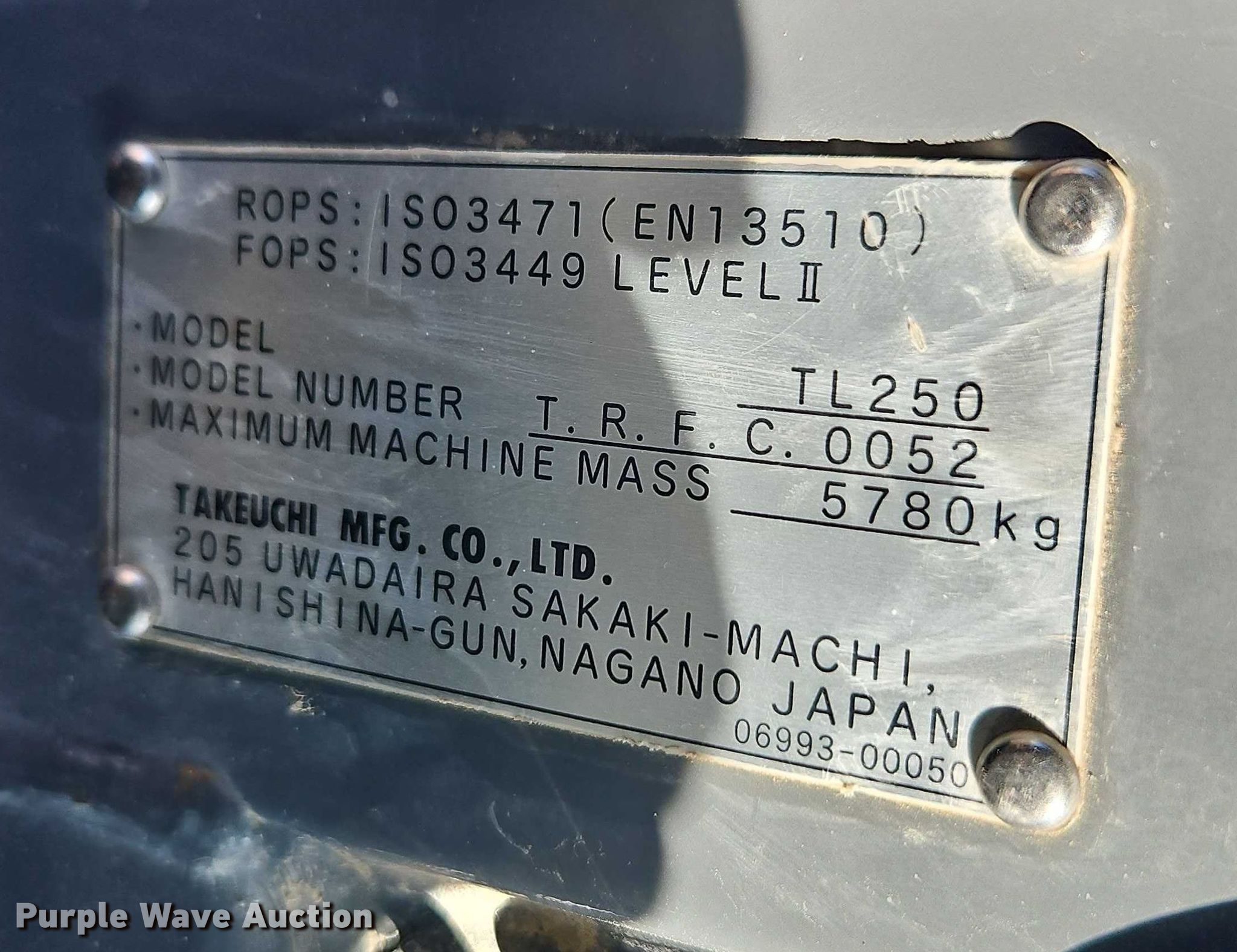 Purple Wave is selling a used Tracked Skid Steer Loader in Missouri. This item is a 2012 Takeuchi TL250 tracked skid steer loader with the following: Hours: 1,285 on meter, Serial: 225001554