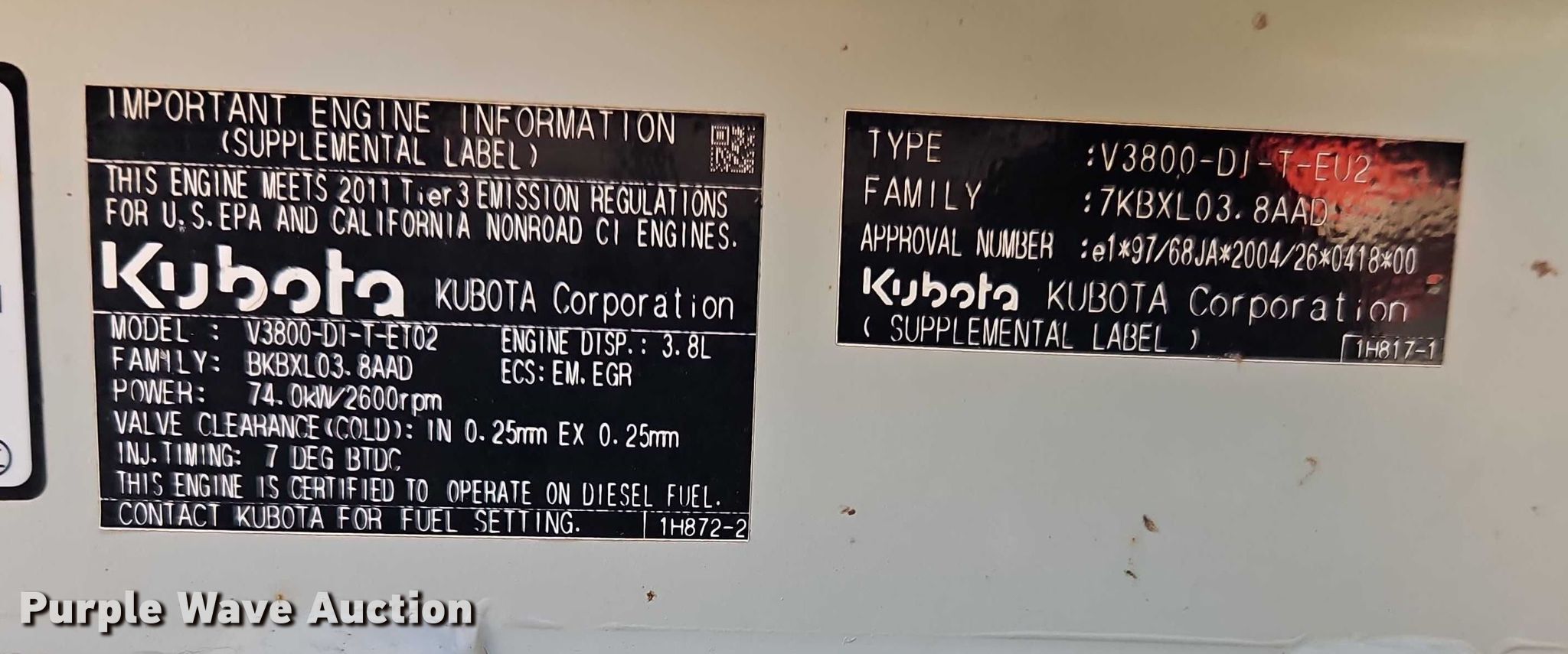 2012 Takeuchi TL250 tracked skid steer loader. Hours: 1,285 on meter, Serial: 225001554. Engine Kubota V3800, Displacement: 3.8L, Cylinders: 4, Fuel type: Diesel. Transmission Hydrostatic, Two speed travel. Operators station Enclosed cab, AC, Heat, Bucket control: Hand. Features Auxiliary hydraulics, Auxiliary electrical outlet, Quick coupler: Hydraulic, Bucket Width: 85", Low profile, Cutting edge: Bolt-on, Forks Length: 48". Tracks Brand: Takeuchi, Width: 18". Dimensional Stoneworks. Belton, MO 64012