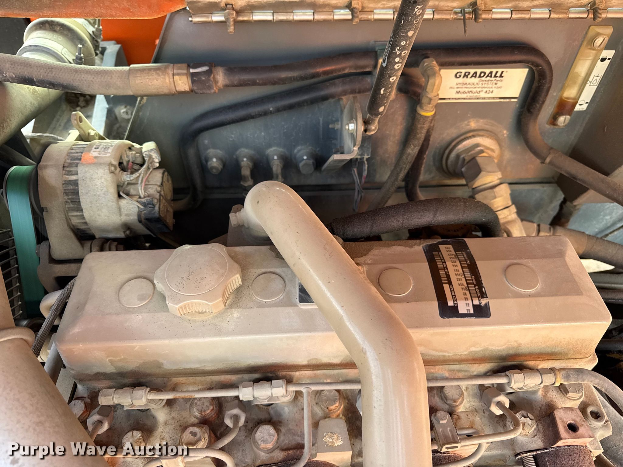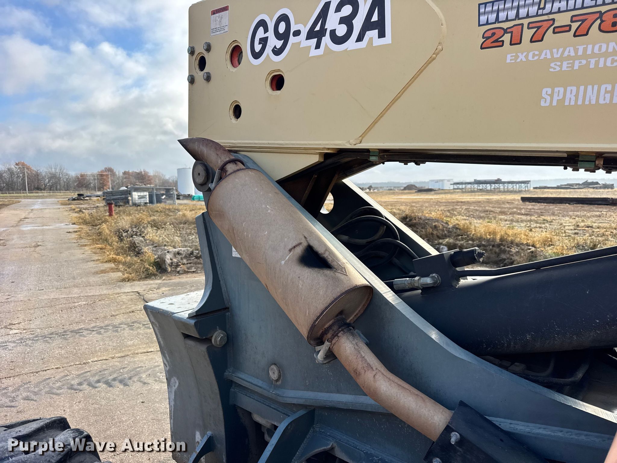 2004 JLG Gradall G9-43A telehandler. Hours: 6,390 on meter, Miles or hours may vary, unit still in use, Serial: 0160001637. Engine John Deere, Displacement: 4.5L, Cylinders: 4, Fuel type: Diesel. Transmission Powershift, 4F - 4R, Four wheel drive. Operators station Canopy, Steering: Crab, Four wheel. Features Maximum lift capacity: 9,000 lbs, Maximum lift height: 43', Boom stages: 3, Fork length: 48", Auxiliary hydraulics, Hydraulic leveling, Quick attach: Manual. Tires Size: 13.00-24, Foam filled. Jacksonville, IL 62650