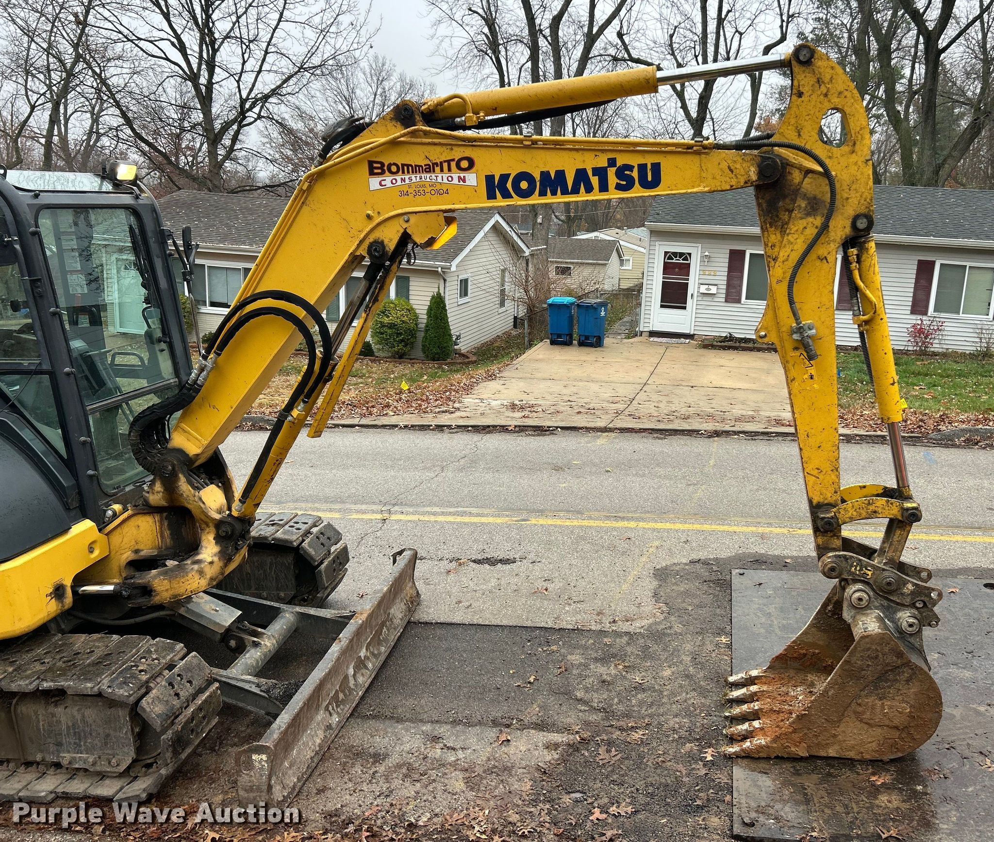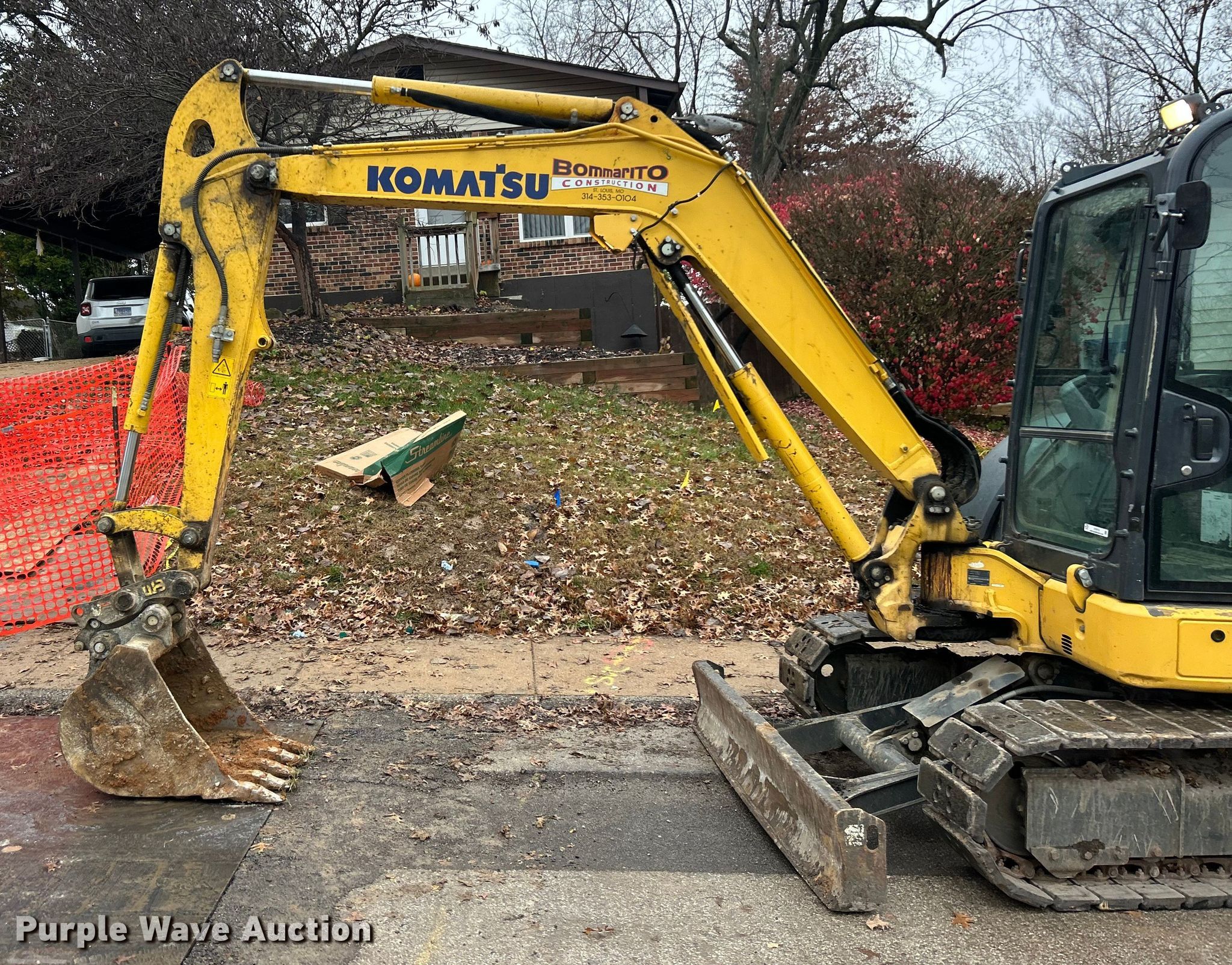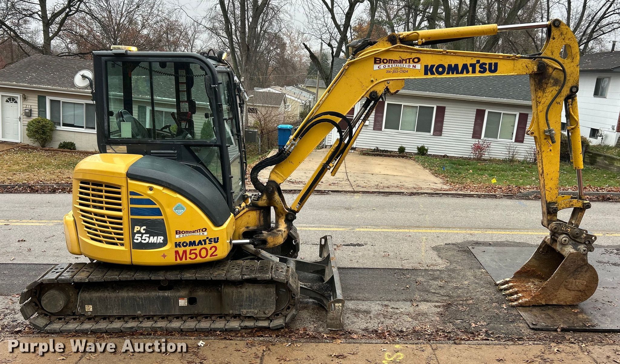 2020 Komatsu PC55MR-5 mini excavator. Hours: 4,502 on meter, Miles or hours may vary, unit still in use, Serial: KMTPC259VJE021348. Engine Yanmar, Displacement: 2.190L, Cylinders: 4, Fuel type: Diesel. Transmission Hydrostatic, Two speed travel. Operators station Enclosed cab, AC, Heat, Pattern changer. Features Auxiliary hydraulics, Backfill blade Width: 77", Boom Swing, Stick Stick length: 5' 6", Quick coupler: Mechanical WB, Bucket WB, Width: 24", Teeth: 5. Tracks Width: 15.5", Rubber. Notes Decals will be removed prior to auction. Bommarito Construction. Fenton, MO 63026