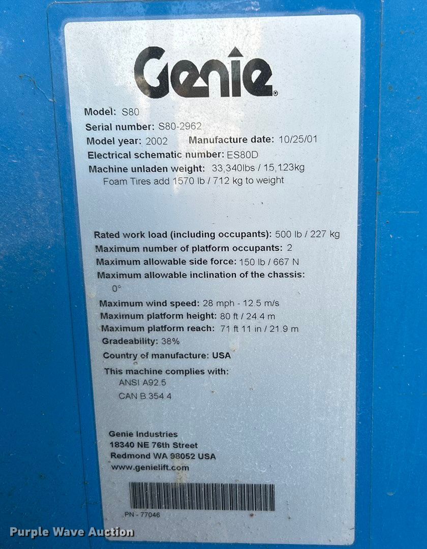 Purple Wave is selling a used Boom Lift in Missouri. This item is a 2002 Genie S80 boom lift with the following: Hours: 6,704 on meter, Serial: S80-2962