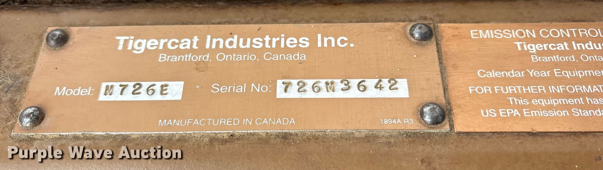 2014 Tigercat M726E mulcher. Hours: 3,791 on meter, Serial: 726M3642. Engine Tigercat FPT QSB6.7, Displacement: 8.7L, Cylinders: 6, Fuel type: Diesel, HP: 230. Transmission Hydrostatic. Chassis Four wheel drive. Features Mulcher Width: 8'. Tires Size: 30.5L-32. Notes Dash waring indicator: Low Coolant. Broken Bow, OK 74728