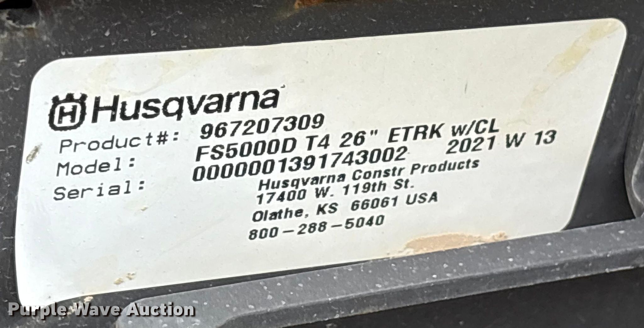 Purple Wave is selling a used Concrete Equip. or Acces. in Texas. This item is a 2016 Husqvarna FS 5000 D concrete saw with the following: Hours: 298 on meter, Serial: 1391743002, Unit #: 70051