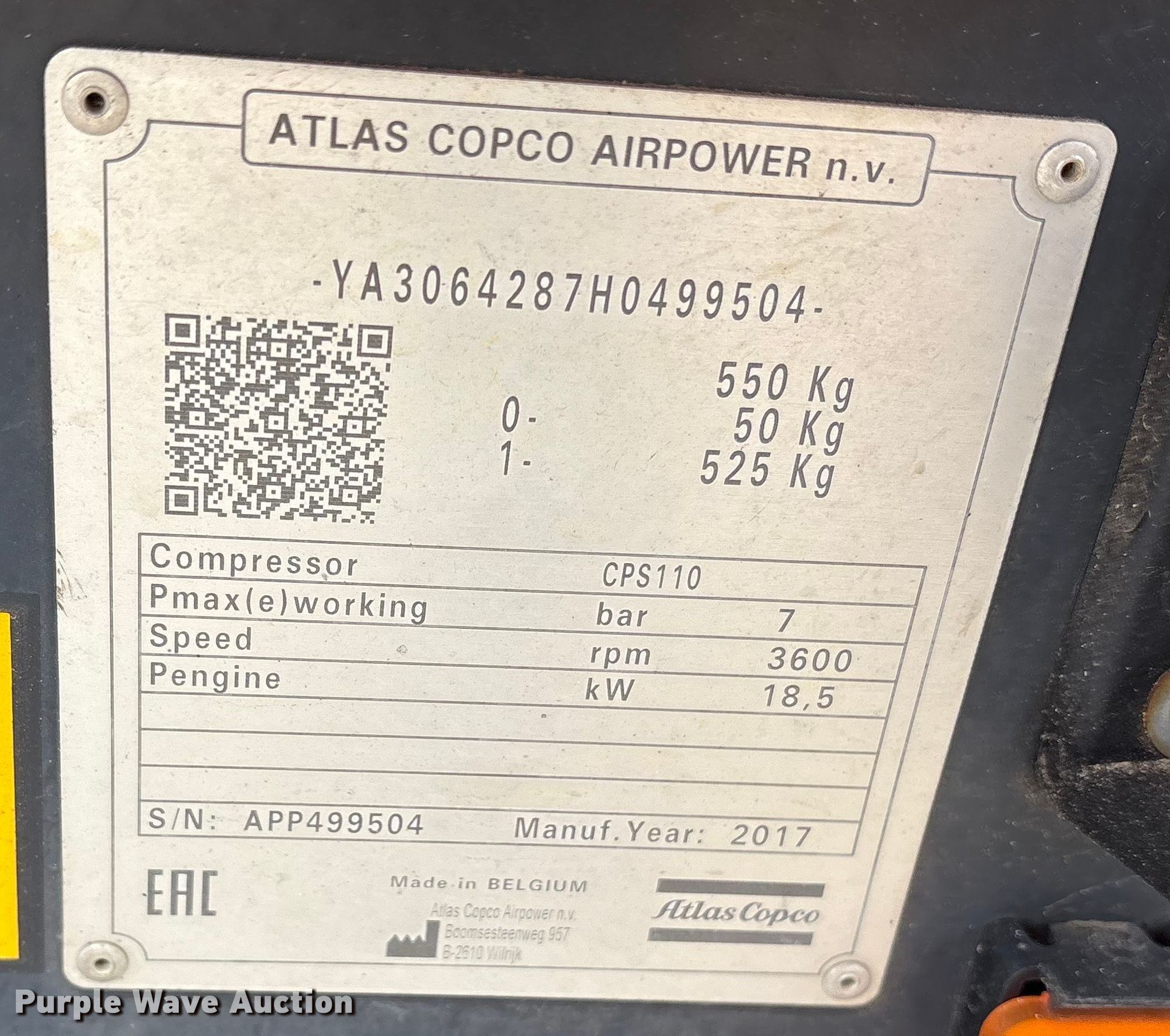Purple Wave is selling a used Air Compressor in Texas. This item is a 2017 Atlas Copco CPS110 air compressor with the following: Hours: 269 on meter, VIN: YA3064287H0499504, Serial: APP499504, Unit #: 180131