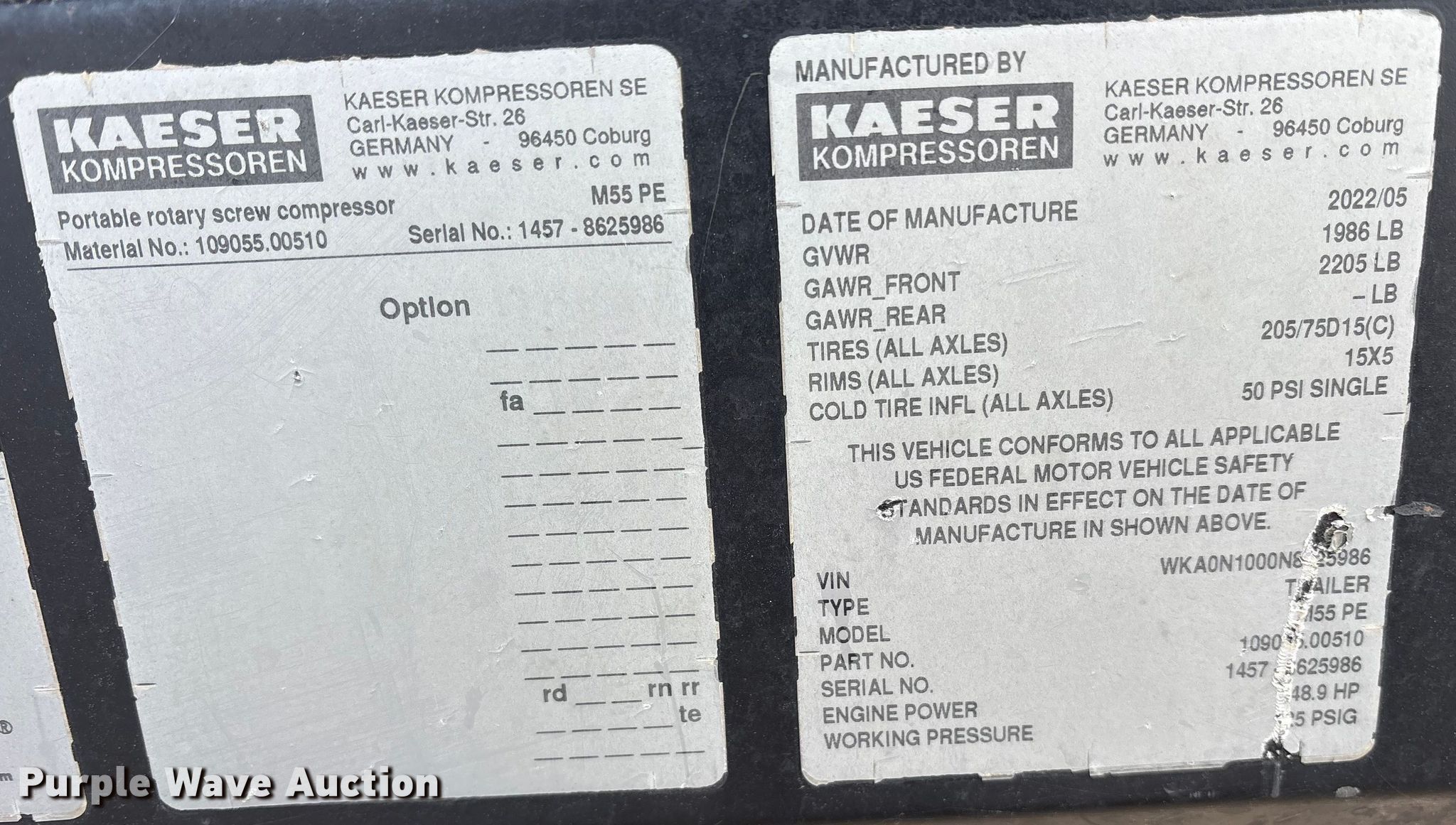 Purple Wave is selling a used Air Compressor in Texas. This item is a 2022 Kaeser M55 PE air compressor with the following: Hours: 667 on meter, VIN: 1806275, Serial: 14578625986, Unit #: 143031
