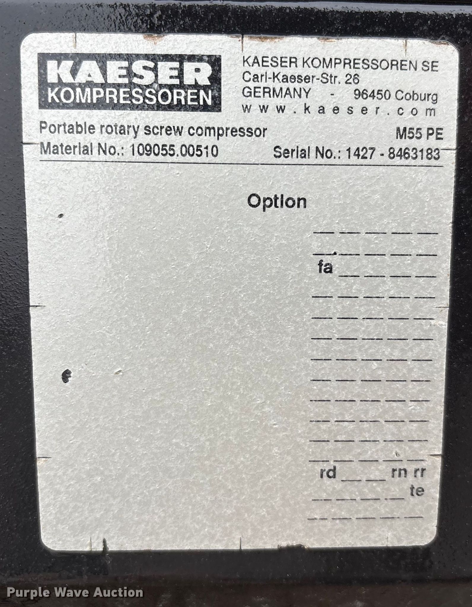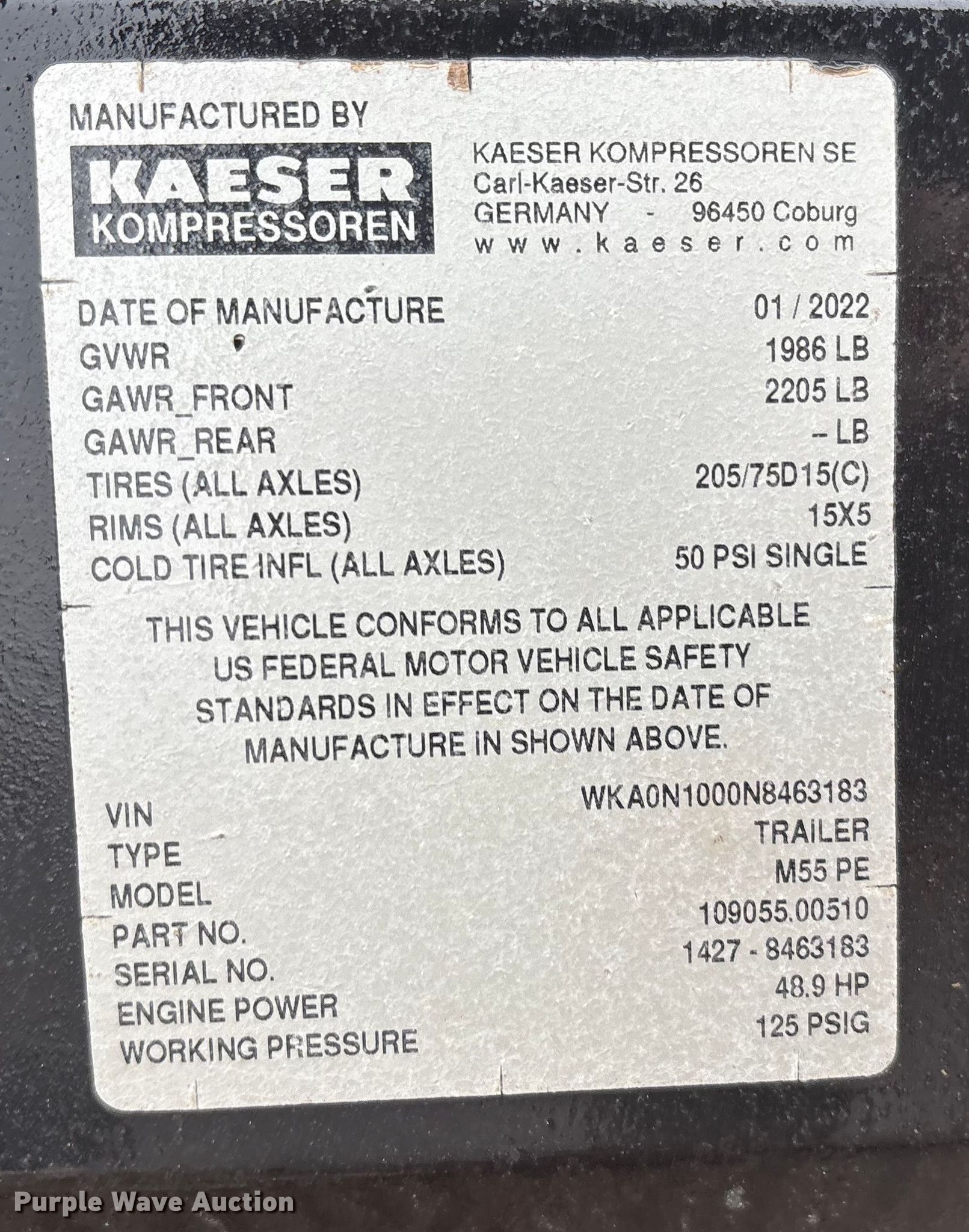 Purple Wave is selling a used Air Compressor in Texas. This item is a 2022 Kaeser M55 air compressor with the following: Hours: 800 on meter, VIN: WKAON1000N8463183, Serial: 1427 - 8463183, Unit #: 143012