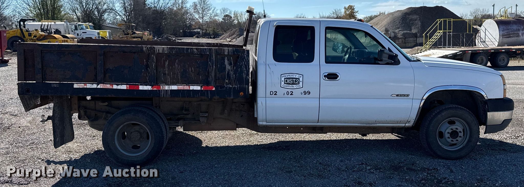 2004 Chevrolet Silverado 3500 Ext. Cab dump flatbed pickup truck. Miles: 192,827 on odometer, VIN: 1GBJC39U54E166174, Unit #: D2-302-099. Engine Displacement: 6.0L, Cylinders: 8, Fuel type: Gas. Transmission Automatic. Interior AC, Heat, Cruise control. Features Bed Dump flatbed, Length: 9', Width: 90", Height: 19", Dump bed in-cab remote control Ram: Single. Tires Front: LT225/75R16, Rear: LT215/85R16. Notes Ball hitch not included, Dash warning indicator: Check engine, Airbag, Possible brake issues. Oklahoma title. Title distribution may be delayed up to 14 days from verification of funds. Garvin County. Elmore City, OK 73433