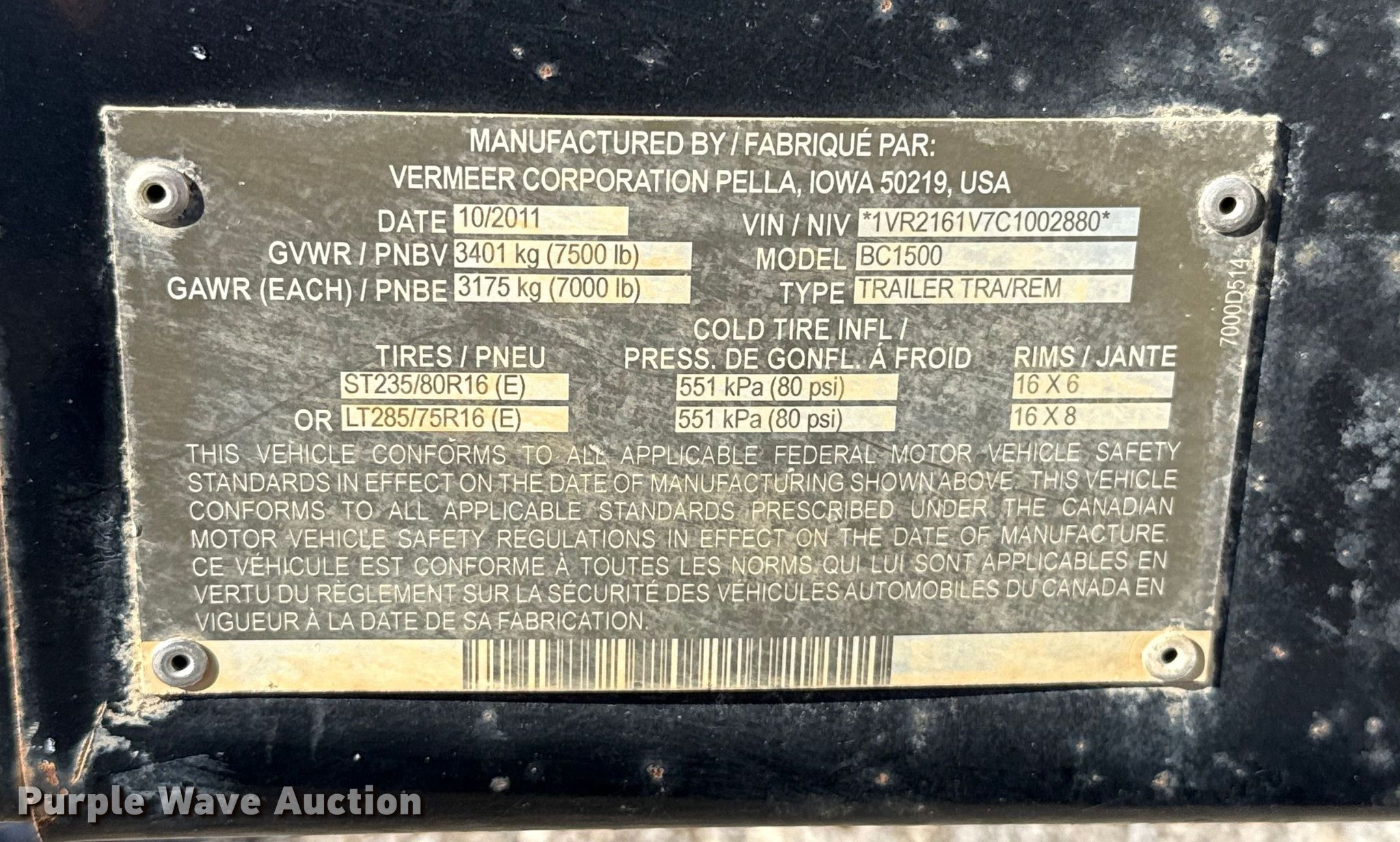 2012 Vermeer BC1500 wood chipper. Hours: 366 on meter, VIN: 1VR2161V7C1002880, Unit #: D2-349002. Engine John Deere 4045HF, Displacement: 4.5L, Cylinders: 4, Fuel type: Diesel. Features Throat opening: 34" x 20", Auto feed. Trailer 2012 Vermeer, 14' L x 90" W, Hitch: Pintle, Suspension: Torsion, Brakes: Electric, Axles: Single, Tire size: ST235/80R16, GVWR: 7,500 lbs, GAWR: 7,000 lbs. This is worksite support equipment and will not come with a title. Transfer of ownership documentation will be a bill of sale. Garvin County. Elmore City, OK 73433