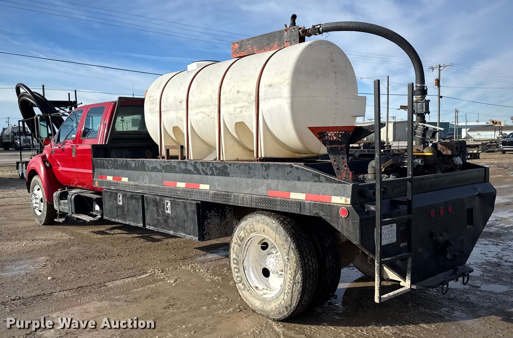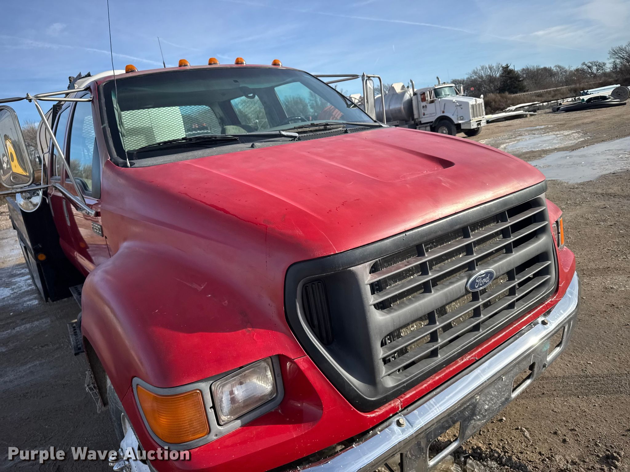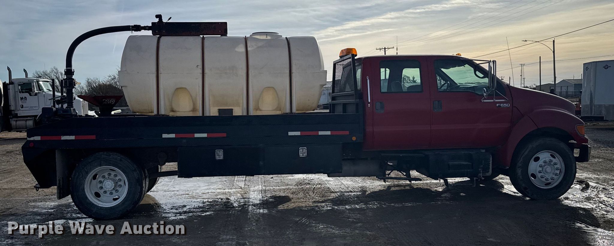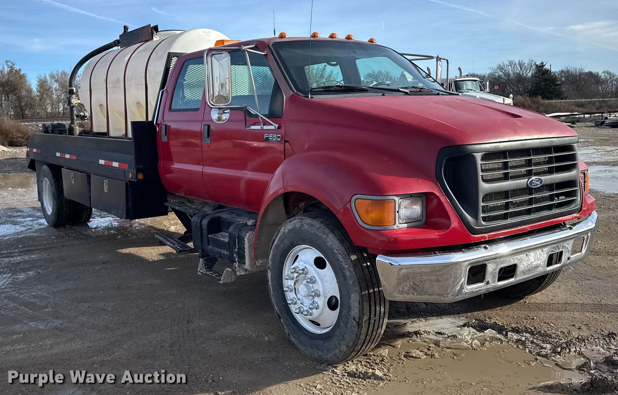2000 Ford F650 Super Duty XL flatbed truck. Miles: 103,542 on odometer, VIN: 3FDNW65A0YMA03719. Engine Caterpillar, Displacement: 7.2L, Cylinders: 6, Fuel type: Diesel. Transmission Automatic. Chassis Axles: Single, Suspension: Spring, Brakes: Hydraulic. Interior AC, Heat, Power windows, Power locks, Brake controller. Features Bed Flatbed, Length: 16', Width: 95", Poly tank Capacity: 1000 gallons, Mud mixing pump. Tires Size: 275/80R22.5. Kansas title. Title distribution may be delayed up to 14 days from verification of funds. M&D of Hays, Inc. Hays, KS 67601