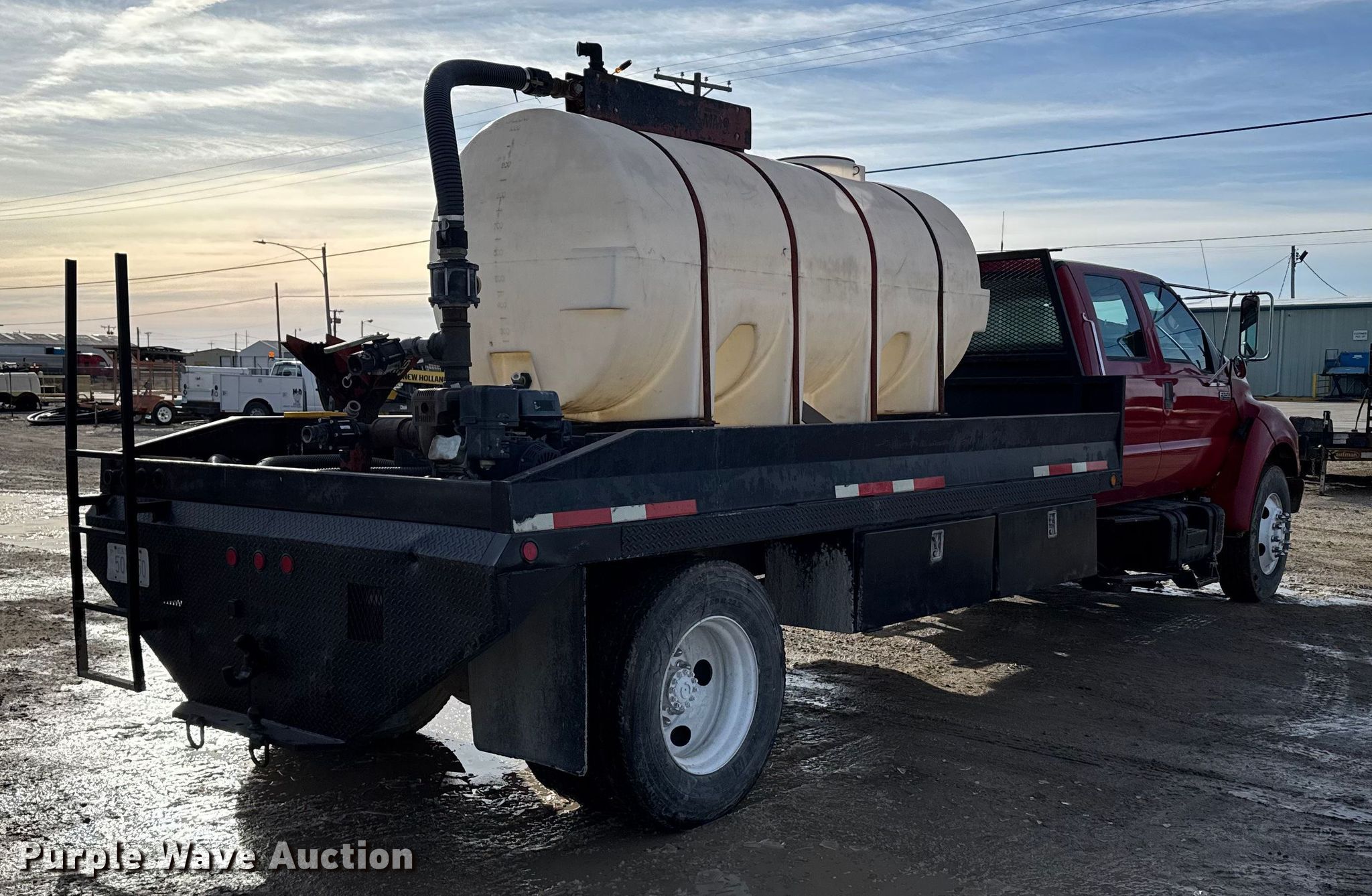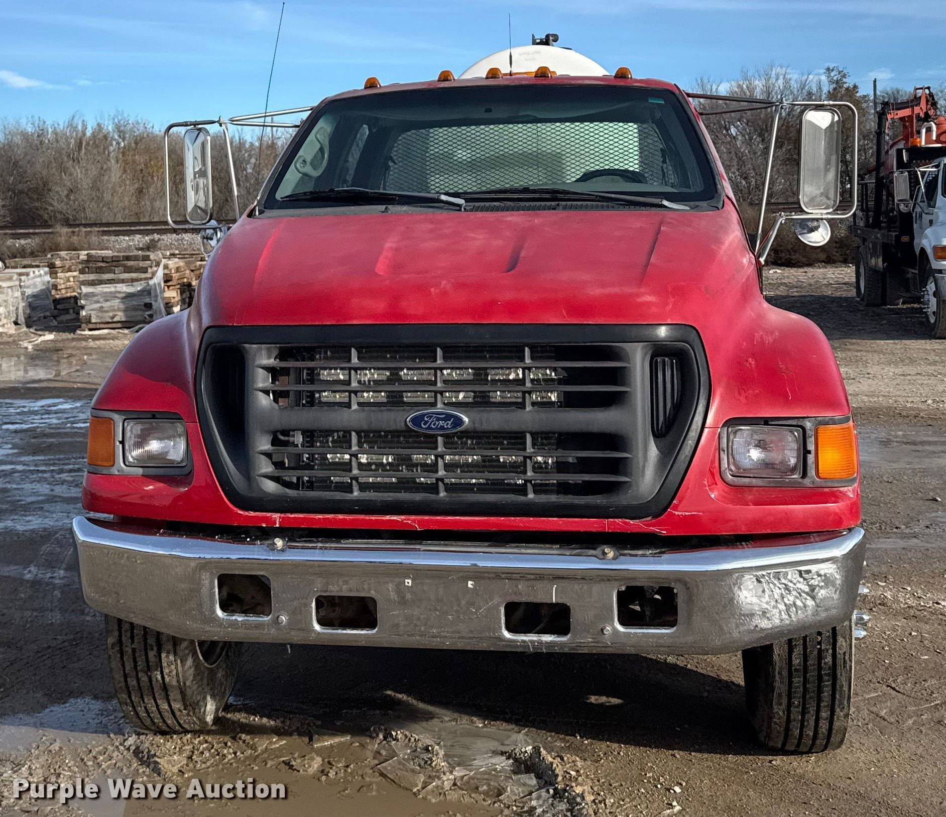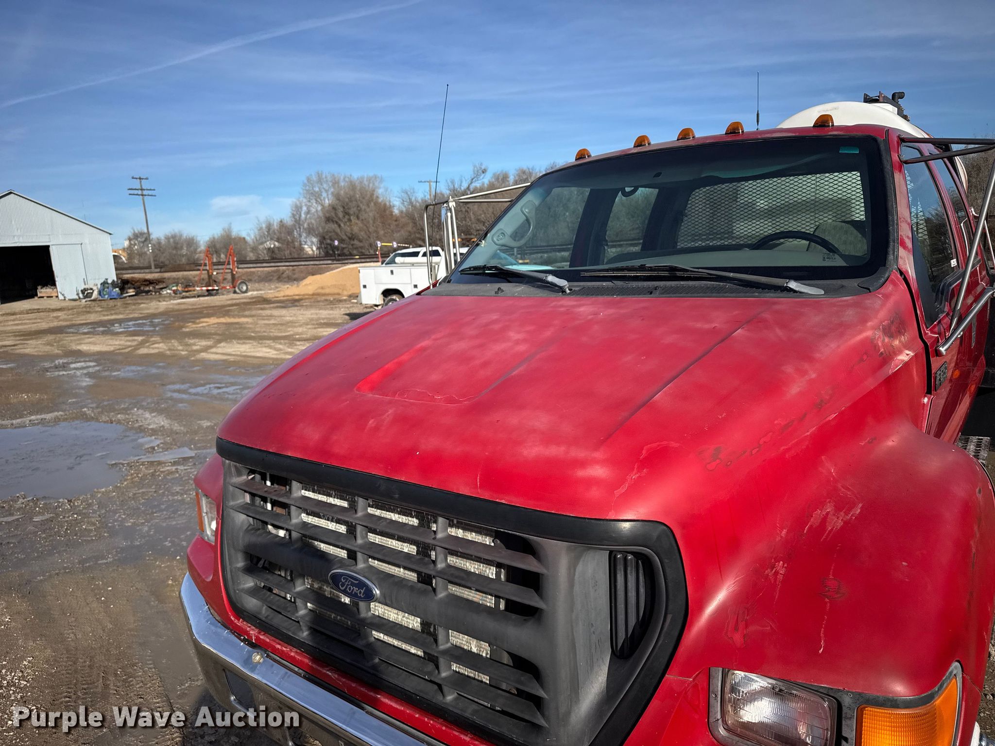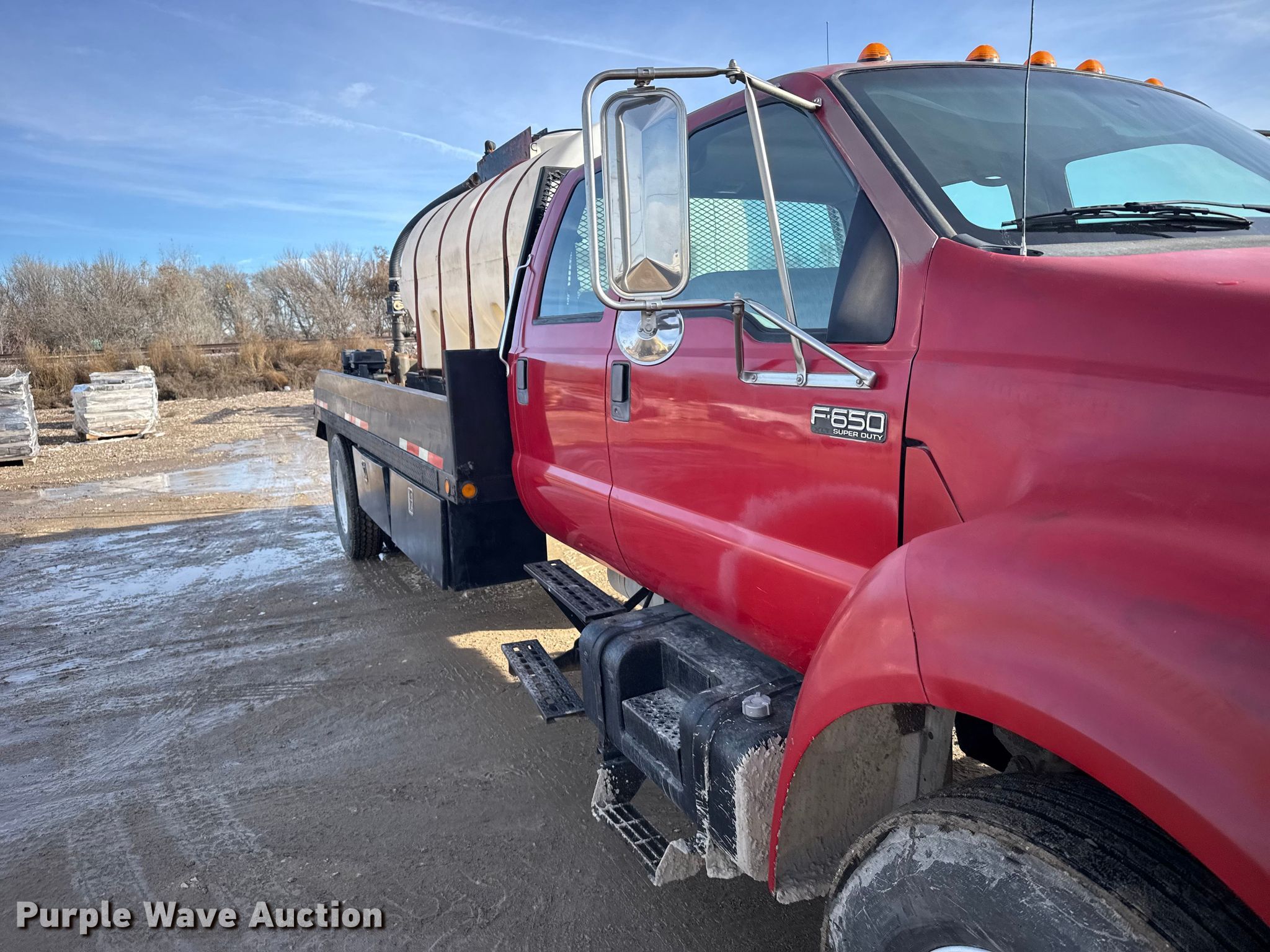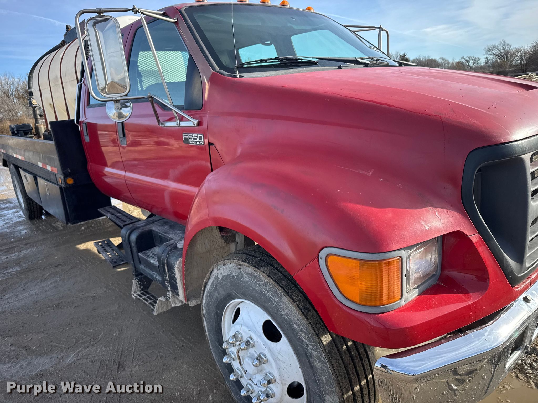 2000 Ford F650 Super Duty XL flatbed truck. Miles: 103,542 on odometer, VIN: 3FDNW65A0YMA03719. Engine Caterpillar, Displacement: 7.2L, Cylinders: 6, Fuel type: Diesel. Transmission Automatic. Chassis Axles: Single, Suspension: Spring, Brakes: Hydraulic. Interior AC, Heat, Power windows, Power locks, Brake controller. Features Bed Flatbed, Length: 16', Width: 95", Poly tank Capacity: 1000 gallons, Mud mixing pump. Tires Size: 275/80R22.5. Kansas title. Title distribution may be delayed up to 14 days from verification of funds. M&D of Hays, Inc. Hays, KS 67601