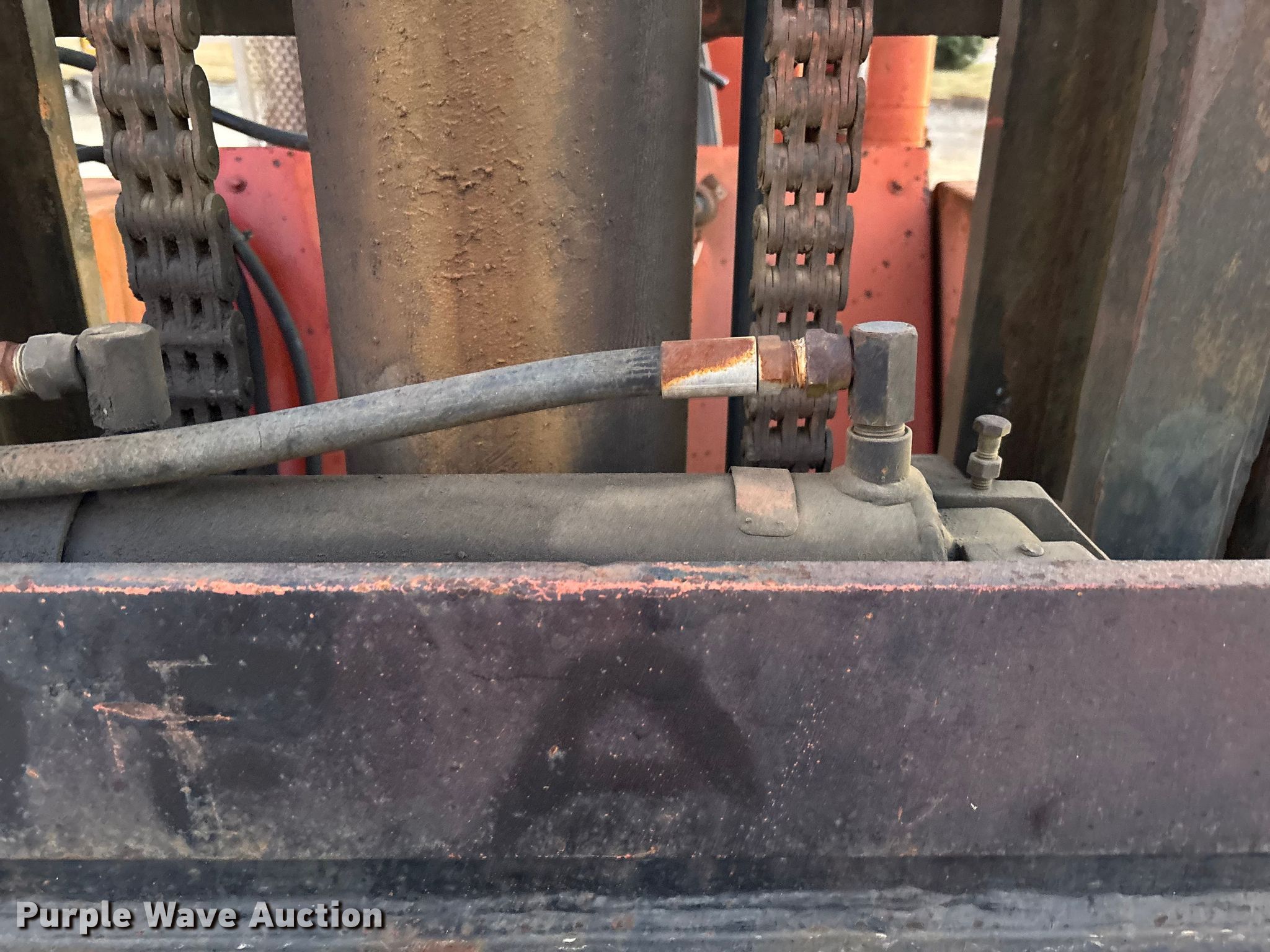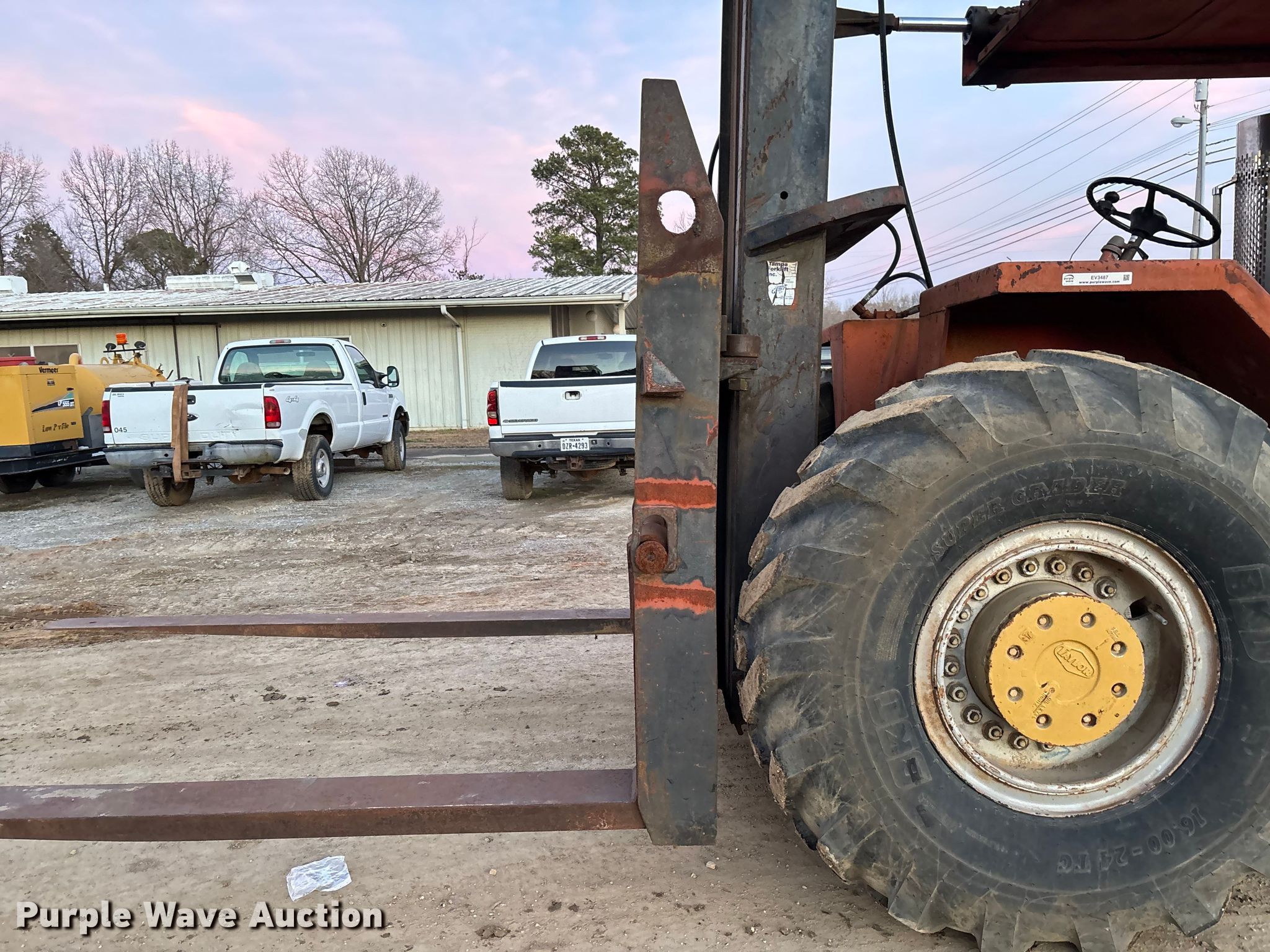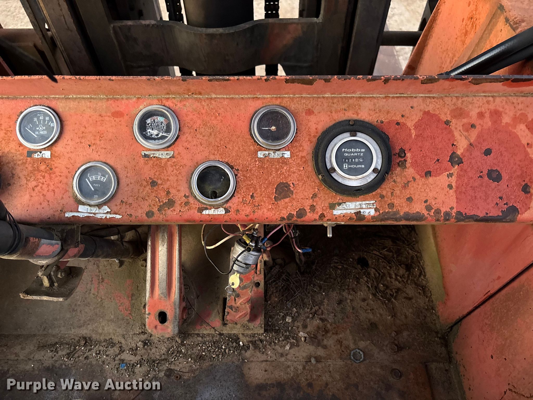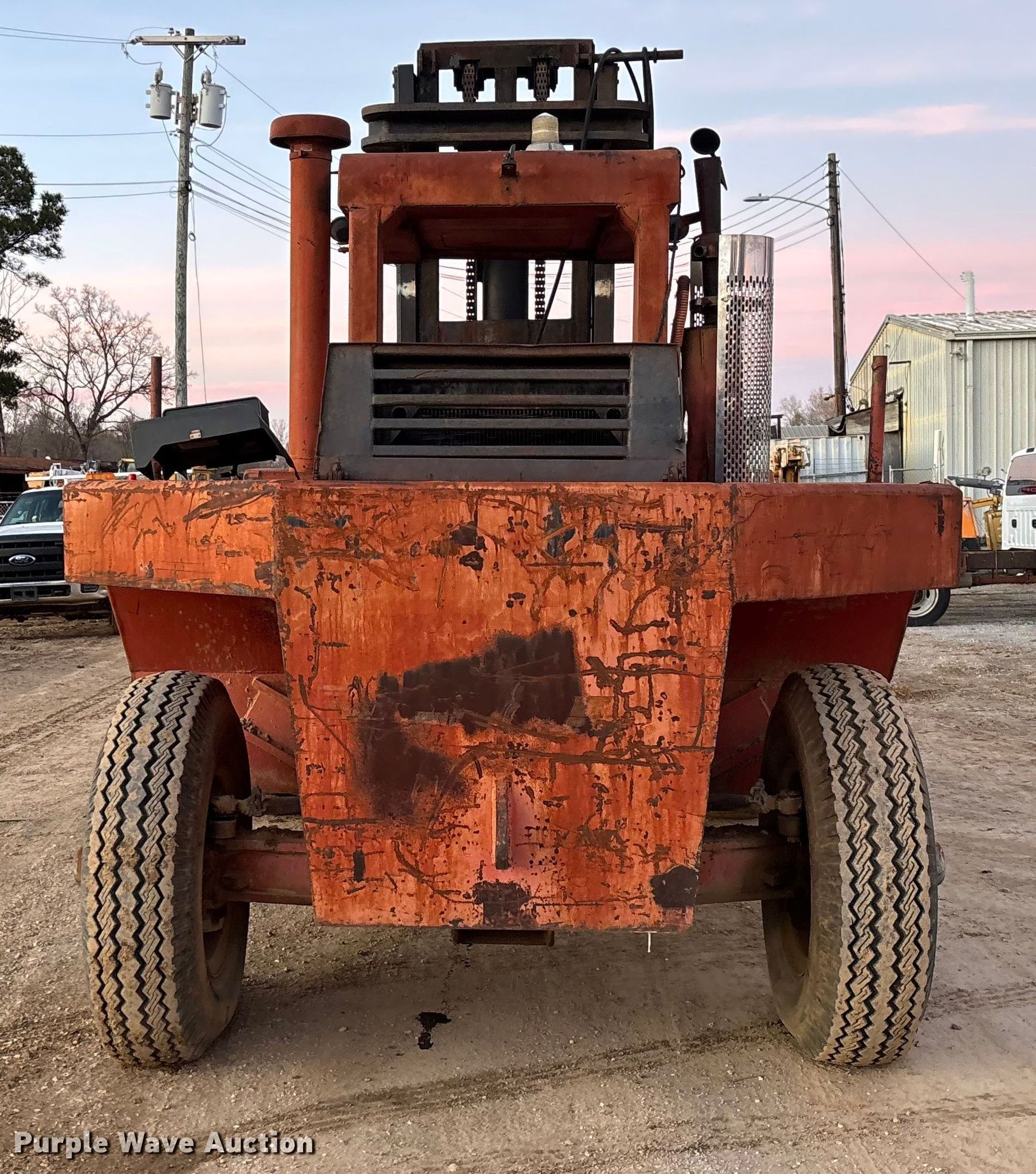 Taylor Y-22-BW0 forklift. Hours: 7,428 on meter, Serial: S3611022. Engine Detroit, Cylinders: 4, Fuel type: Diesel. Transmission Manual. Operators station Canopy. Features Maximum lift capacity: 22,000 lbs, Collapsed mast height: 142", Mast stages: 2, Side shift, Mast tilt, Fork length: 107". Tires Front: 16.00-24, Rear: 11.00-20. Notes Jump start required during on-site data collection, Oil leak, Drivetrain issues, slow reverse, Cylinders leaking. Construction Equipment Rental and Sales, Inc. Jackson, TN 38301