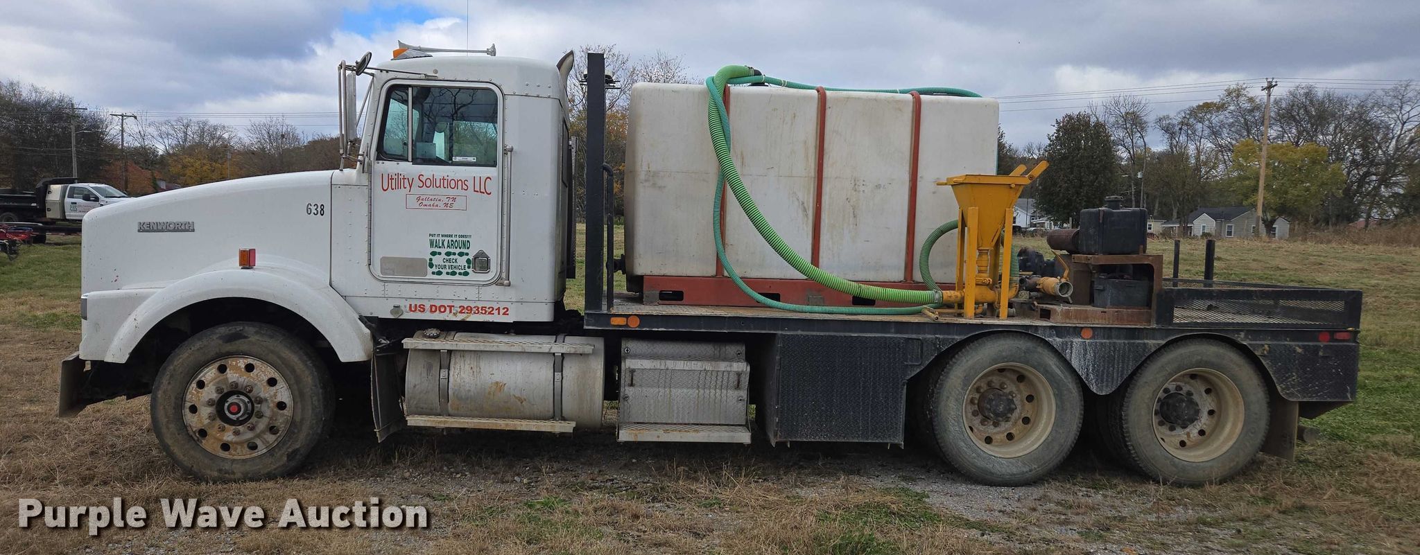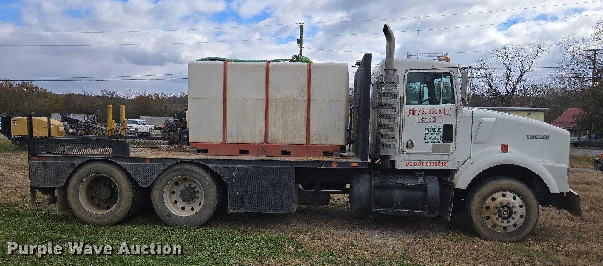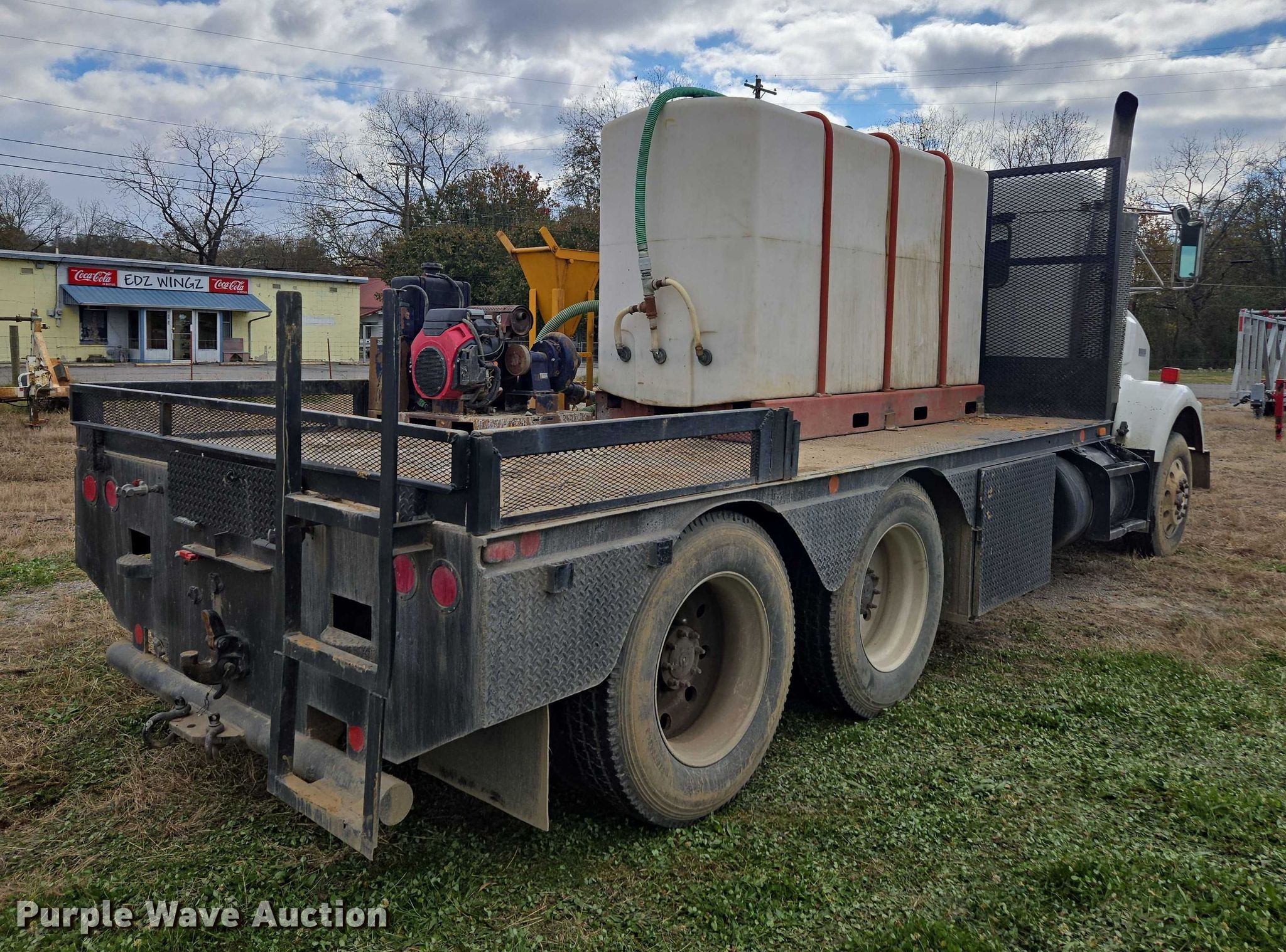 1996 Kenworth T800 flatbed truck. Miles: 233,002 on odometer, VIN: 1XKDDB9X9TS724638. Engine Caterpillar 3406, Displacement: 14.6L, Cylinders: 6, Fuel type: Diesel. Transmission Manual, Speed: 9. Chassis Axles: Tandem, Suspension: Air, Brakes: Air, PTO, GVWR: 50,000 lbs. Interior AC, Heat, Cruise control. Features Bed Flatbed, Length: 17' 6", Width: 101", Fluid mixing system, Poly tank, Capacity: 950 gallons, Honda engine, Cylinders: 2, Inlet/outlet: 3". Tires Size: 285/75R24.5. Tennessee title. Title distribution may be delayed up to 30 days from verification of funds. Utility Solutions- TN. Fayetteville, TN 37334