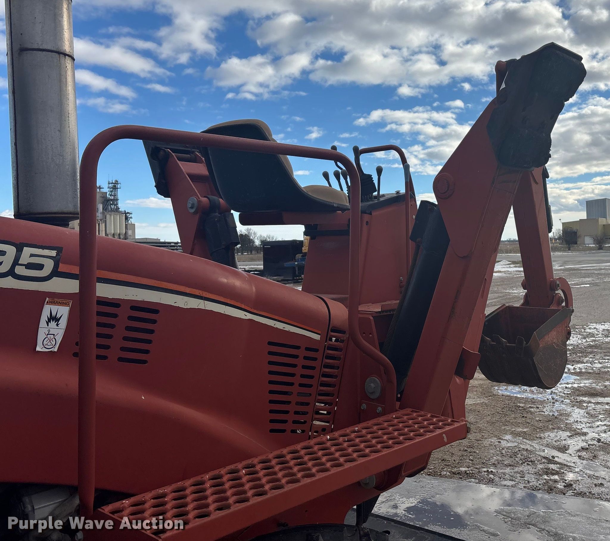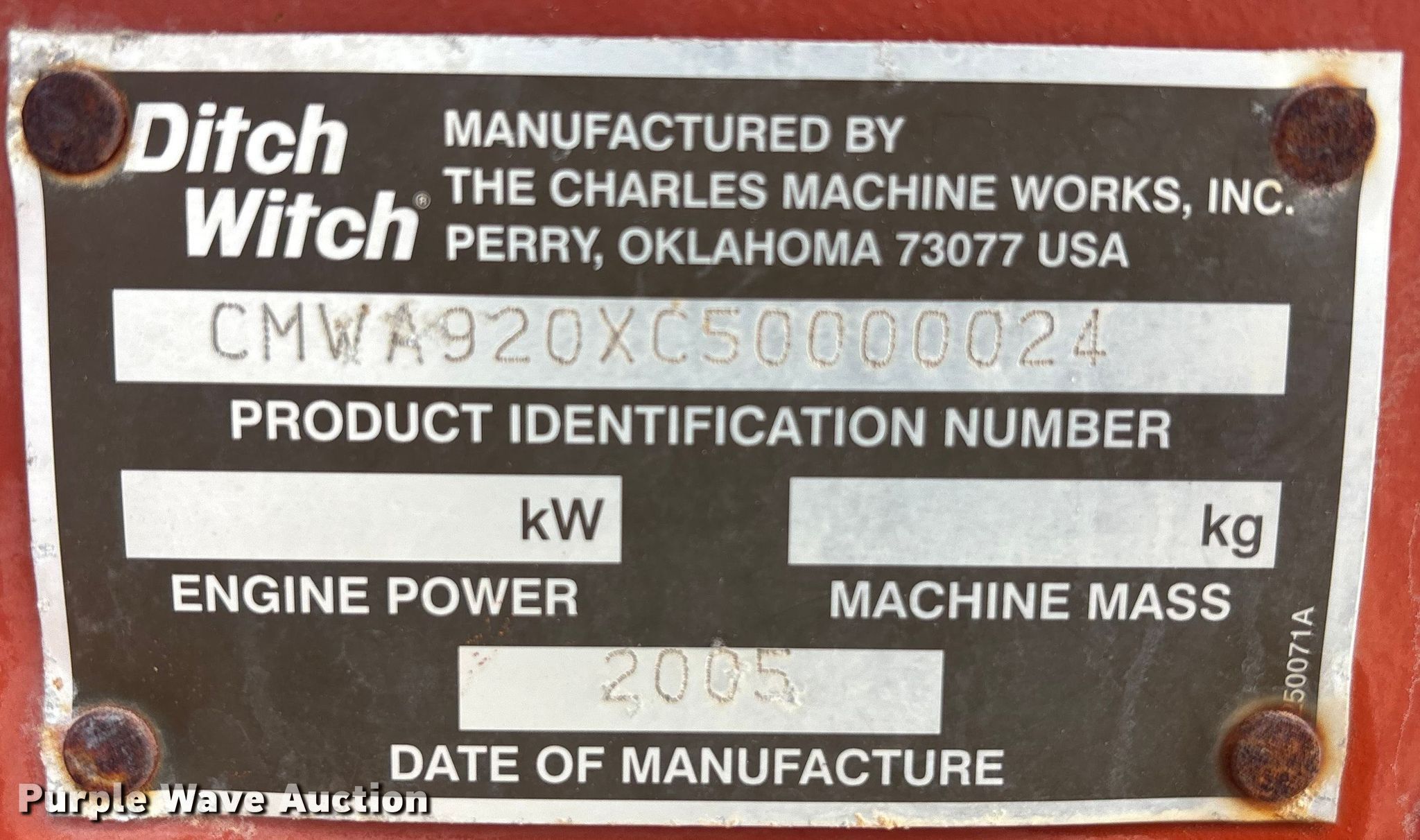 2005 Ditch Witch RT95 trencher. Hours: 1,455 on meter, Serial: CMWRT95MP50000001. Engine John Deere 4045TF270B, Displacement: 4.5L, Cylinders: 4, Fuel type: Diesel. Transmission Hydrostatic, Two speed travel. Chassis Four wheel drive, Differential lock, Four wheel steer. Features Trencher Model: M910, Serial: CMWM910XV50000033, Estimated dig depth: 108", Cutting width: 6", Teeth: Dirt, Hydraulic crumber, Backhoe Model: A920, Bucket width: 18", Backfill blade Width: 80". Tires Size: 38x18R20. Notes Transmission issues, stays in low gear , Seat safety switch issues Intermittent chain engagement issues, Cumber disconnected. Columbus, NE 68601