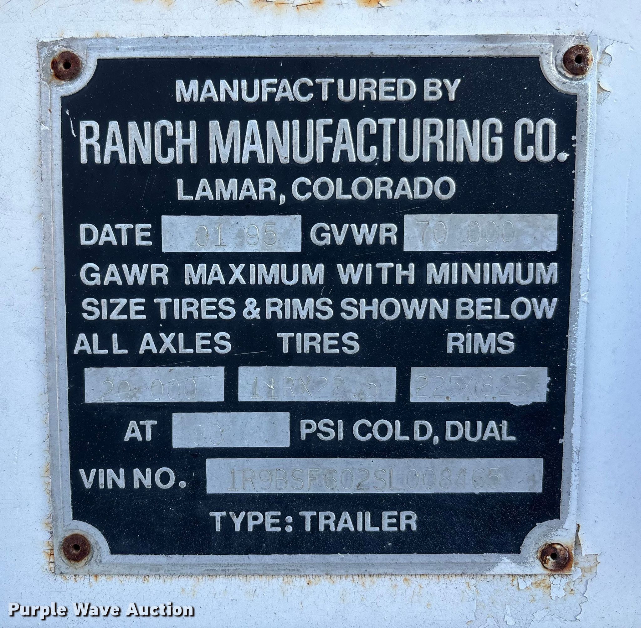 Purple Wave is selling a used Bottom Dump Trailer in Missouri. This item is a 1995 Ranch bottom dump trailer with the following: VIN: 1R9BSF602SL008465