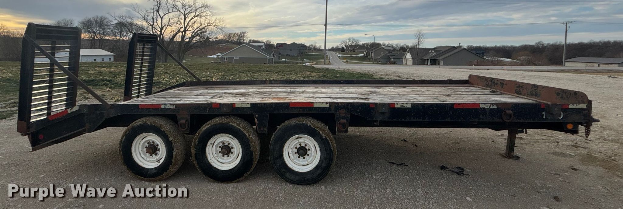 2003 Shop built equipment trailer. VIN: NET1147606. Dimensions Overall Length: 26', Width: 94", Deck Length: 19', Width: 94", Tail length: 3', Ramps: Manual Length: 55". Features Deck type: Wood. Chassis Hitch: Pintle, Landing gear: Single, Suspension: Spring, Brakes: Electric, Axles: Triple, GVWR: 21,000 lbs. Tires Steel wheels, Size: 235/85R16. Nebraska title. Title distribution may be delayed up to 30 days from verification of funds. Louisville, NE 68037