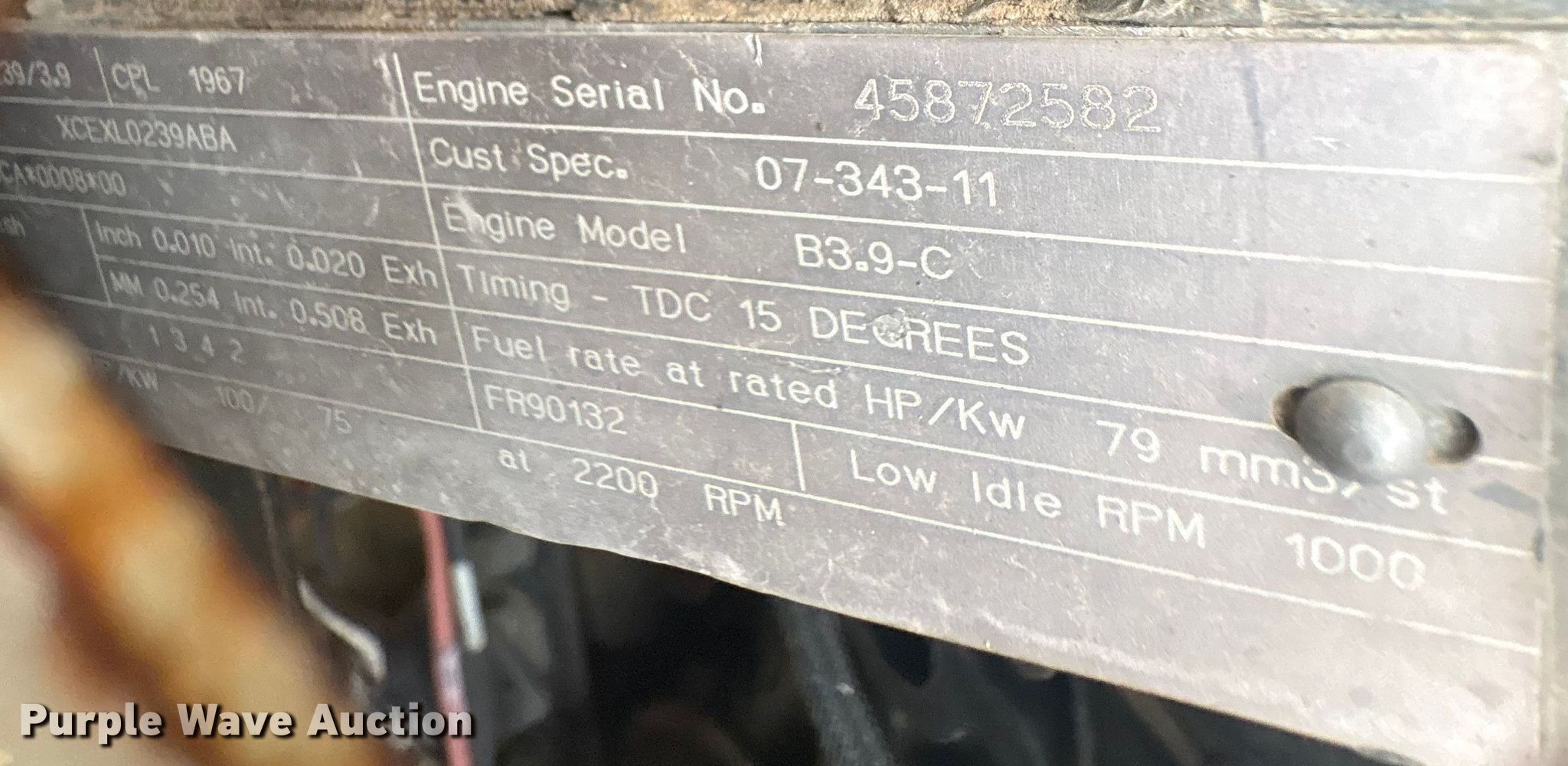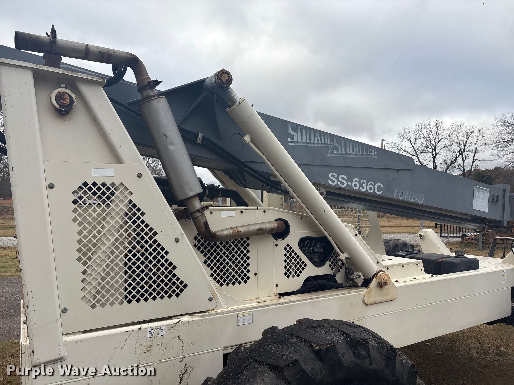 Terex SE636C telehandler. Hours: 2,356 on meter, Serial: 992547. Engine Cummins B3.9-C, Serial: 45872582, Displacement: 3.9L, Cylinders: 4, Fuel type: Diesel. Transmission Powershift, 3F - 3R, Four wheel drive. Operators station Canopy, Steering: Crab. Features Maximum lift capacity: 6,000 lbs, Maximum lift height: 36', Boom stages: 3, Fork length: 48", Tilt carriage. Tires Size: 13.00-24. Notes Additional tire and wheel, Glass cracked. Mark Brewer. Broken Arrow, OK 74014