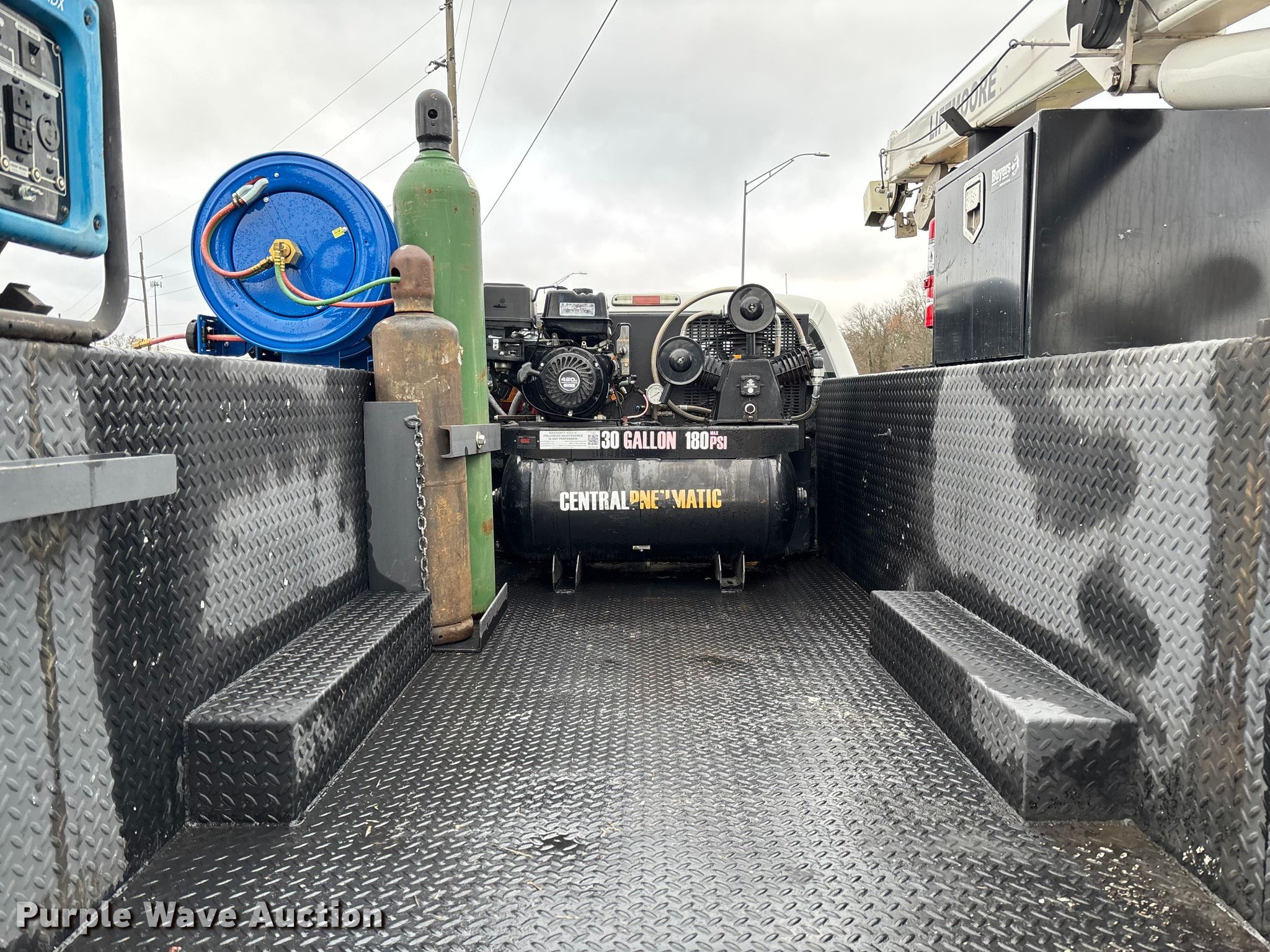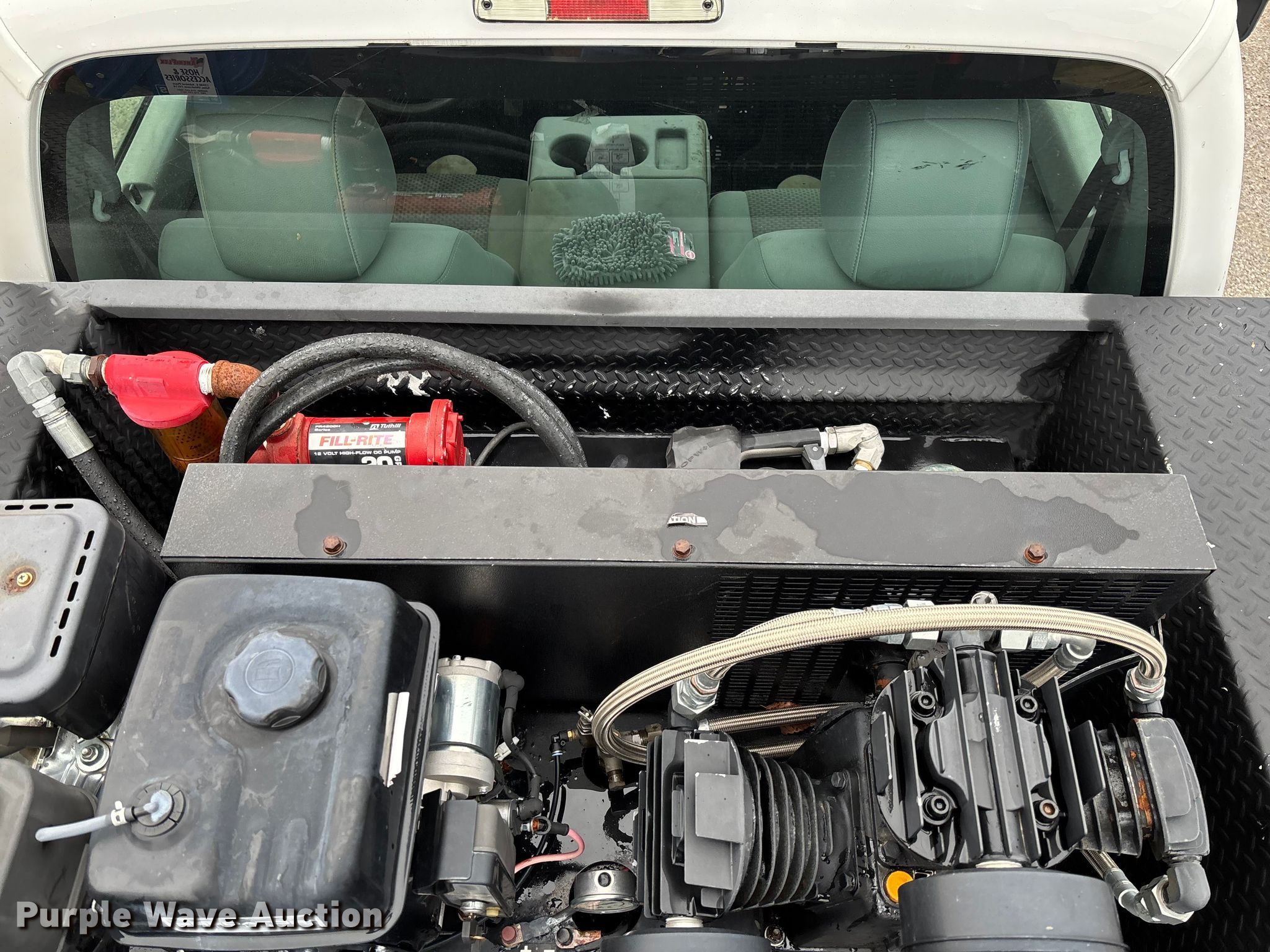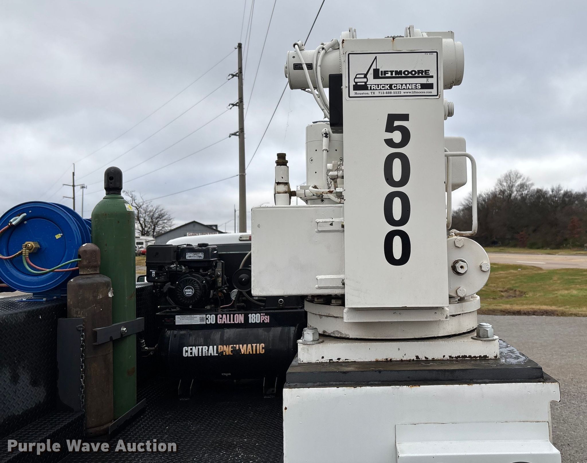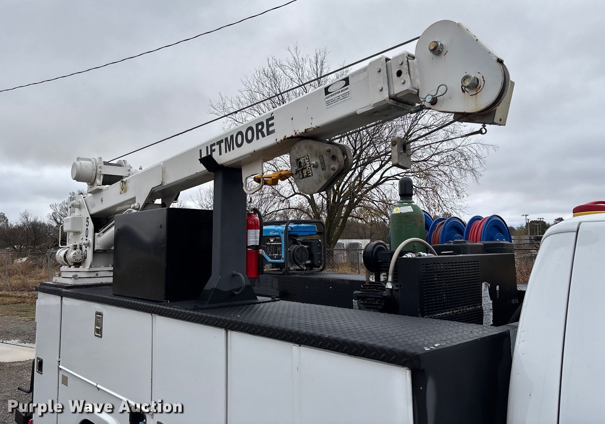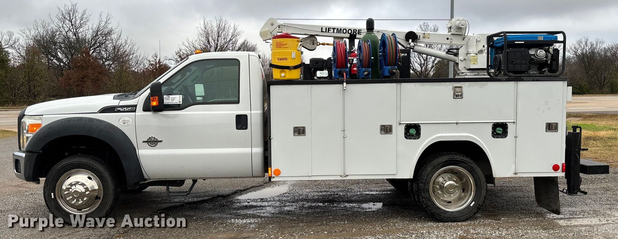 2012 Ford F550 Super Duty utility / service truck. Miles: 183,884 on odometer, Hours: 5,642 on meter, VIN: 1FDUF5HT4CEC76163. Engine Displacement: 6.7L, Cylinders: 8, Fuel type: Diesel. Transmission Automatic. Chassis Four wheel drive, Axles: Single, Suspension: Spring, Brakes: Hydraulic, GVWR: 19,500 lbs, Wheelbase: 165". Interior AC, Heat, Power windows, Power locks, Cruise control, Auxiliary controls. Features Bed Utility bed, RKI, Length: 11', Width: 7' 10", Torch bottle rack, Generator Tsurumi TPG3-6000HDX, Fuel type: Gas, 240V outlets: 2, 120V outlets: 4, Air compressor, Hours: 26 on meter Central Pneumatic, Predator, Oil/lube system Hose reels, Reservoirs, Fuel tank Nozzles, Pump, Crane Lift Moore 5000W, Maximum boom length: 20' Maximum lift capacity: 5,000 lbs.. Tires Size: 225/70R19.5. Oklahoma title. Title distribution may be delayed up to 30 days from verification of funds. Millers Southern Estates INC.. Pryor, OK 74361