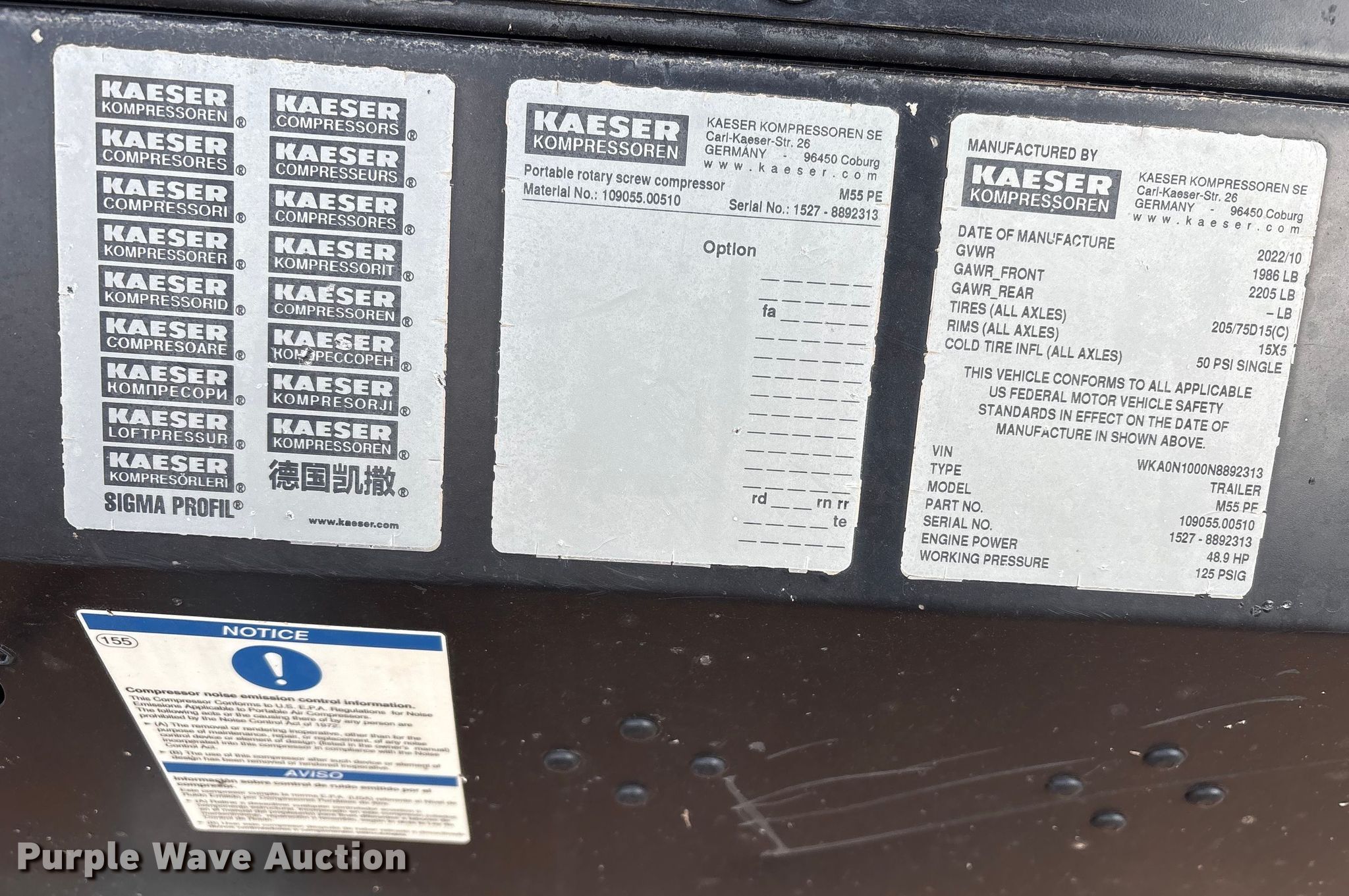 Purple Wave is selling a used Air Compressor in Texas. This item is a 2022 Kaeser Mobilair M55PE air compressor with the following: Hours: 239 on meter, VIN: WKA0N1000N8892313, Serial: 1527 - 8892313, Unit #: 143033