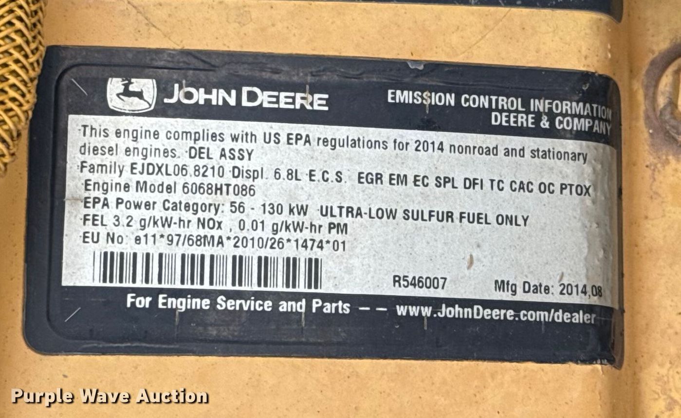 2015 John Deere 210G LC excavator. Hours: 7,537 on meter, Serial: 1PF210GXHEE522930. Engine John Deere 6068HT086, Displacement: 6.8L, Cylinders: 6, Fuel type: Diesel. Transmission Hydrostatic, Two speed travel. Operators station Enclosed cab, AC, Heat, Backup camera, Pattern changer. Features Auxiliary hydraulics, Counter weights, Removable, Boom Standard, Stick Stick length: 9' 6", Thumb: Hydraulic, Bucket Deere & Company, Width: 48", Teeth: 6. Tracks Width: 31.5", Steel, Grouser pads: Triple. Notes Owners manual. Bridgeco Contractors. Wellston, OK 74881