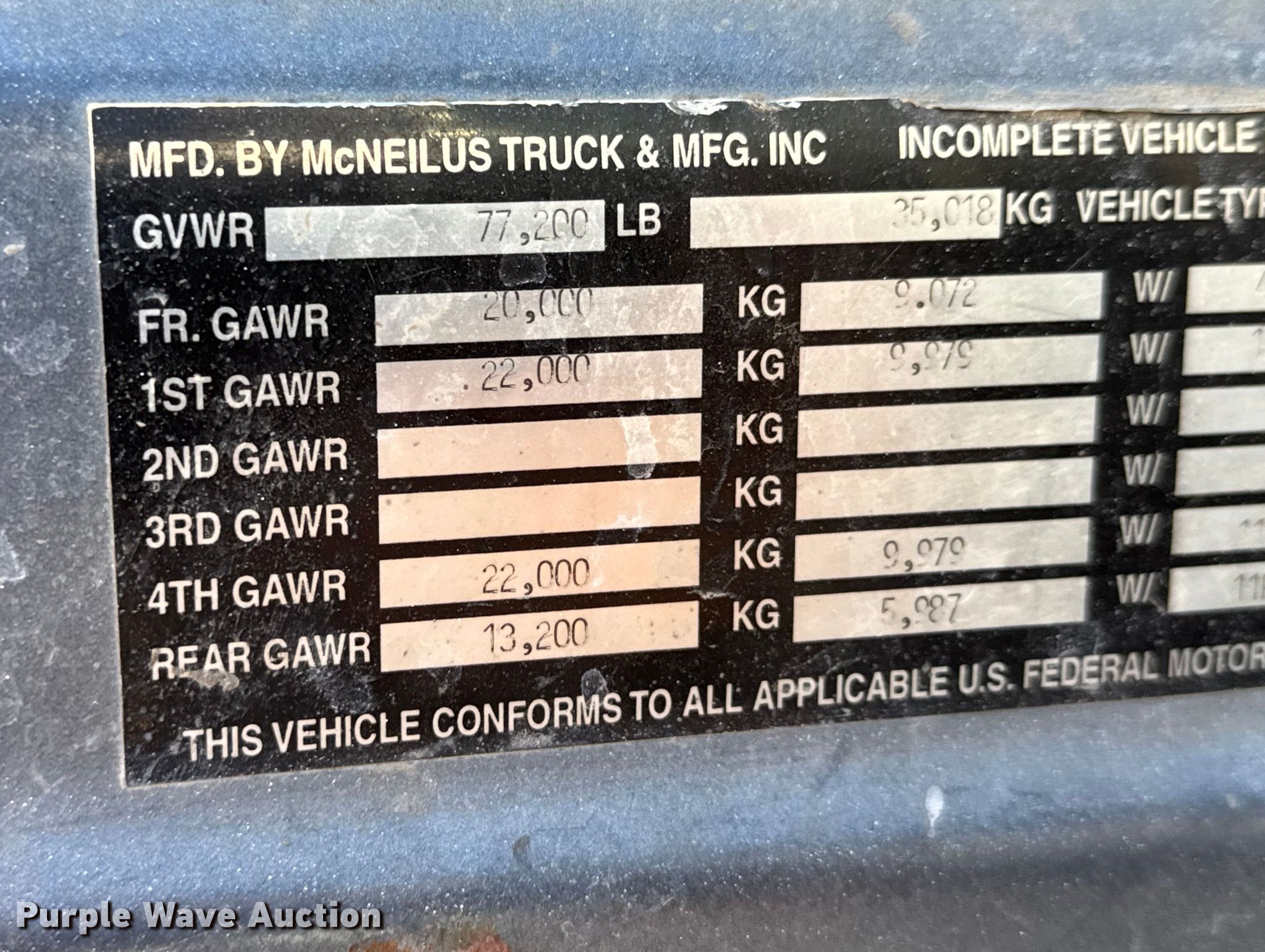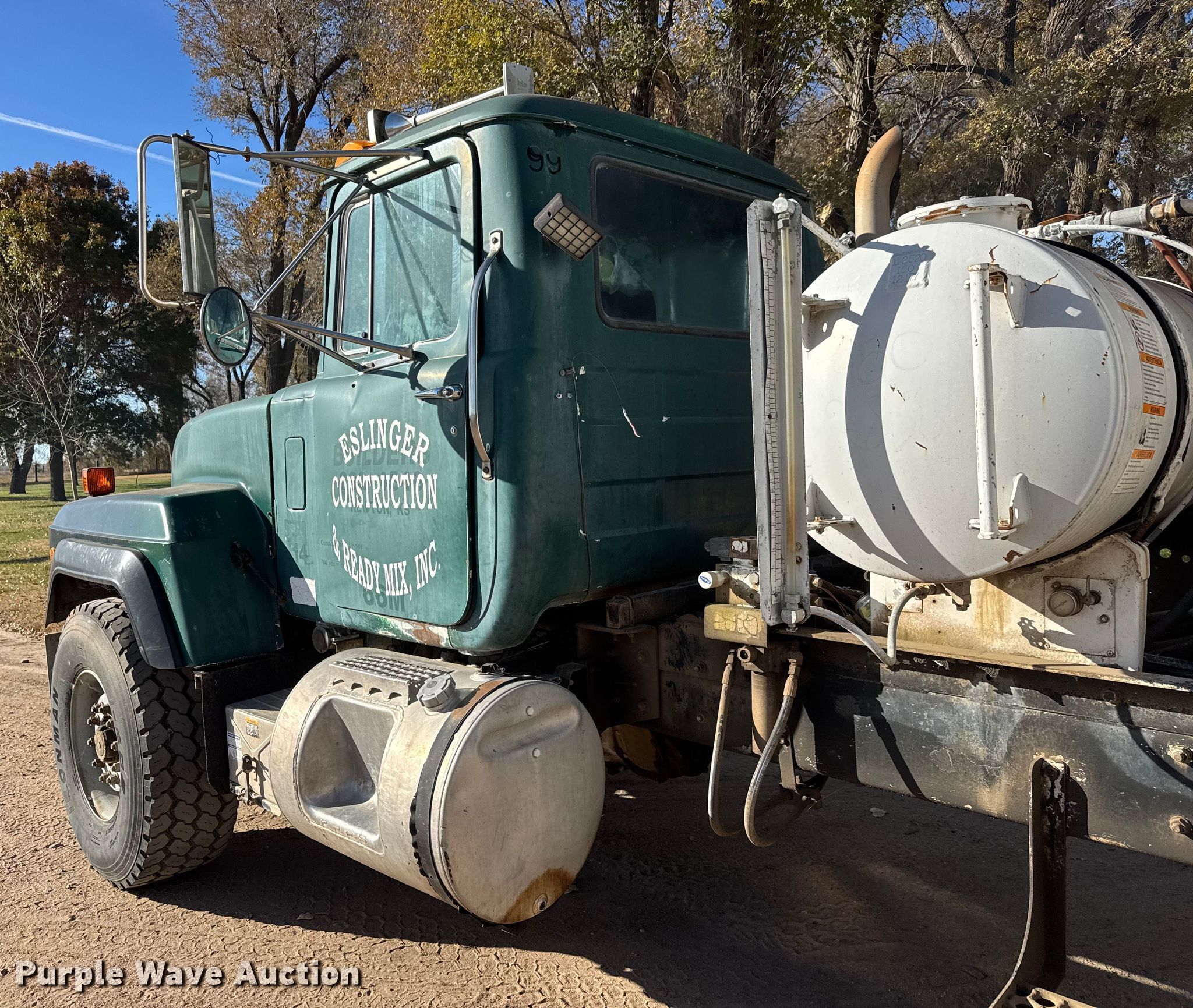 1999 Mack RD690S ready mix truck. Miles: 207,674 on odometer, Hours: 27,314 on meter, VIN: 1M2P264C6XM028190. Engine Mack EM7-300, Serial: 8Y0109, Displacement: 12.0L, Cylinders: 6, Fuel type: Diesel, HP: 300. Transmission Maxitorque T2080, Manual, Speed: 8. Chassis Axles: Triple, Tag axle Steerable, Suspension: Spring over walking beam, Brakes: Air, PTO, GVWR: 77,200 lbs. Interior AC, Heat, Cruise control. Features Mixer McNeilus, Serial: 51332-13109, Capacity: 10 cu.yd., Discharge: Rear, In-cab controls, Rear drum controls, Water tank capacity: 150 gallons, Chute Extensions: 3, Chute type: Steel.. Tires Front: 425/65R22.5, Rear: 11R22.5. Notes Rear right tire air leak, Intermittent tag axle issues. Kansas non-highway no liability insurance title. Title distribution may be delayed up to 14 days from verification of funds. Edward Eslinger Estate and Eslinger Construction and Redi Mix, LLC. Kinsley, KS 67547