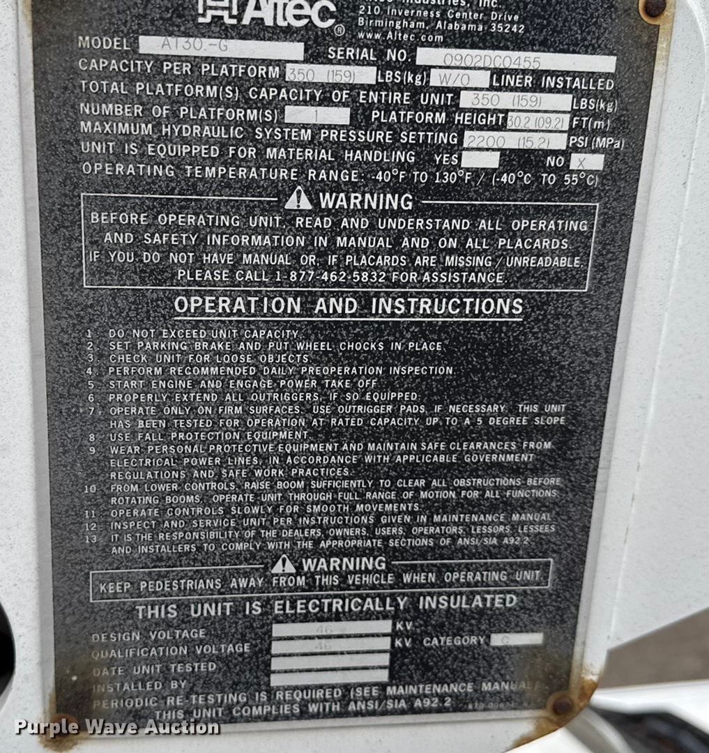 2003 Ford F550 bucket truck. Miles: 110,844 on odometer, VIN: 1FDAF56F33EA36196. Engine Displacement: 7.3L, Cylinders: 8, Fuel type: Diesel. Transmission Automatic. Chassis Axles: Single, Suspension: Spring, Brakes: Hydraulic, PTO, GVWR: 17,500 lbs. Interior AC, Heat. Features Bed Utility bed, Alec, Serial: 57-16090, Length: 102", Width: 93", Height: 24", Boom Alec AT30-G, Serial: 0902DC0455, Boom length: 14', Mast height: 4', Maximum lift capacity: 350 lbs, Maximum lift height: 30', Boom type: Articulating, Insulated, Telescopic, Man basket, Boom controls Ground, Platform/ basket.. Tires Size: 226/70R19.5. Notes Dash warning indicator: Check engine, Brake, Jump start required during on-site data collection, Transmission issues, will not go into park , PTO issues, does not engage, Non-operational hydraulic functions. Kentucky title. Seller is a government entity who will be assigning and distributing the title. Please contact the seller for distribution questions. Title distribution may be delayed up to 14 days from verification of funds. Lebanon, KY 40033
