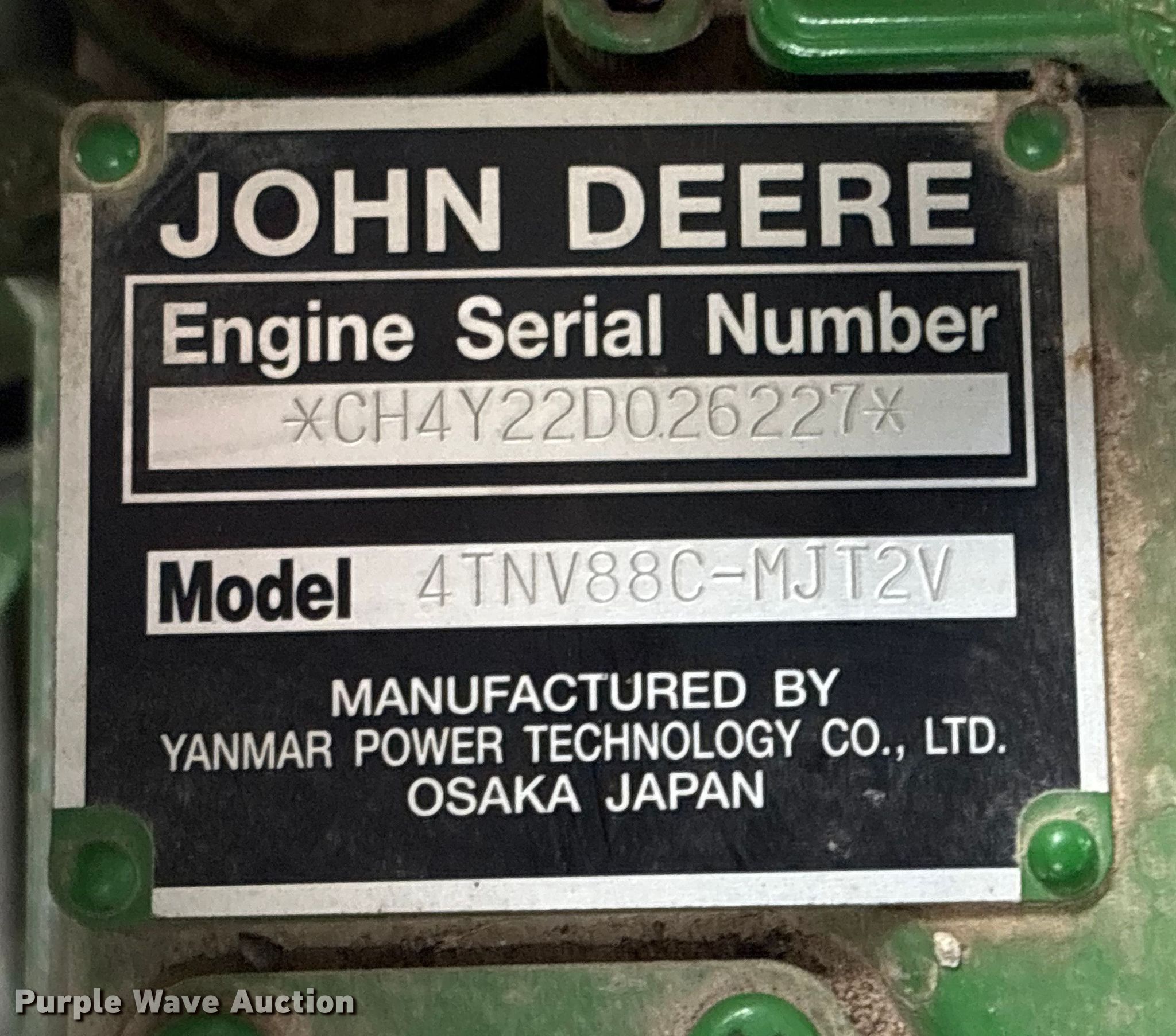 2024 John Deere 4044M MFWD tractor. Hours: 136 on meter, Serial: 1LV4044MJPR122766, Unit #: 91887225. Engine Yanmar 4NNMAC, Serial: CH4Y22D026227, Displacement: 2.190L, Cylinders: 4, Fuel type: Diesel. Transmission Hydrostatic, 3F - 3R. Chassis Differential lock. Features PTO: 540, Three point Top link, Loader John Deere 400E, Controls: Joystick, Bucket Width: 75".. Tires Front: 8-16, Rear: 13.6-28. Notes Key not included, Non-operational transmission , Loader frame damaged, bent. Insurance salvage, stored at a secured facility. Please review REQUIRED REMOVAL INSTRUCTIONS. Insurance Salvage. 4763 Lott Road. Eight Mile, AL 36613