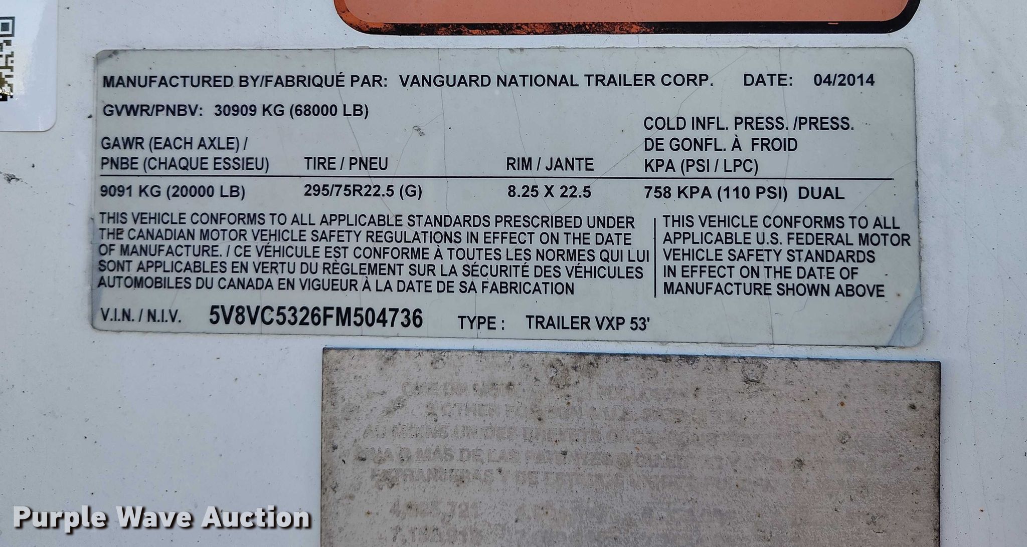 2015 Vanguard VXP 53' dry van trailer. VIN: 5V8VC5326FM504736. Dimensions Overall Length: 53', Width: 102". Features Deck type: Wood, E-track rail system. Chassis Landing gear: Dual, Suspension: Air, Brakes: Air, Axles: Tandem Sliding, GVWR: 68,000 lbs, GAWR: 20,000 lbs. Tires Steel wheels, Size: 295/75R22.5. Oklahoma title. Title distribution may be delayed up to 14 days from verification of funds. Voyager Express Inc. Denver, CO 80221