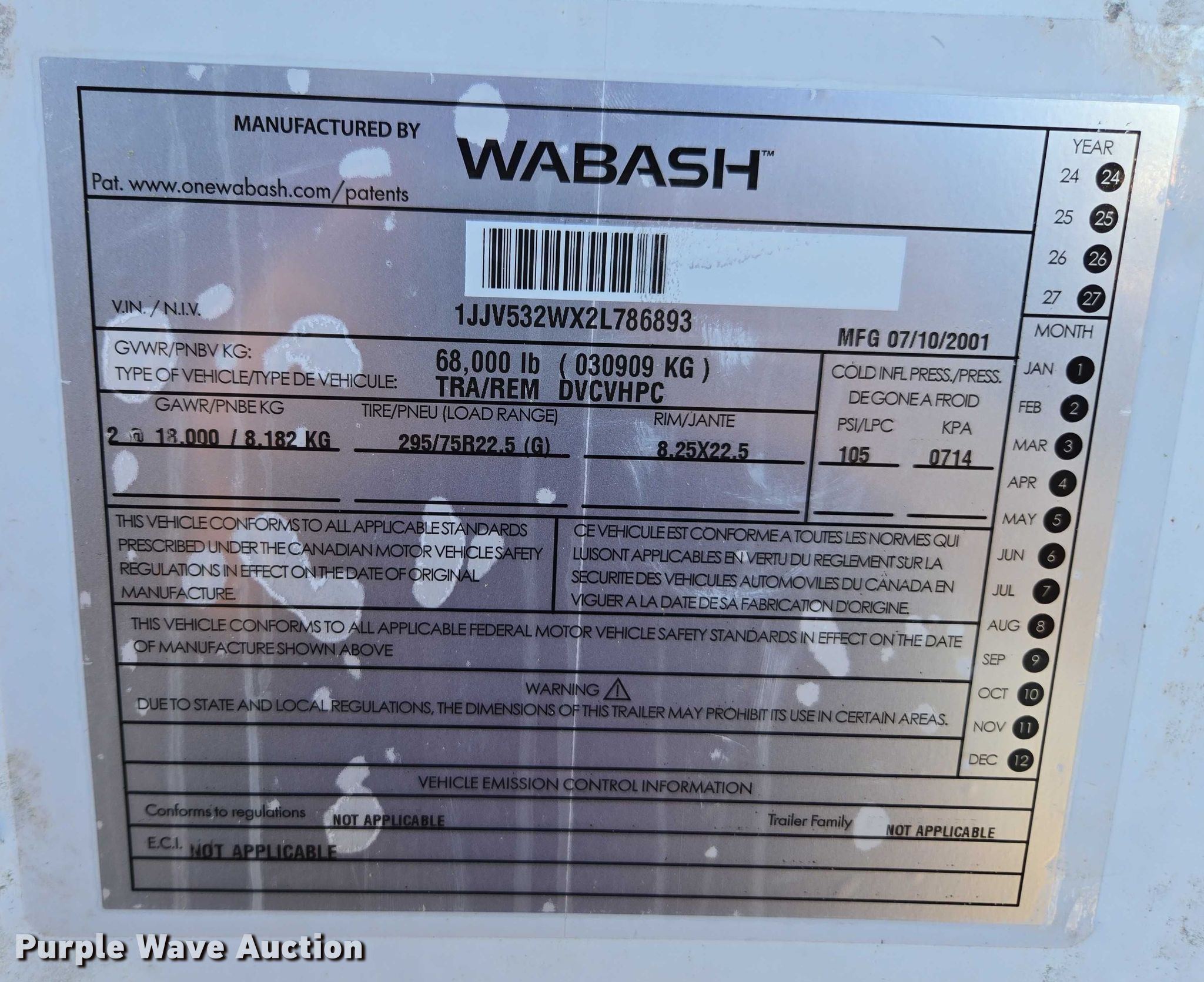 2002 Wabash dry van trailer. VIN: 1JJV532WX2L786893. Dimensions Overall Length: 53', Width: 102". Features Deck type: Wood. Chassis Landing gear: Dual, Suspension: Air, Brakes: Air, Axles: Tandem Sliding, GVWR: 68,000 lbs. Tires Steel wheels, Size: 295/75R22.5. Florida title. Title distribution may be delayed up to 14 days from verification of funds. Webb's Towing. Haines City, FL 33844