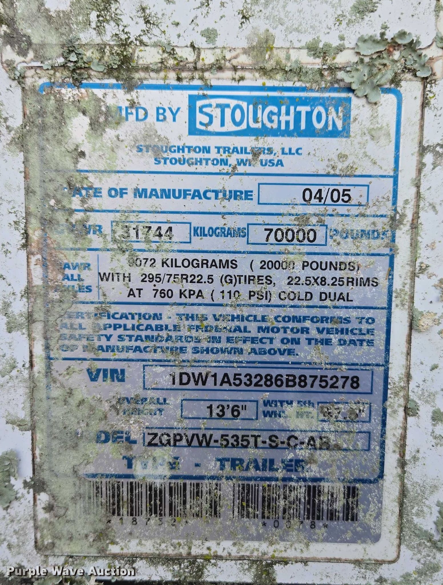 2006 Stoughton dry van trailer. VIN: 1DW1A53286B875278. Dimensions Overall Length: 53', Width: 102". Features Deck type: Wood. Chassis Landing gear: Dual, Suspension: Air, Brakes: Air, Axles: Tandem Sliding, GVWR: 70,000 lbs. Tires Steel wheels, Size: 295/75R22.5. Notes Tire missing. Florida title. Title distribution may be delayed up to 14 days from verification of funds. Webb's Towing. Haines City, FL 33844